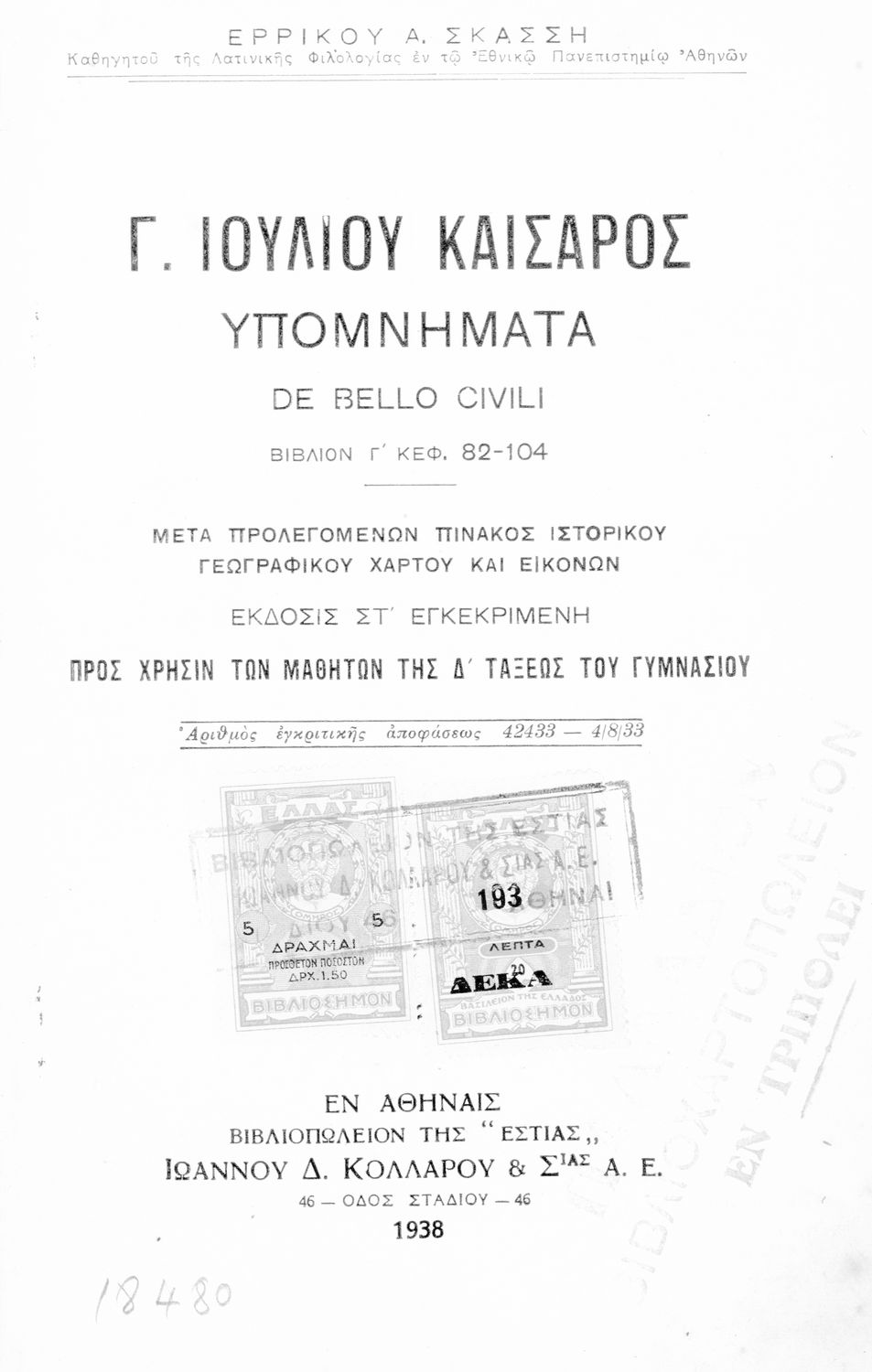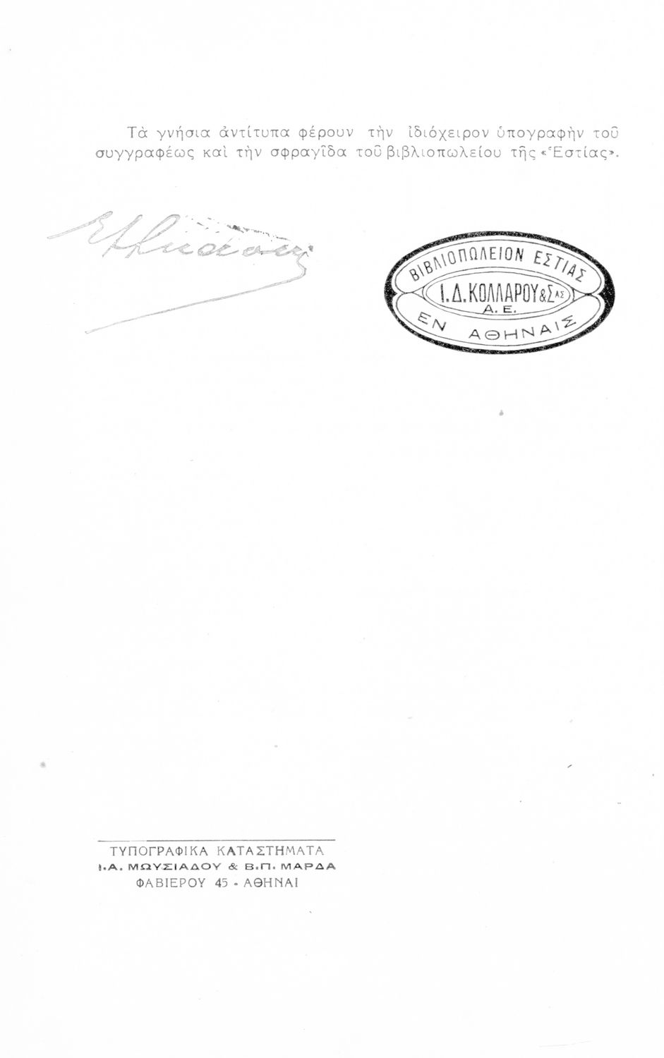 Εκδότης: Ιωάννης Δ. Κολλάρος Έτος έκδοσης: 1938 Τόπος έκδοσης: Αθήνα Έκδοση: 6η Υπουργική απόφαση / Σύμβαση: 42433/4-8-1933 Έτος έγκρισης: 1933 |