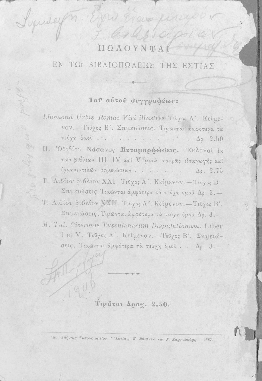 Σχολικό εγχειρίδιο Λατινικών Α΄, Β΄, Γ' Γυμνασίου που περιλαμβάνει γραμματική και συντακτικό και είναι χωρισμένο σε φθογγολογικό, τυπολογικό και ετυμολογικό μέρος.
