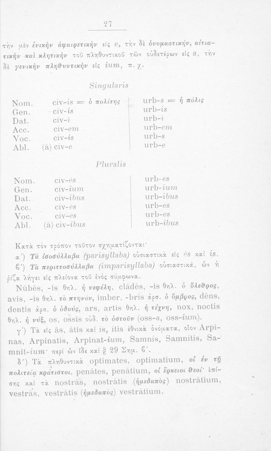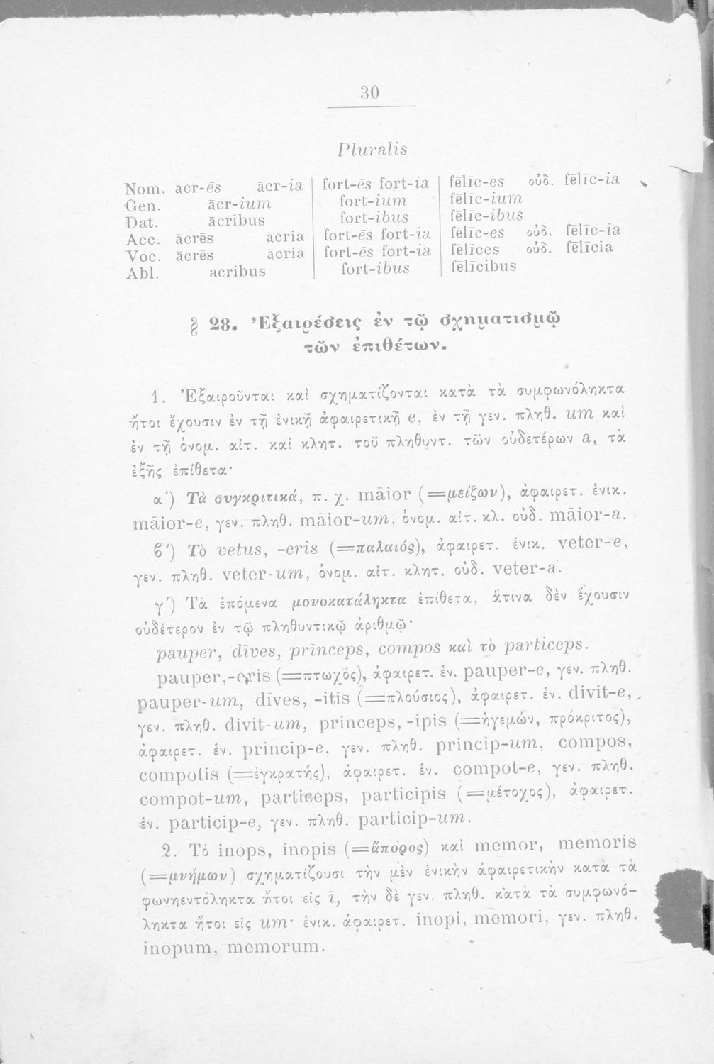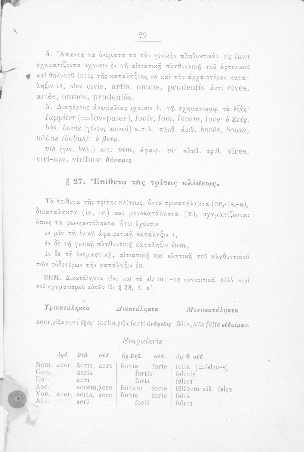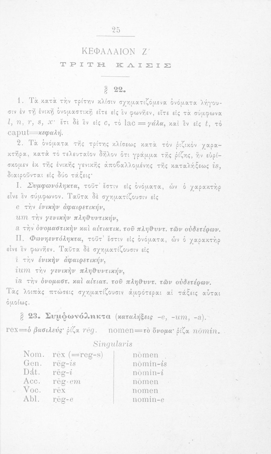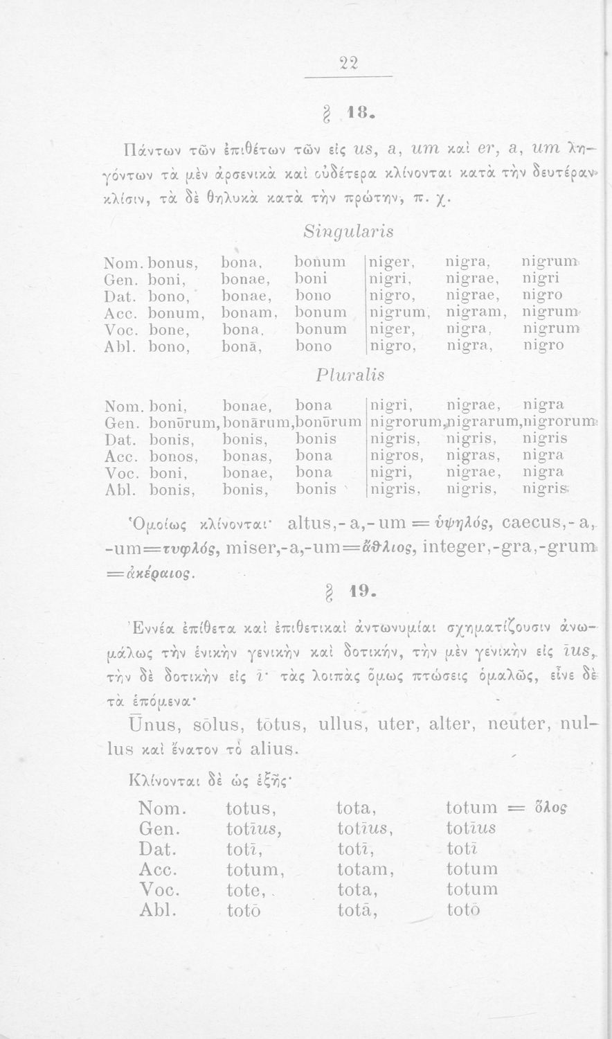 Σχολικό εγχειρίδιο Λατινικών που περιλαμβάνει τη γραμματική της λατινικής και είναι χωρισμένο στο τεχνολογικό, το τυπολογικό και το ετυμολογικό μέρος.