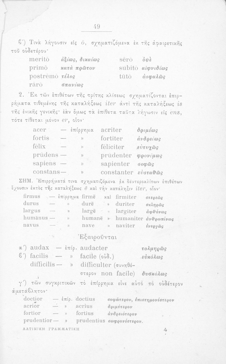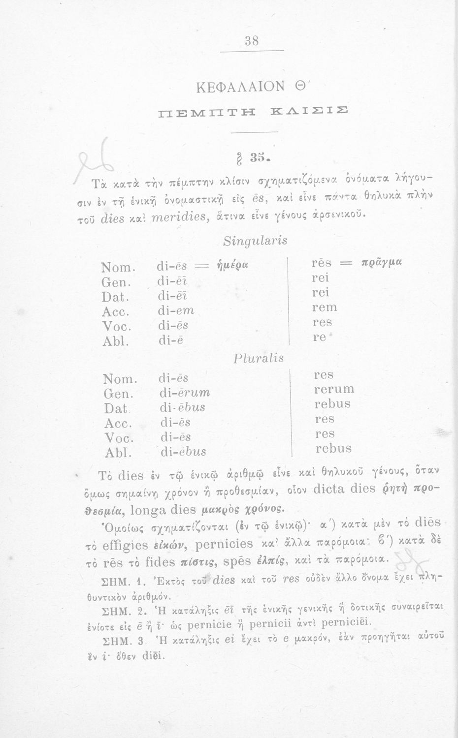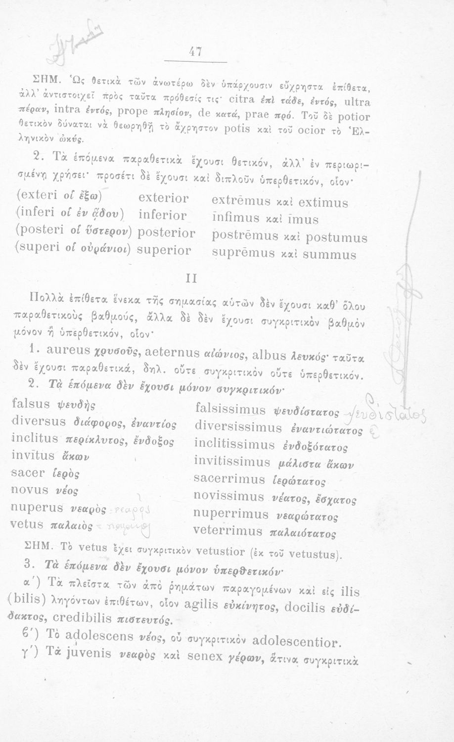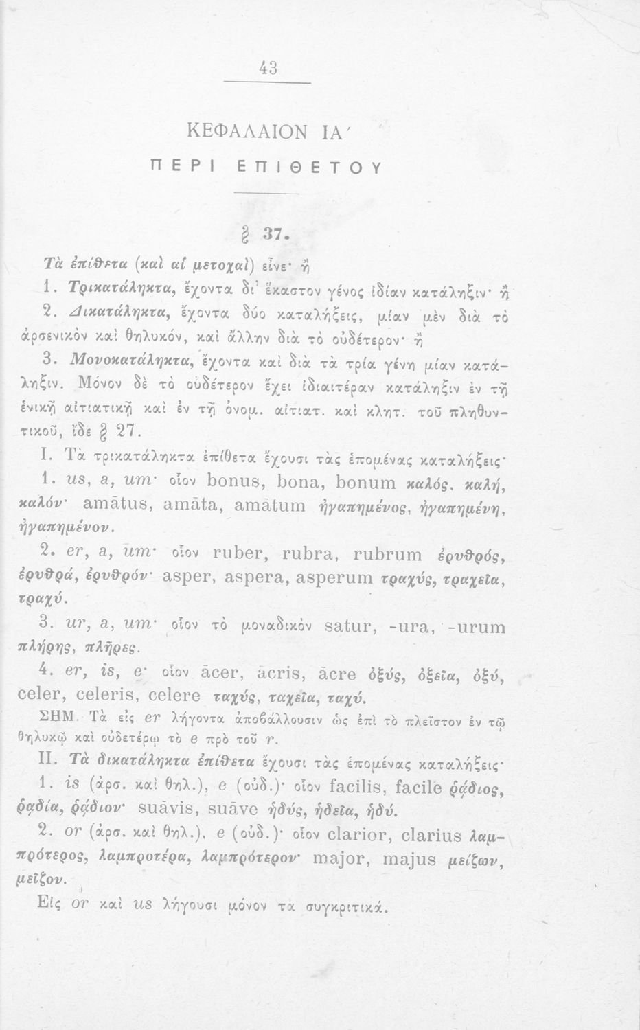 Σχολικό εγχειρίδιο Λατινικών που περιλαμβάνει τη γραμματική της λατινικής και είναι χωρισμένο στο τεχνολογικό, το τυπολογικό και το ετυμολογικό μέρος.