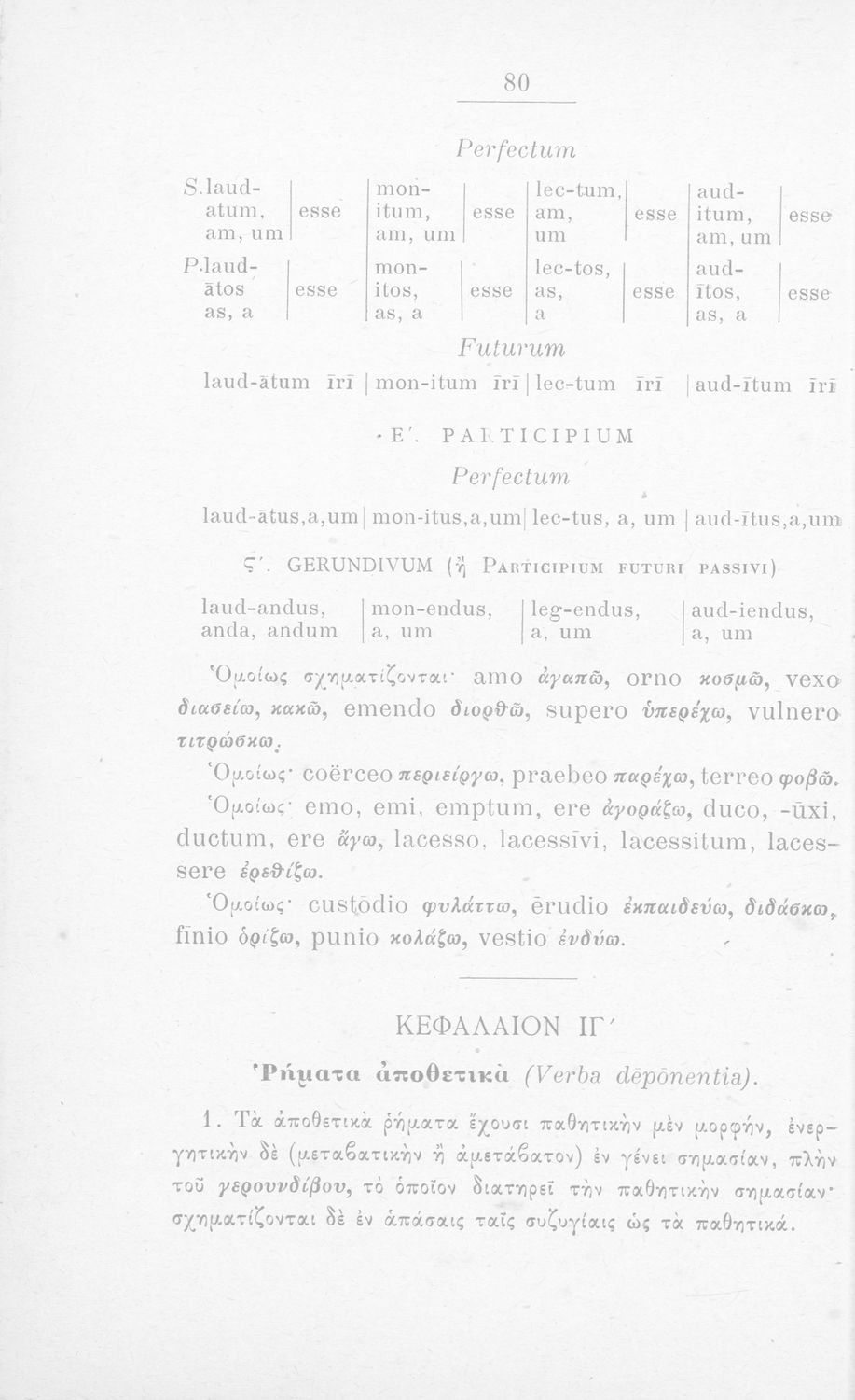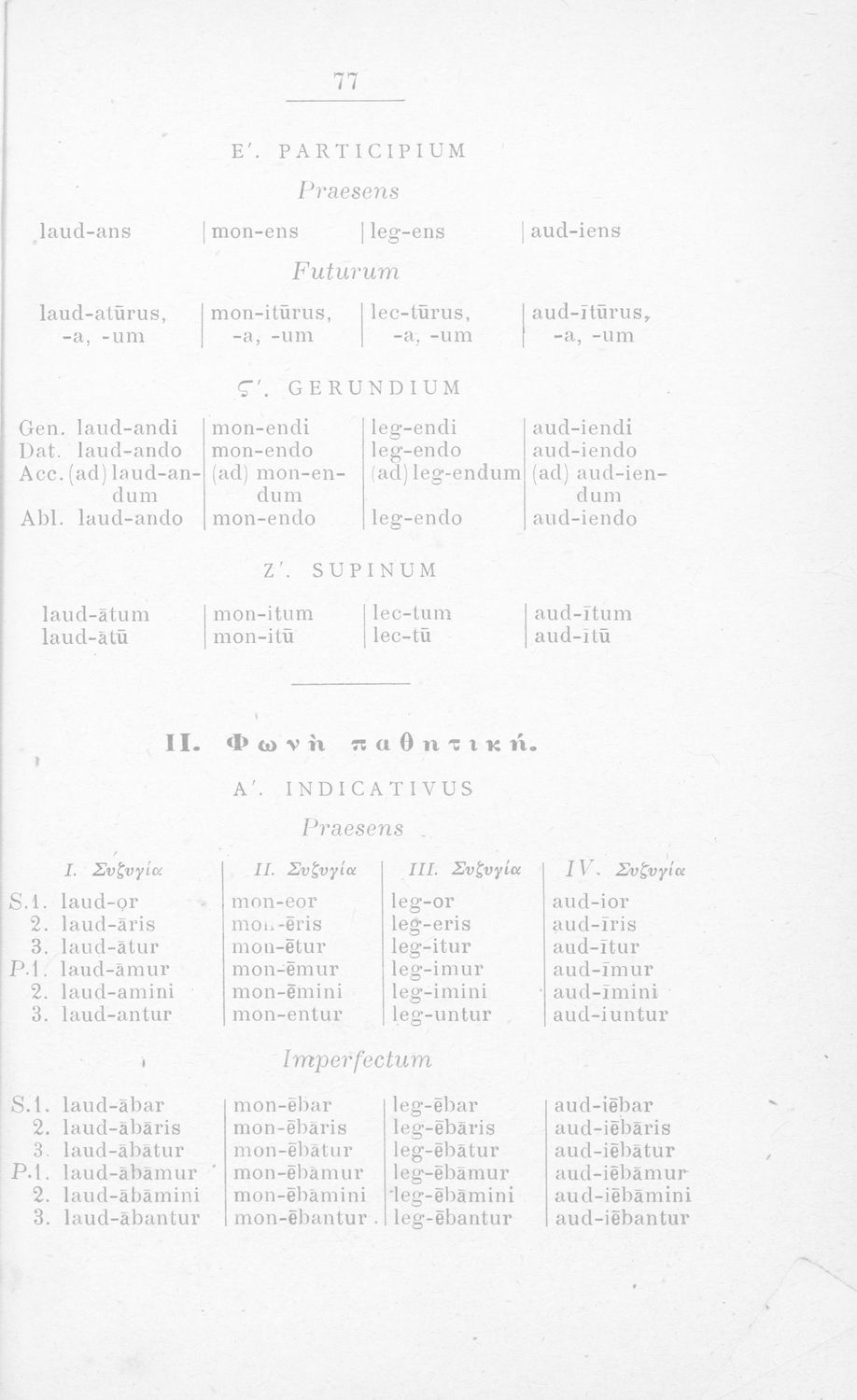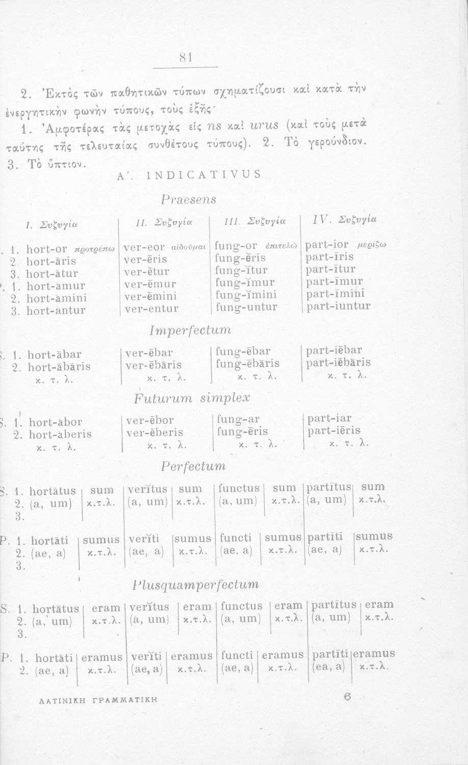 Σχολικό εγχειρίδιο Λατινικών Α΄, Β΄, Γ' Γυμνασίου που περιλαμβάνει γραμματική και συντακτικό και είναι χωρισμένο σε φθογγολογικό, τυπολογικό και ετυμολογικό μέρος.