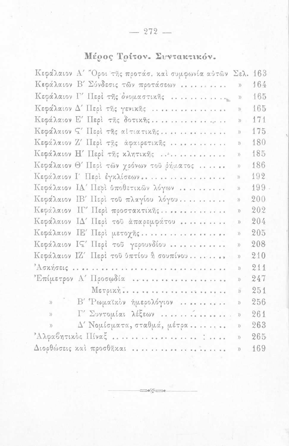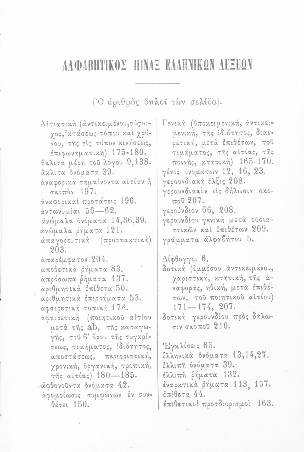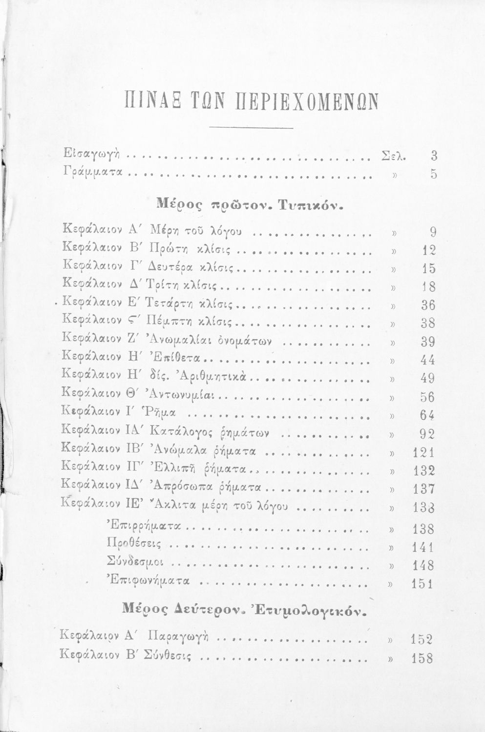 Σχολικό εγχειρίδιο Αρχαίων Ελληνικών για τα Ελληνικά Σχολεία, Παρθεναγωγεία και Γυμνάσια που περιέχει τους κανόνες γραμματικής και είναι χωρισμένο σε φθογγολογικό, τυπολογικό και ετυμολογικό μέρος.