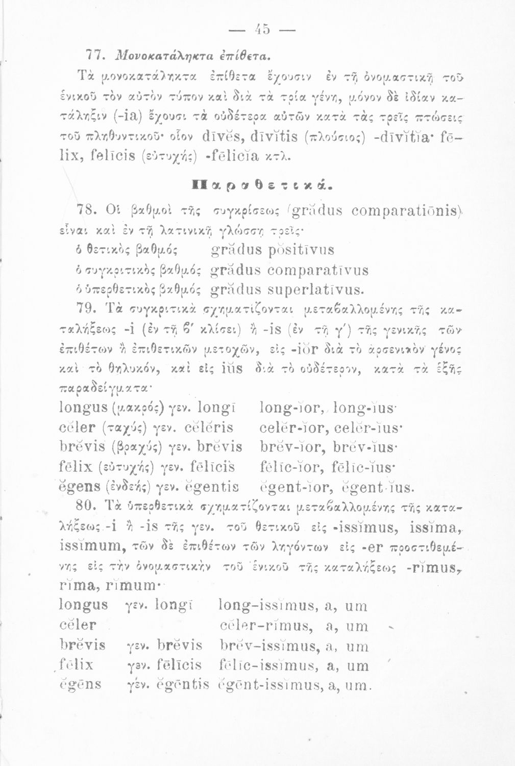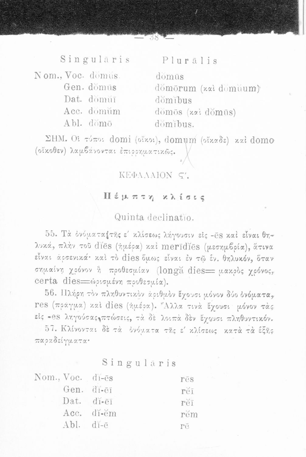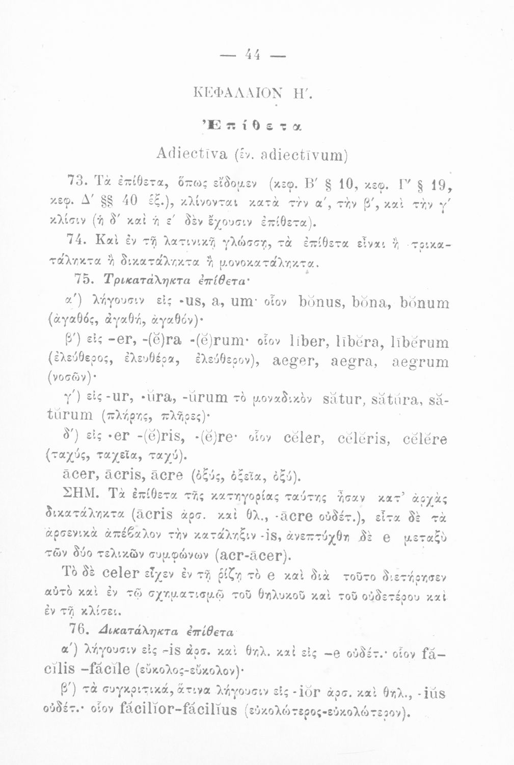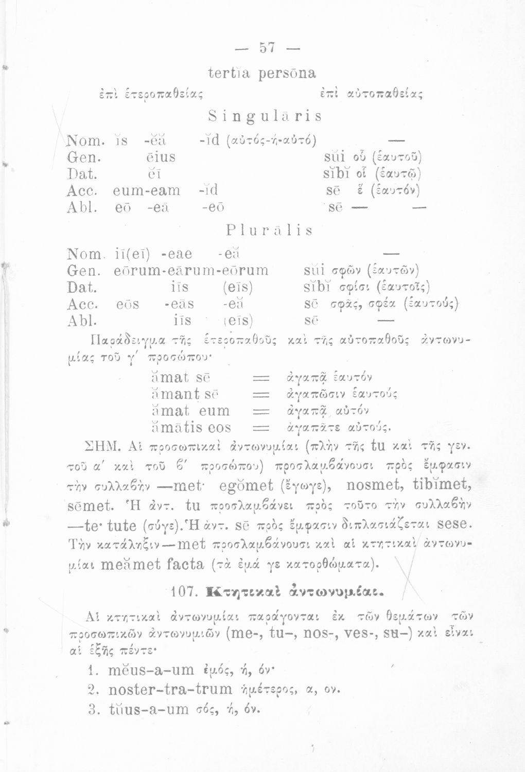 Σχολικό εγχειρίδιο Λατινικών Α΄, Β΄, Γ' Γυμνασίου που περιλαμβάνει γραμματική και συντακτικό και είναι χωρισμένο σε φθογγολογικό, τυπολογικό και ετυμολογικό μέρος.
