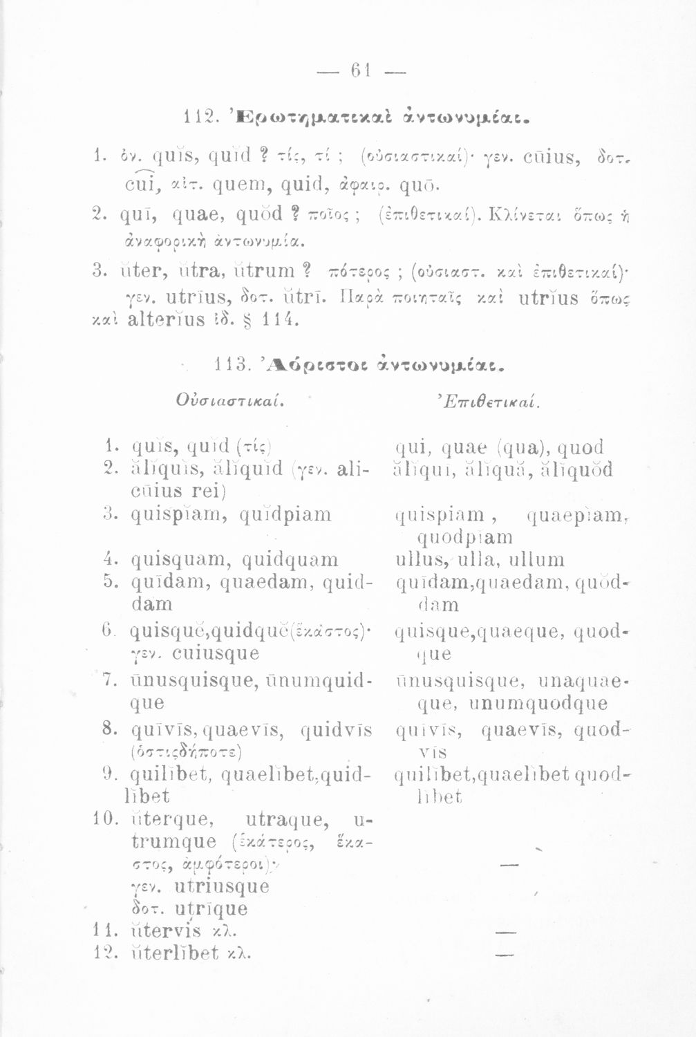 Παρουσίαση περιεχομένου: Σχολικό εγχειρίδιο Λατινικών Γυμνασίου που περιλαμβάνει γραμματική και συντακτικό και είναι χωρισμένο σε φθογγολογικό, τυπολογικό και ετυμολογικό μέρος. Ο συγγραφέας ήταν καθηγητής της Λατινικής Φιλολογίας στο Εθνικό Πανεπιστήμιο.