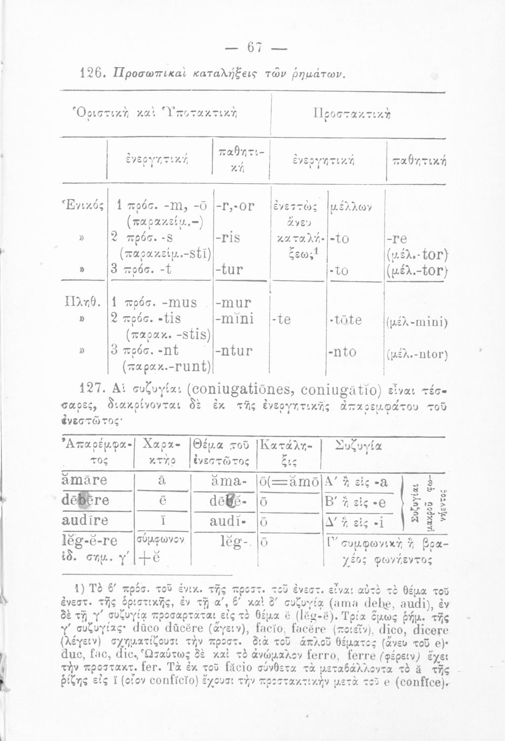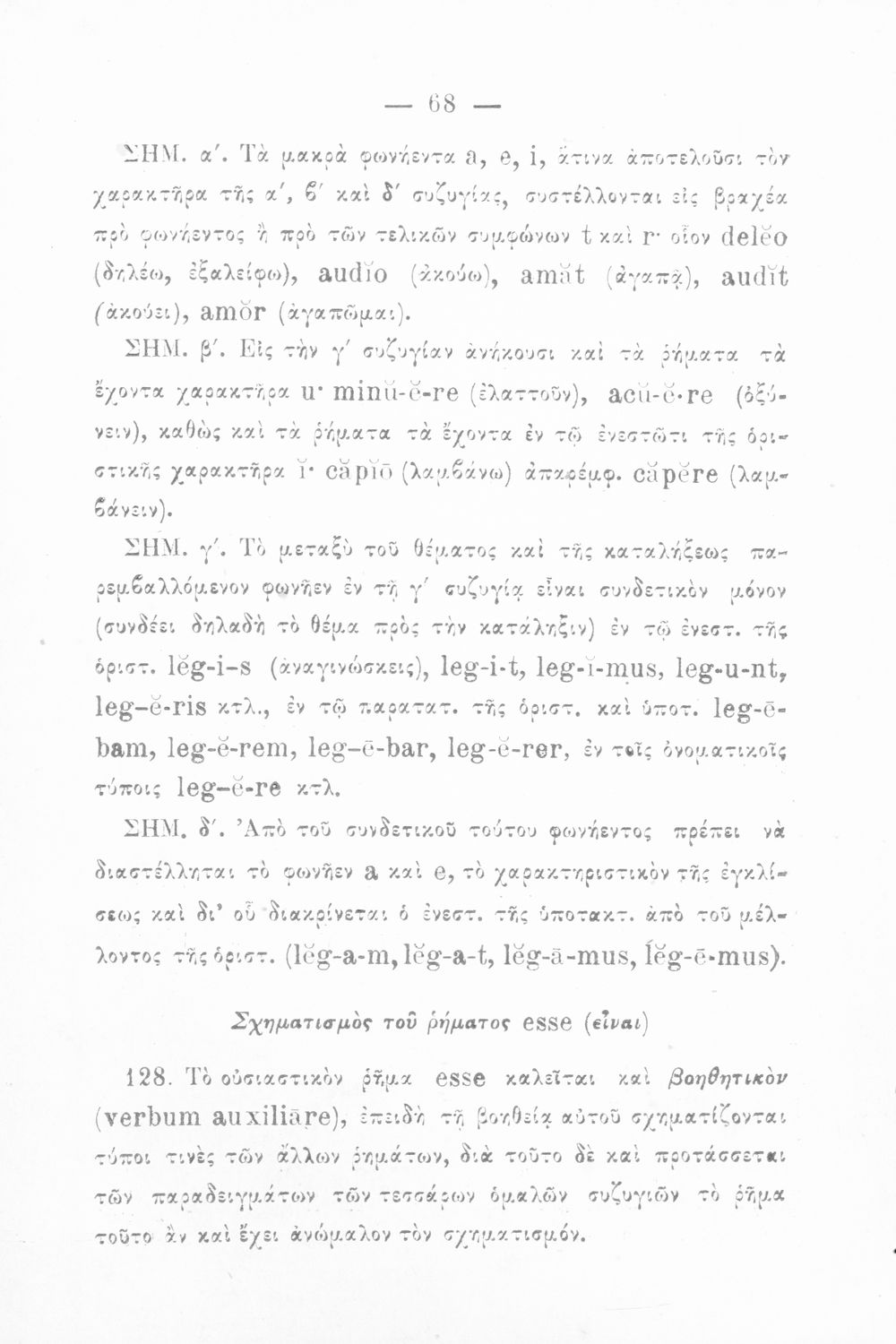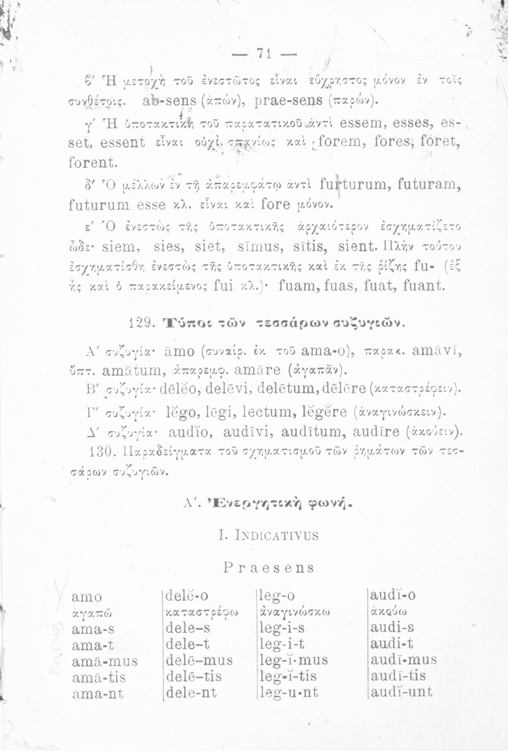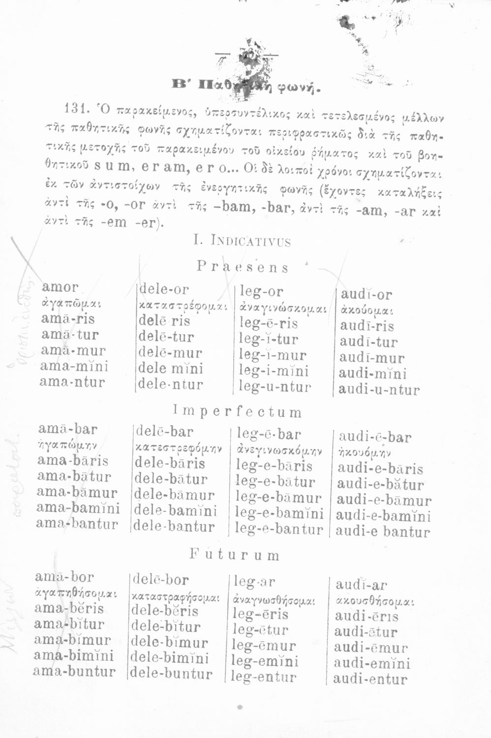 Σχολικό εγχειρίδιο Λατινικών Α΄, Β΄, Γ' Γυμνασίου που περιλαμβάνει γραμματική και συντακτικό και είναι χωρισμένο σε φθογγολογικό, τυπολογικό και ετυμολογικό μέρος.