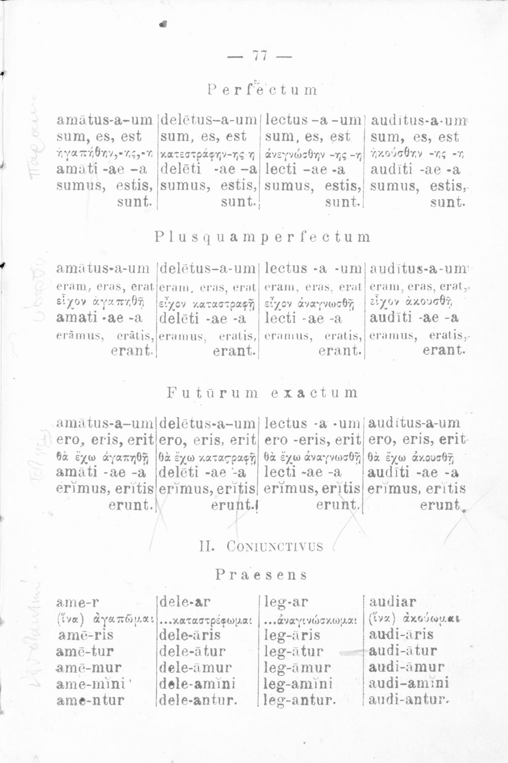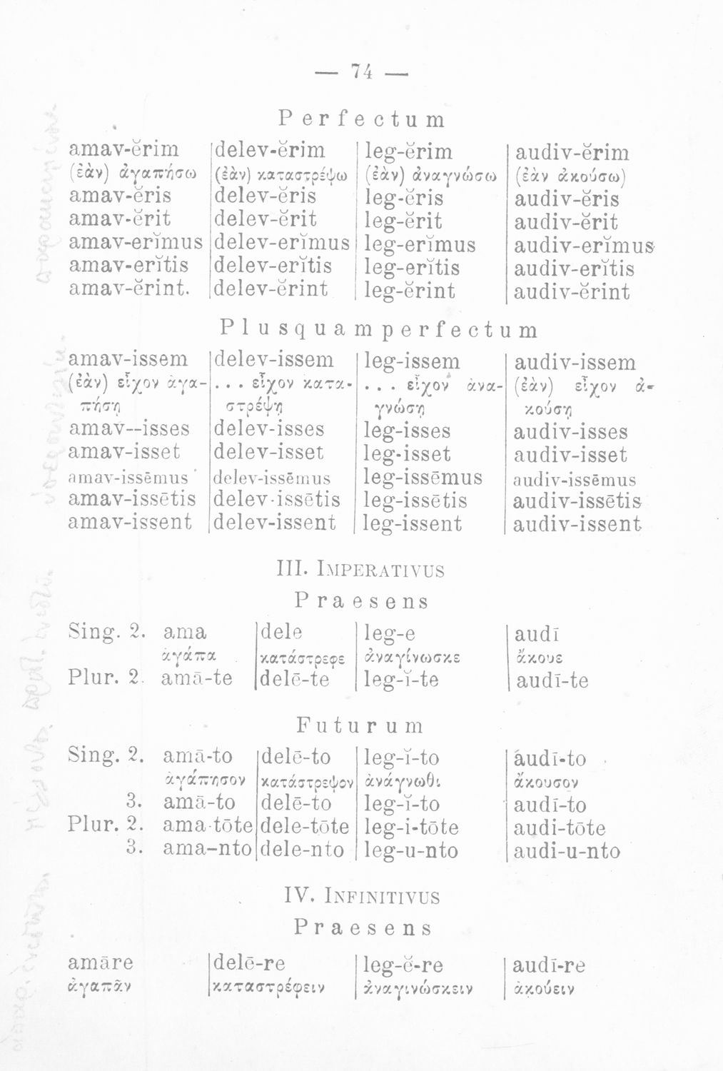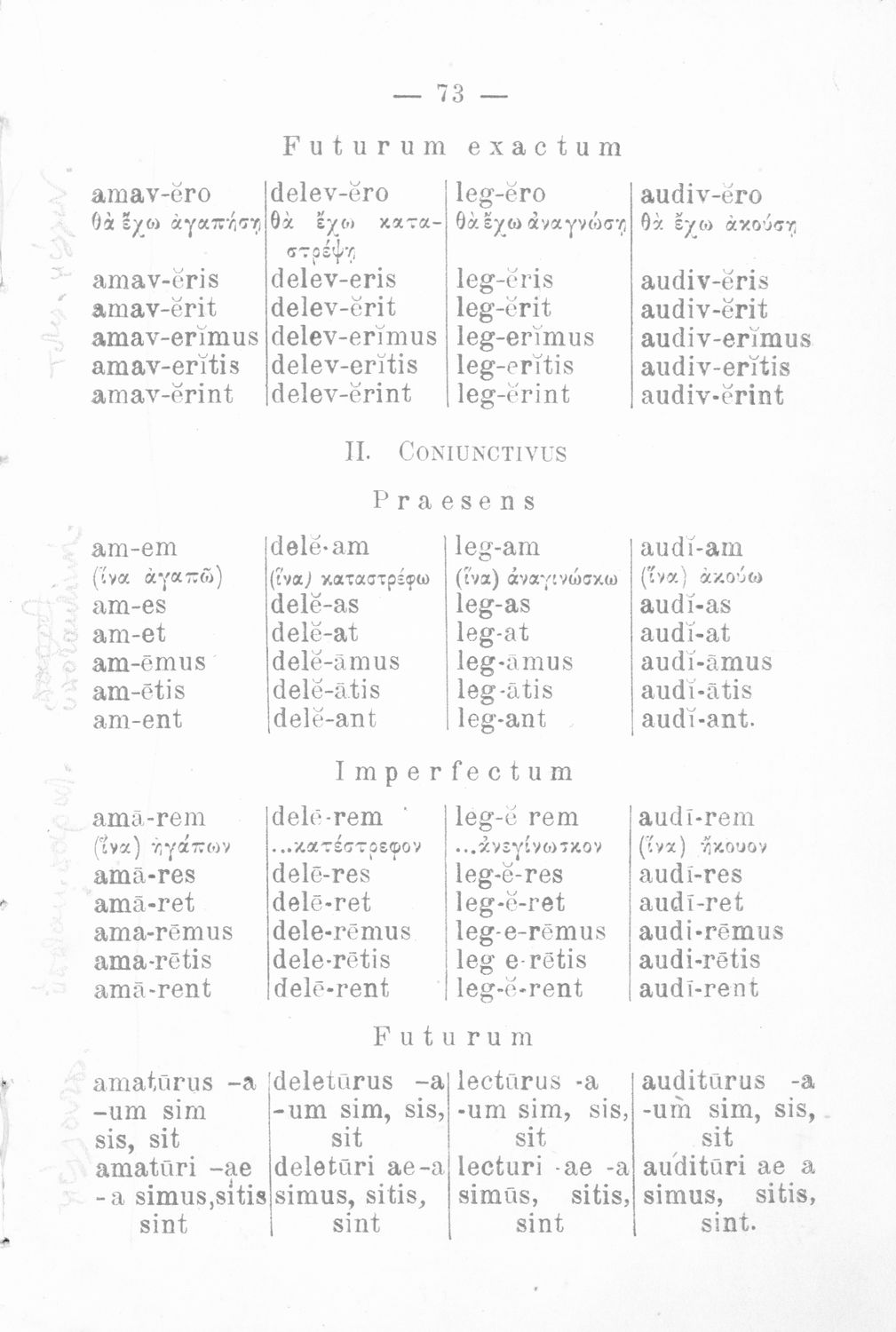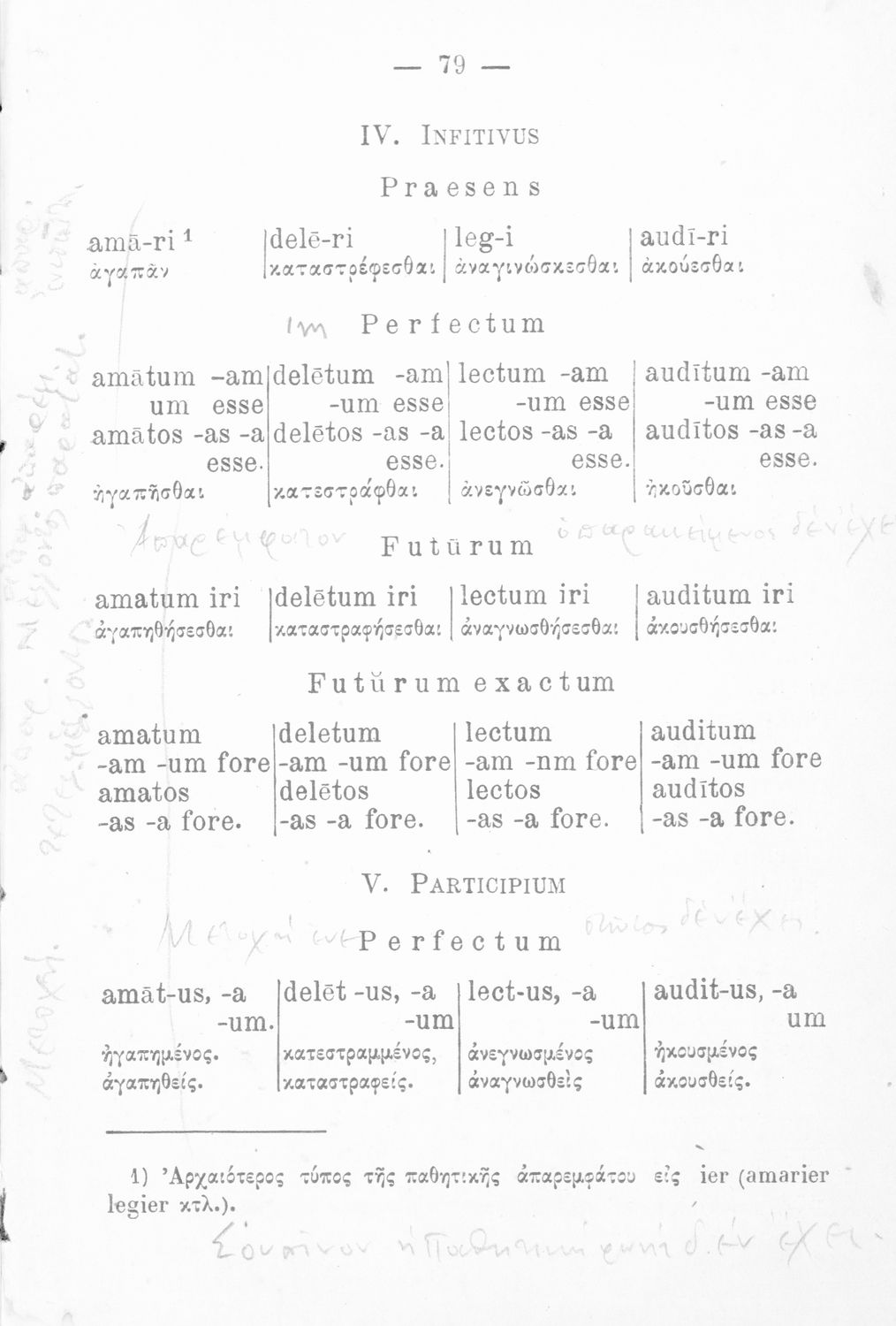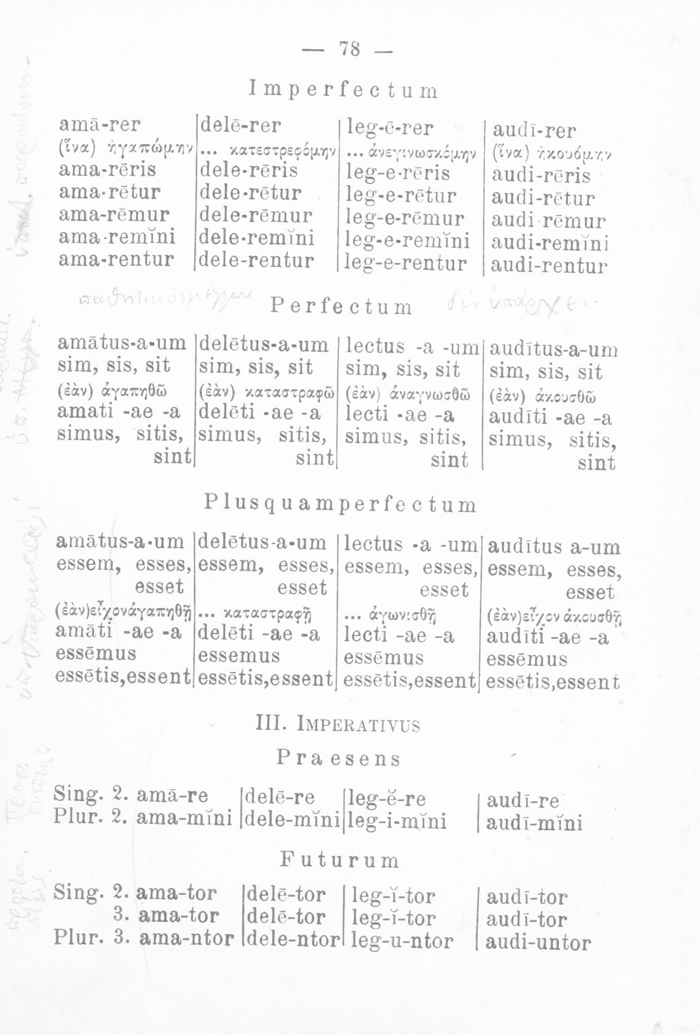 Σχολικό εγχειρίδιο Λατινικών Α΄, Β΄, Γ' Γυμνασίου που περιλαμβάνει γραμματική και συντακτικό και είναι χωρισμένο σε φθογγολογικό, τυπολογικό και ετυμολογικό μέρος.