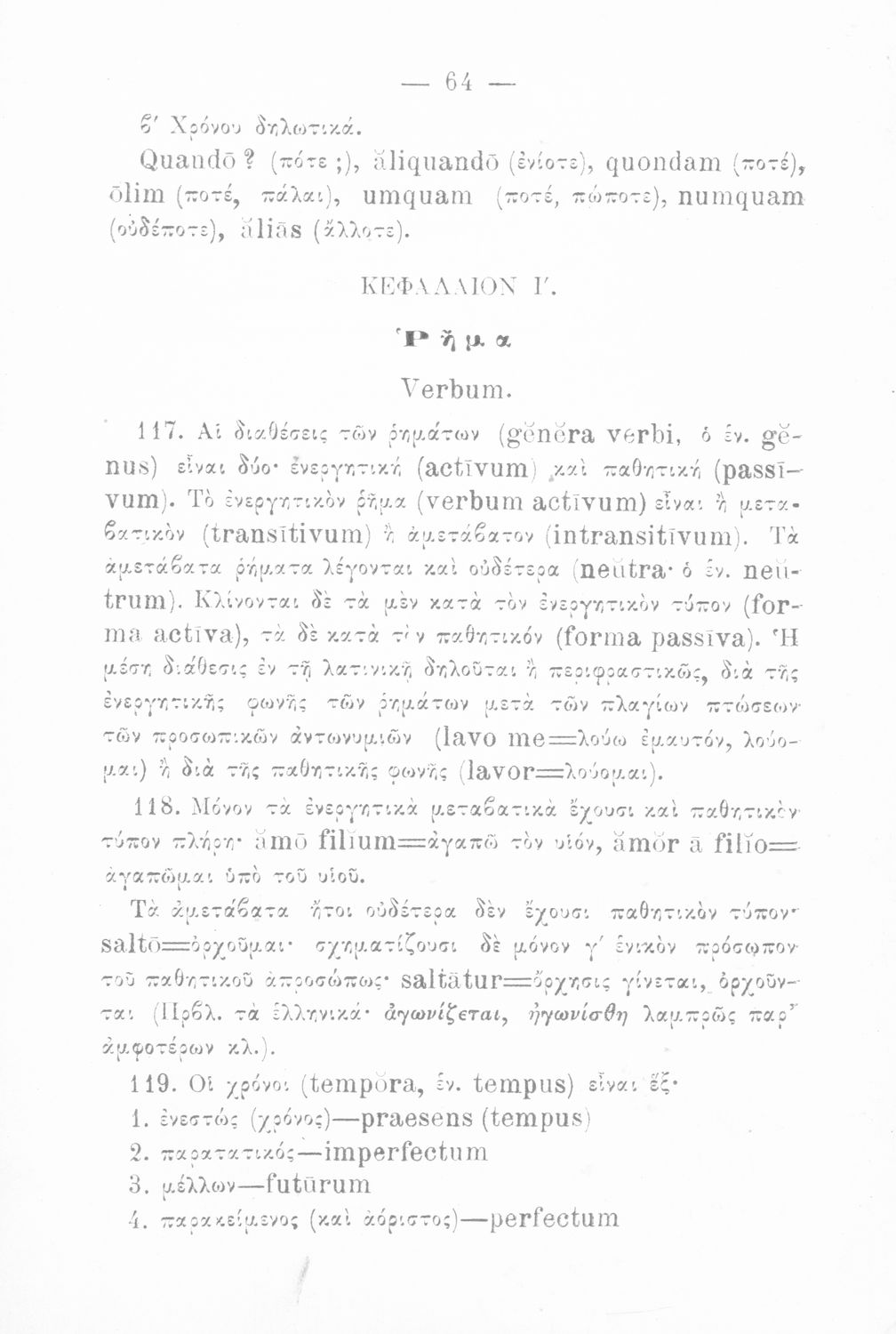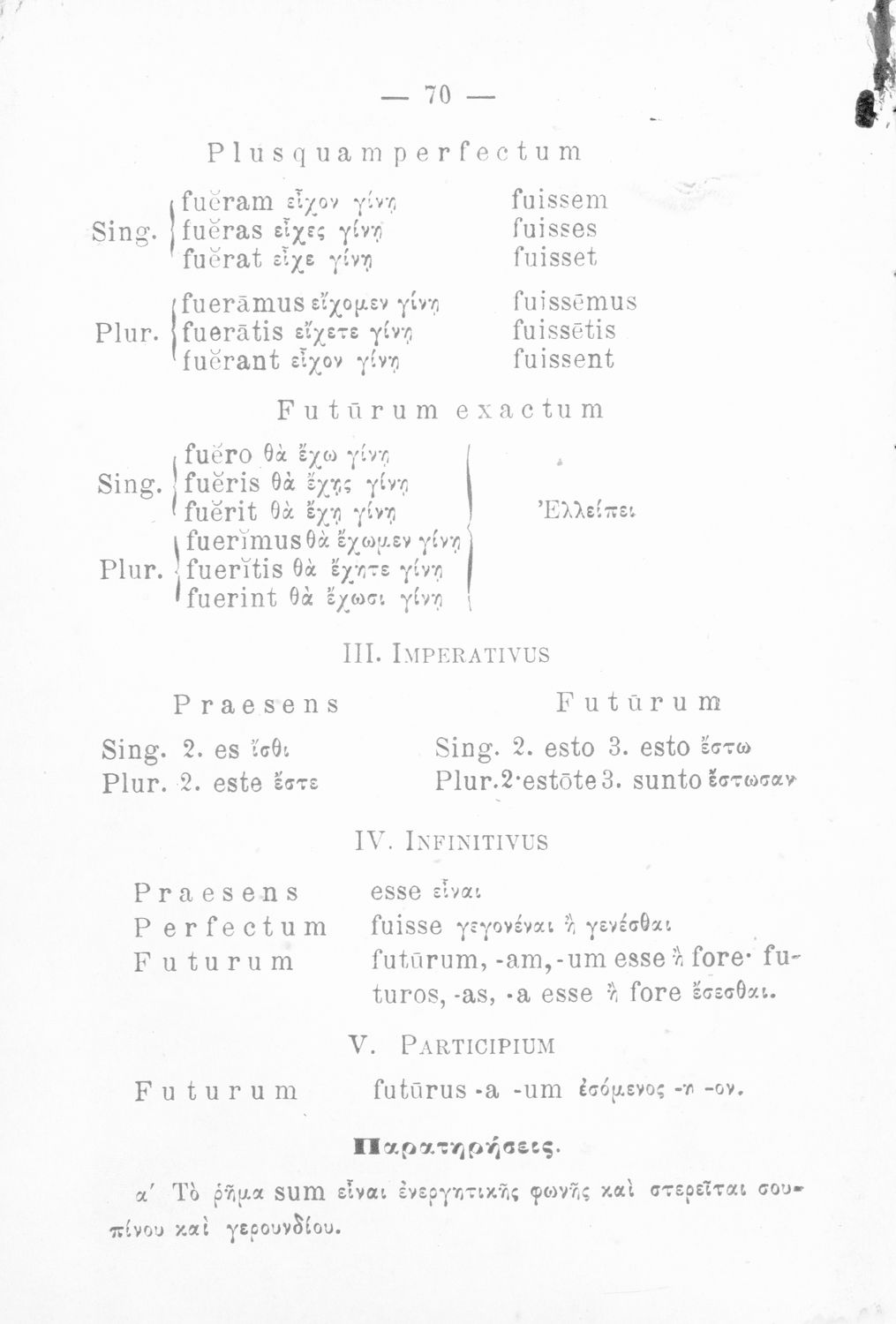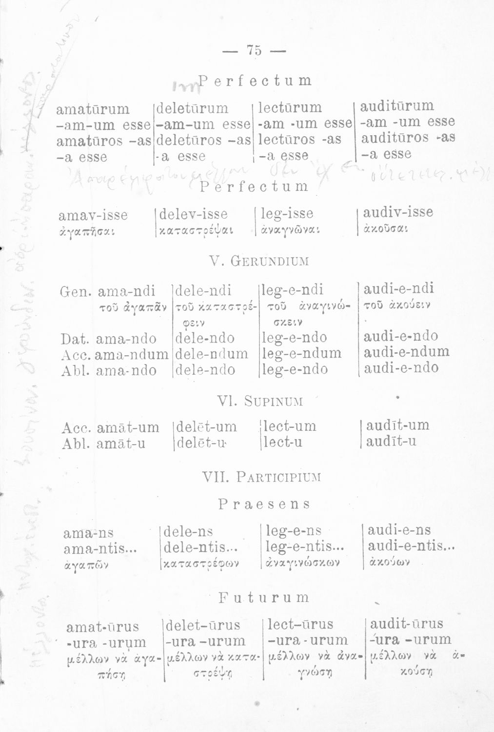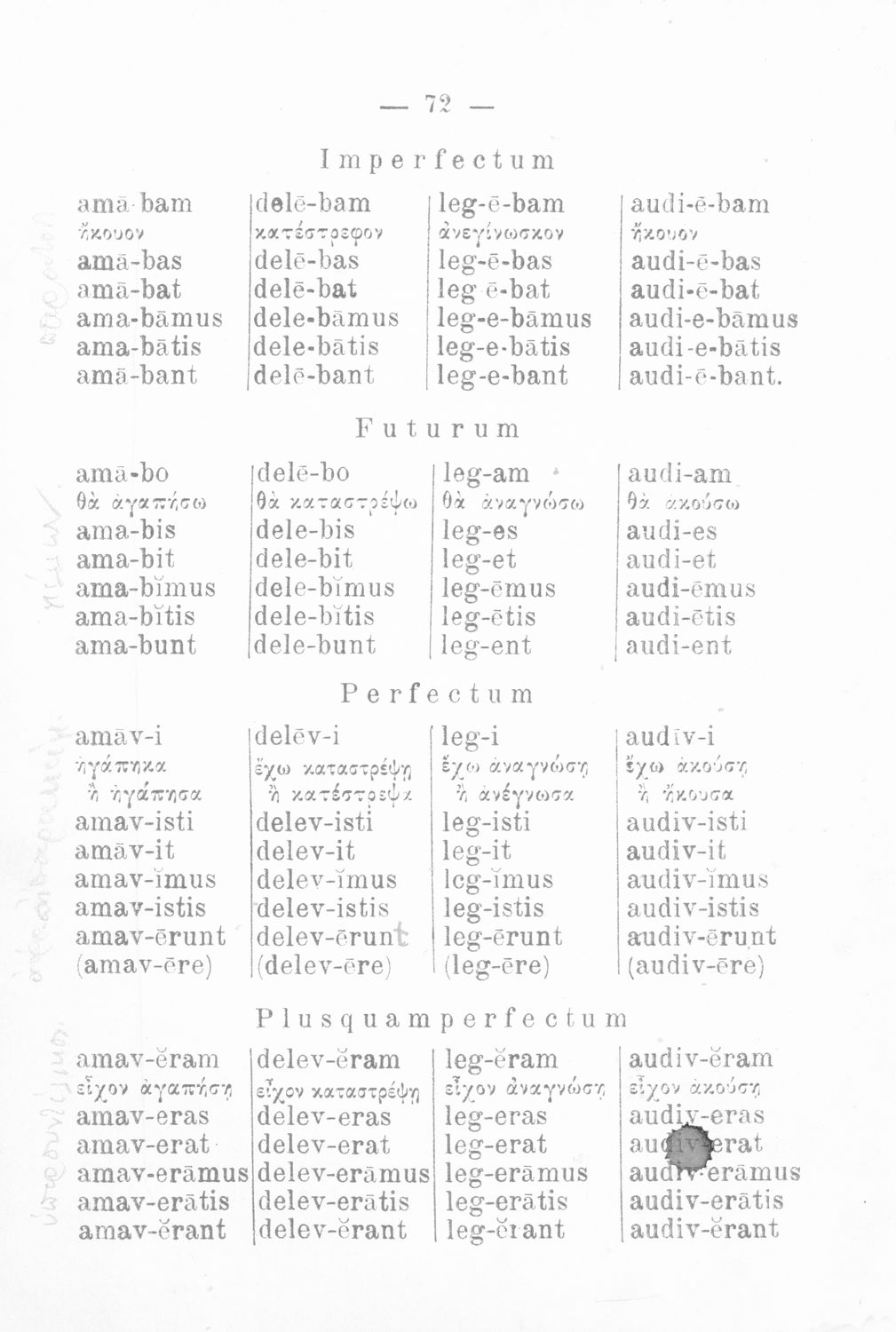 Σχολικό εγχειρίδιο Λατινικών Α΄, Β΄, Γ' Γυμνασίου που περιλαμβάνει γραμματική και συντακτικό και είναι χωρισμένο σε φθογγολογικό, τυπολογικό και ετυμολογικό μέρος.