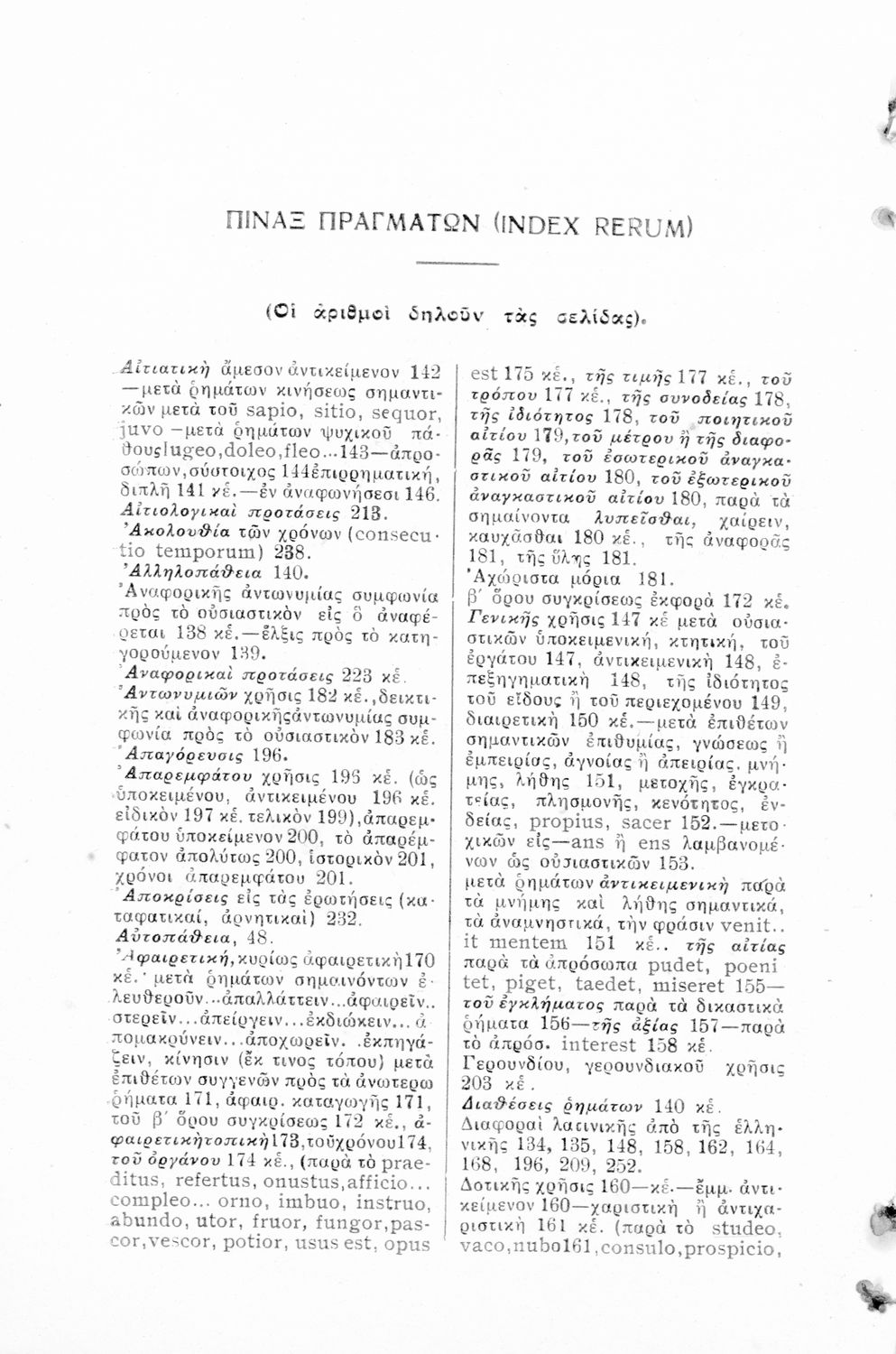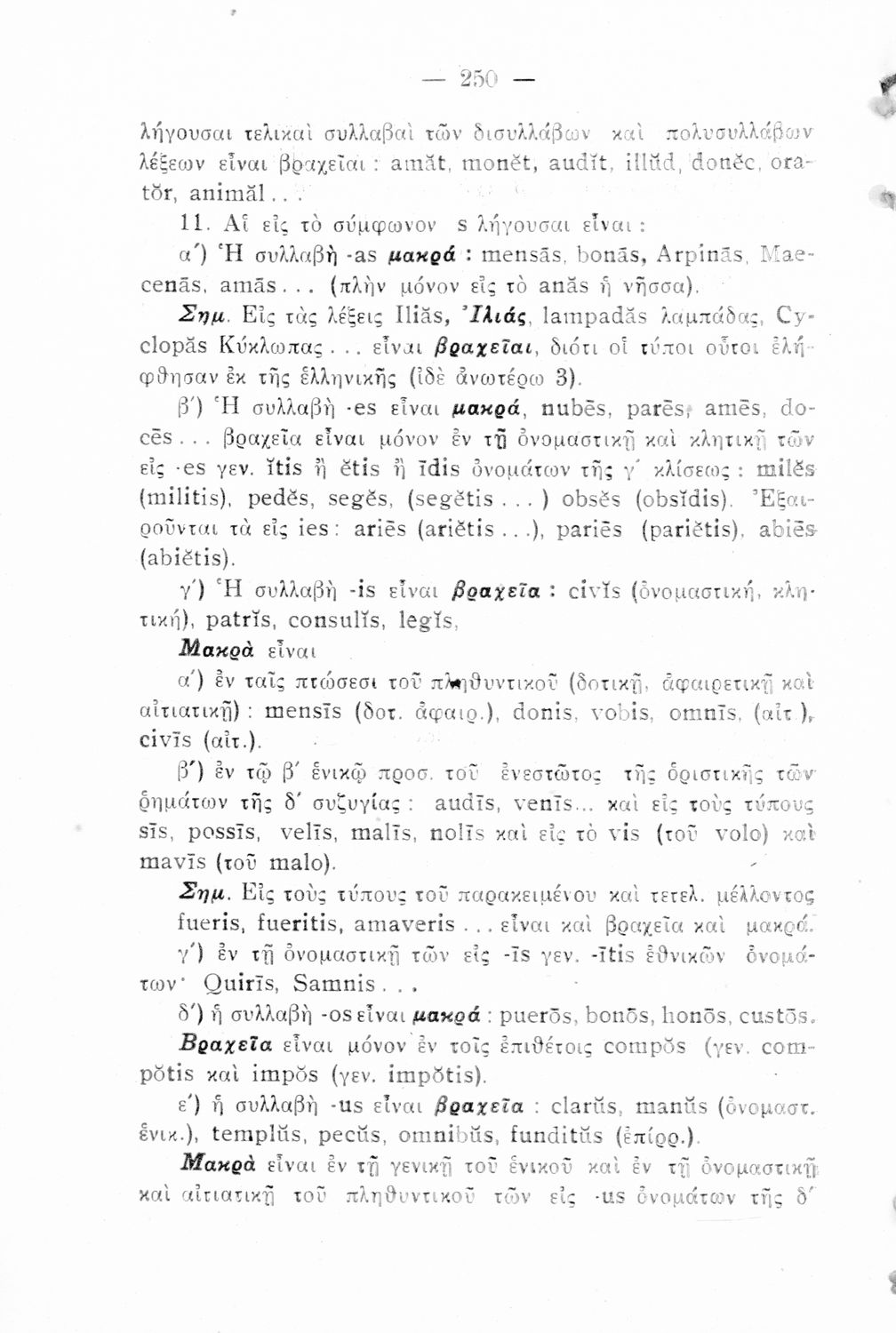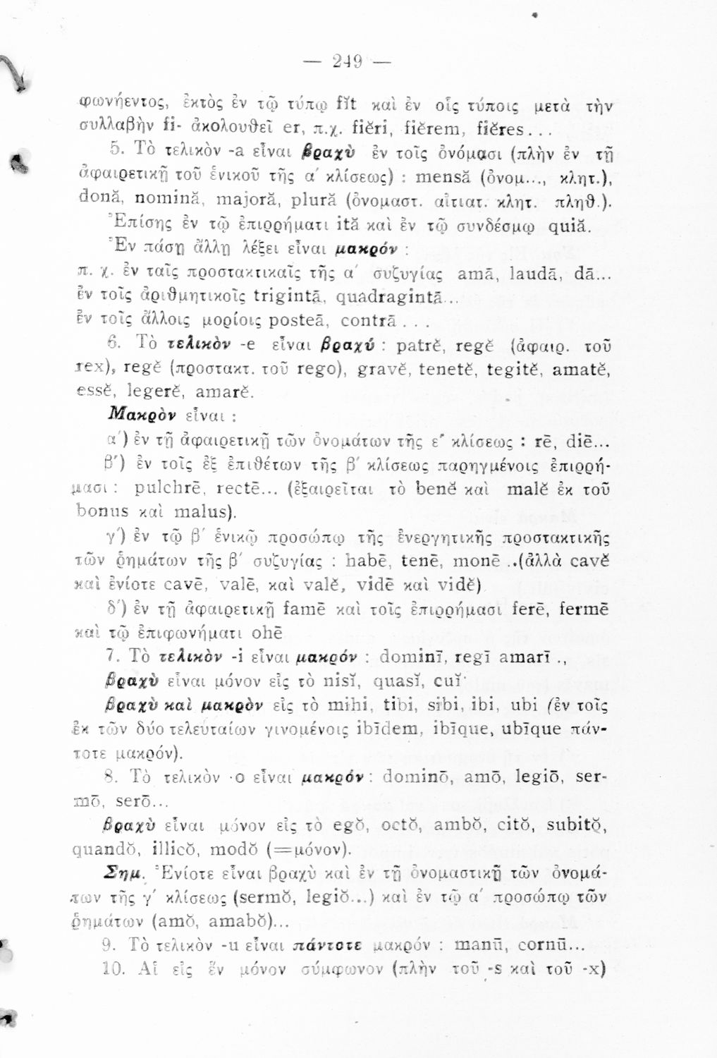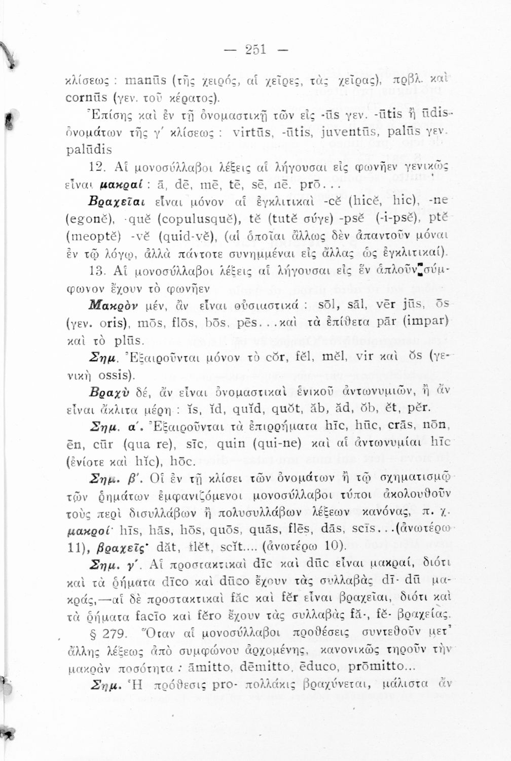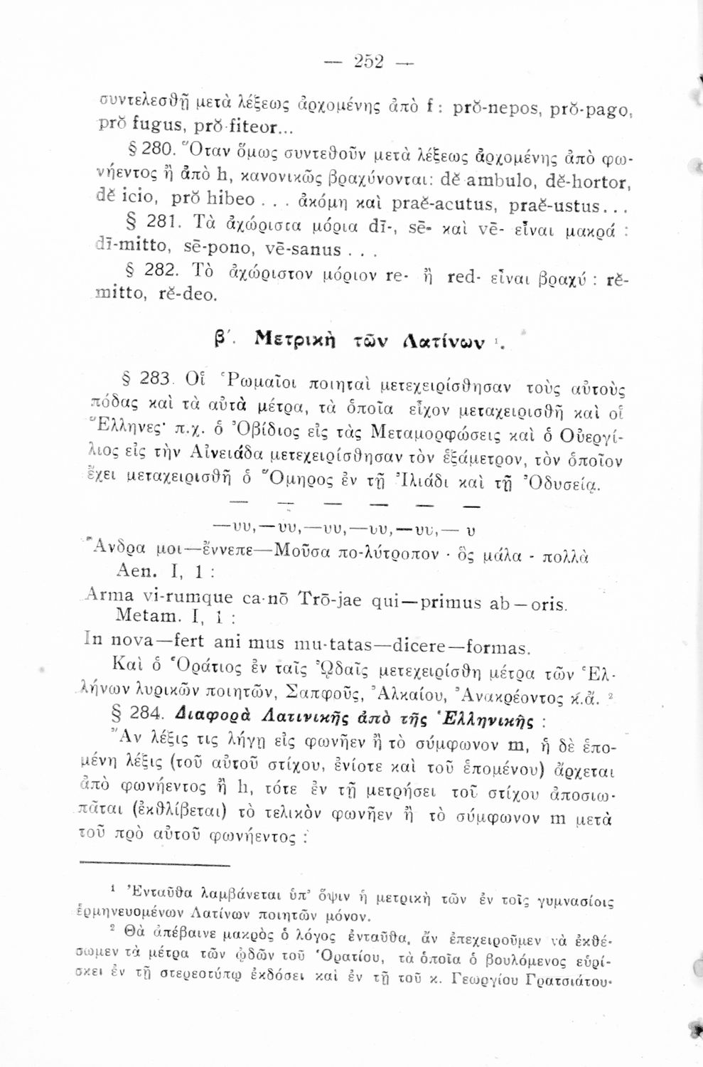 Σχολικό εγχειρίδιο Λατινικών Α΄, Β΄, Γ' Γυμνασίου που περιλαμβάνει γραμματική και συντακτικό και είναι χωρισμένο σε φθογγολογικό, τυπολογικό και ετυμολογικό μέρος.