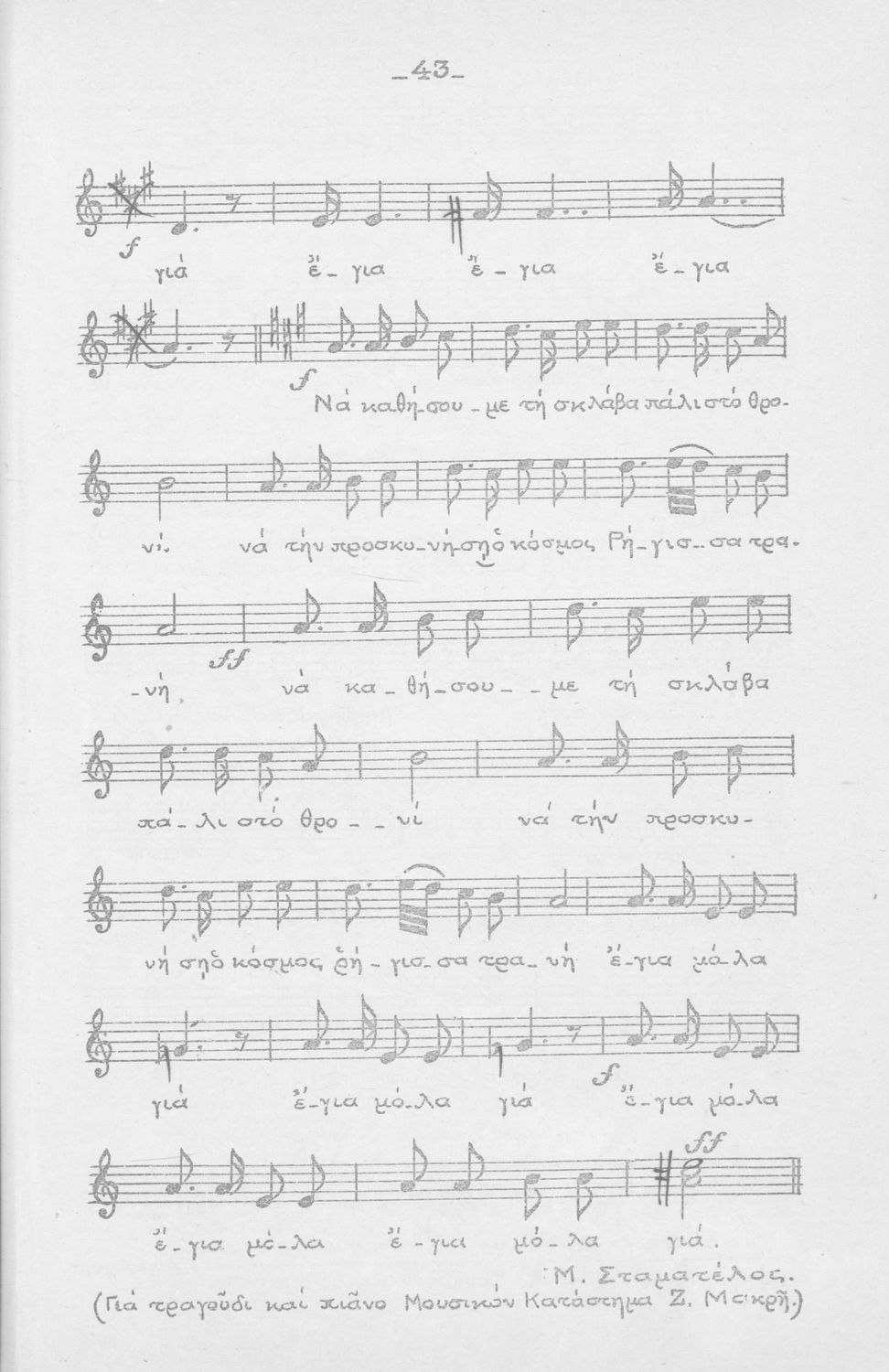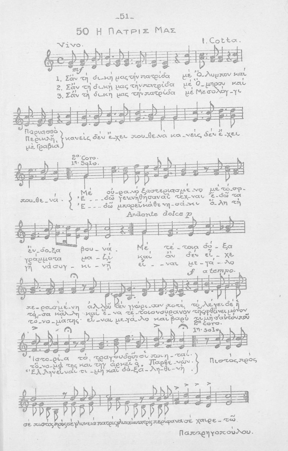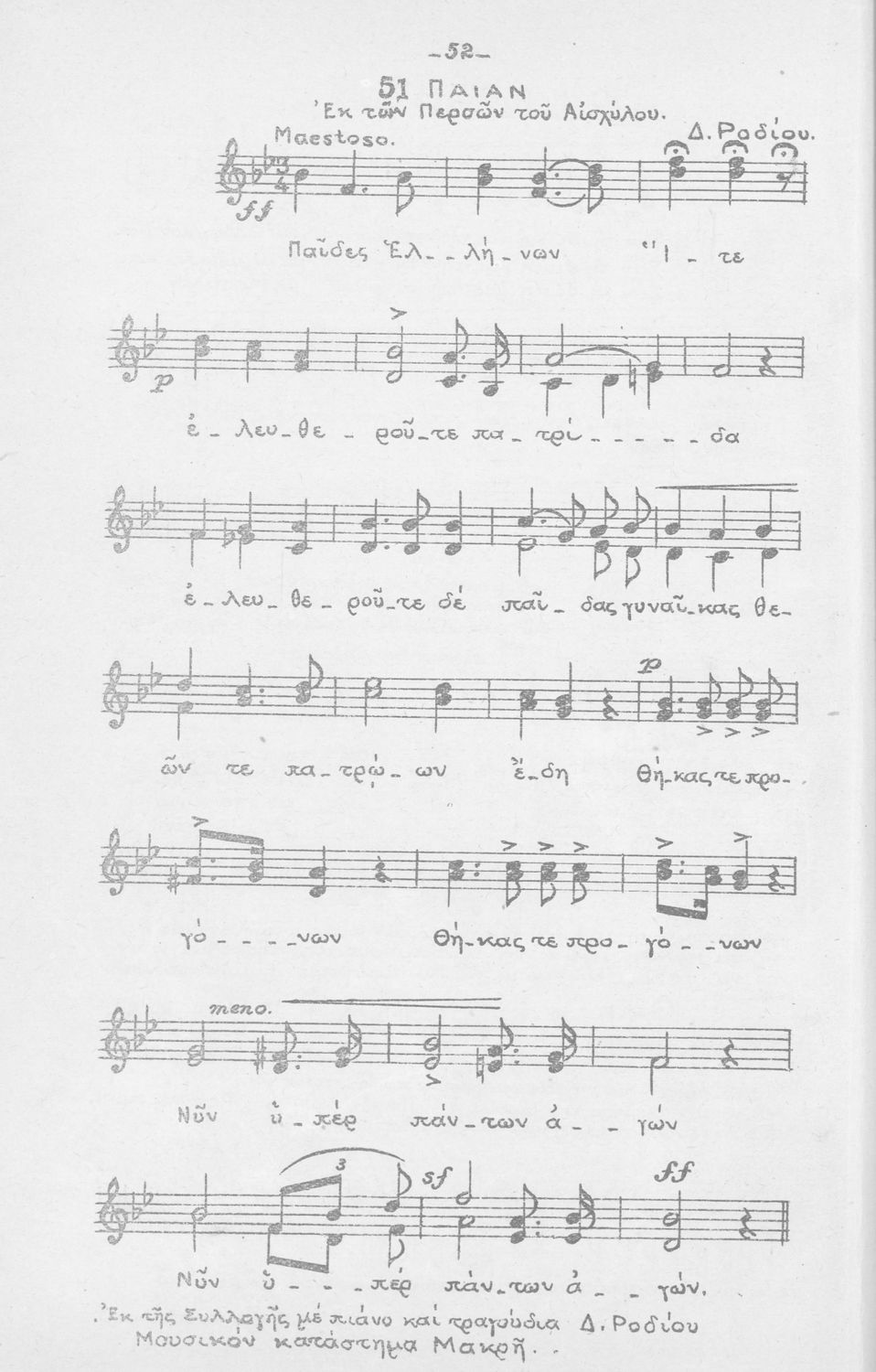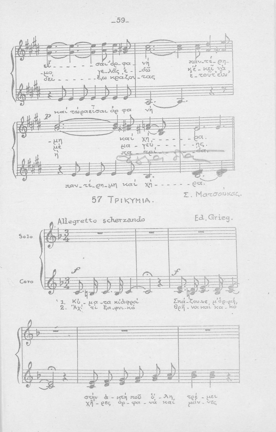 Σχολικό εγχειρίδιο Μουσικής για τη Δευτεροβάθμια εκπαίδευση. Το βιβλίο περιέχει τραγούδια παιδαγωγικά, μονόφωνα, δίφωνα και τρίφωνα. Ο συγγραφέας υπήρξε καθηγητής Μουσικής στο Γυμνάσιο και Αστικό σχολείο του Αρσακείου Αθηνών.