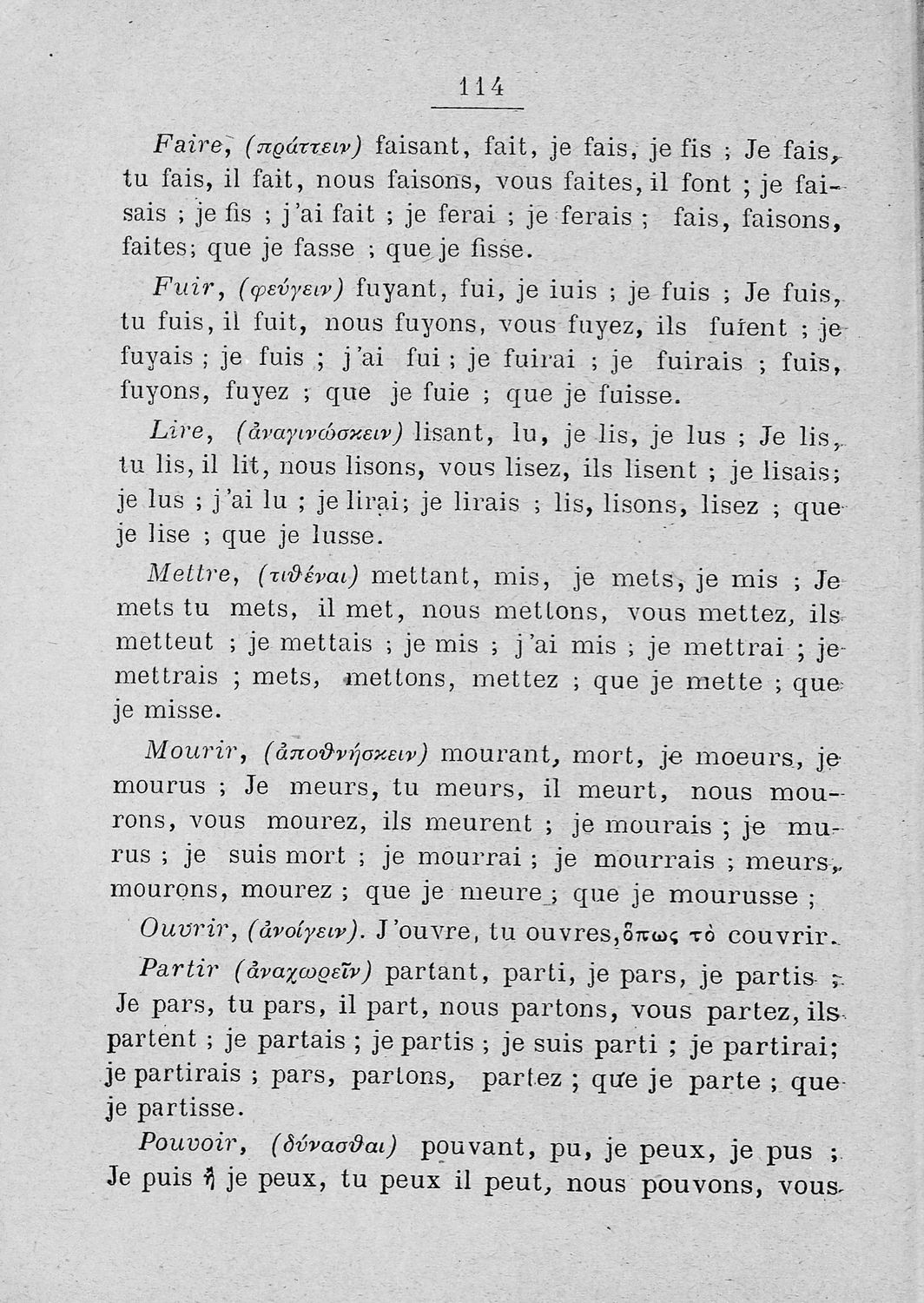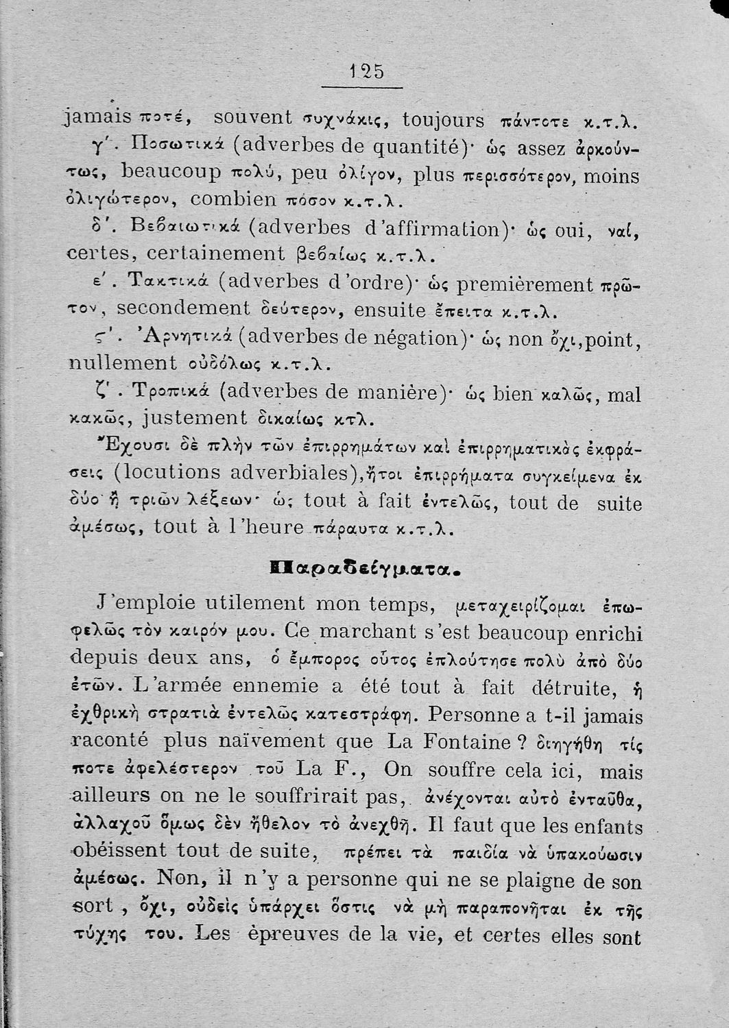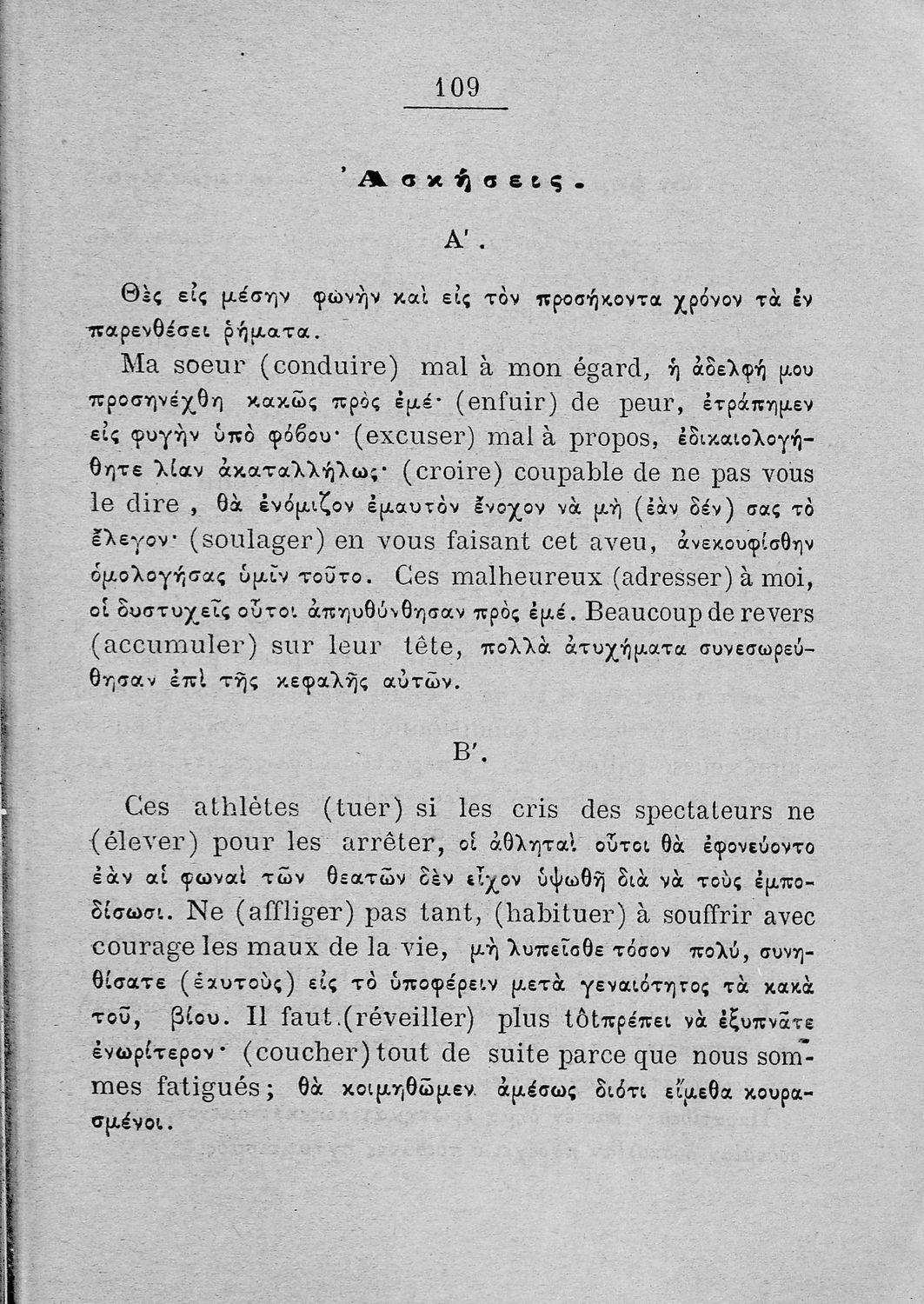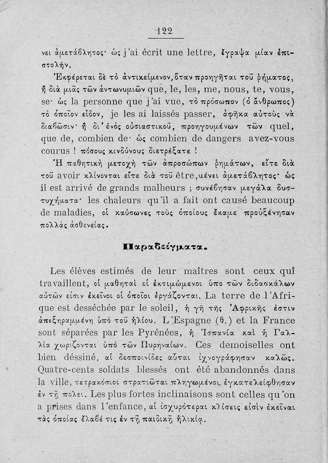 Γραμματική της Γαλλικής γλώσσας για τα Ελληνικά Σχολεία και Παρθεναγωγεία που αναλύει τα μέρη του λόγου και περιέχει παραδείγματα και ασκήσεις.