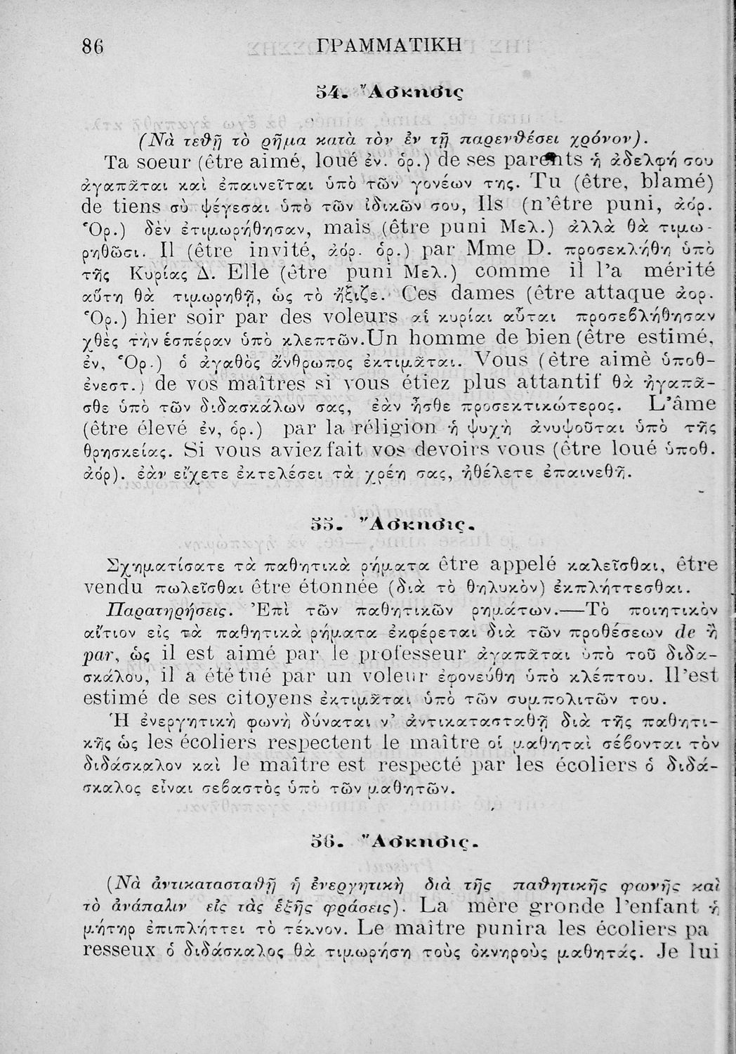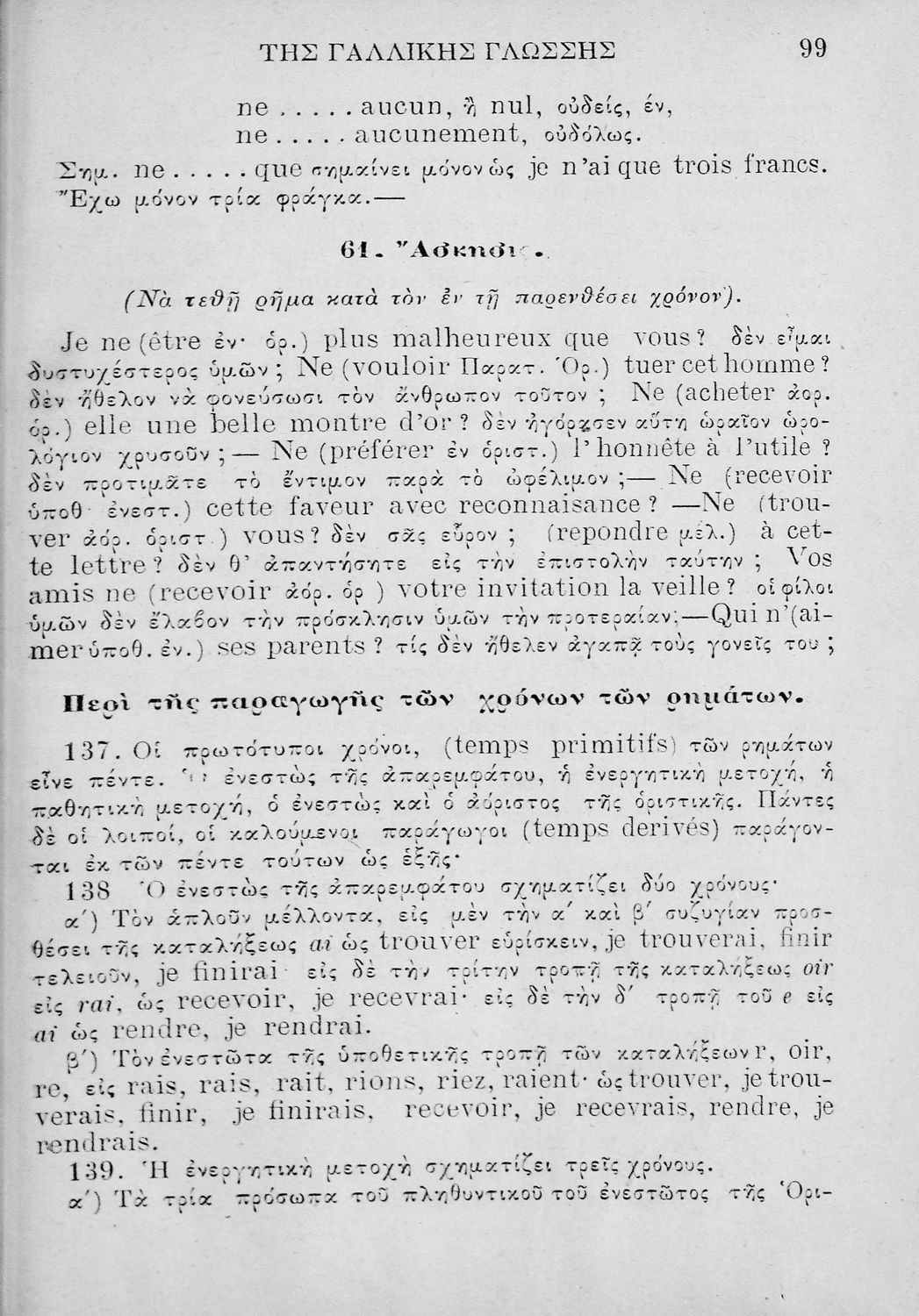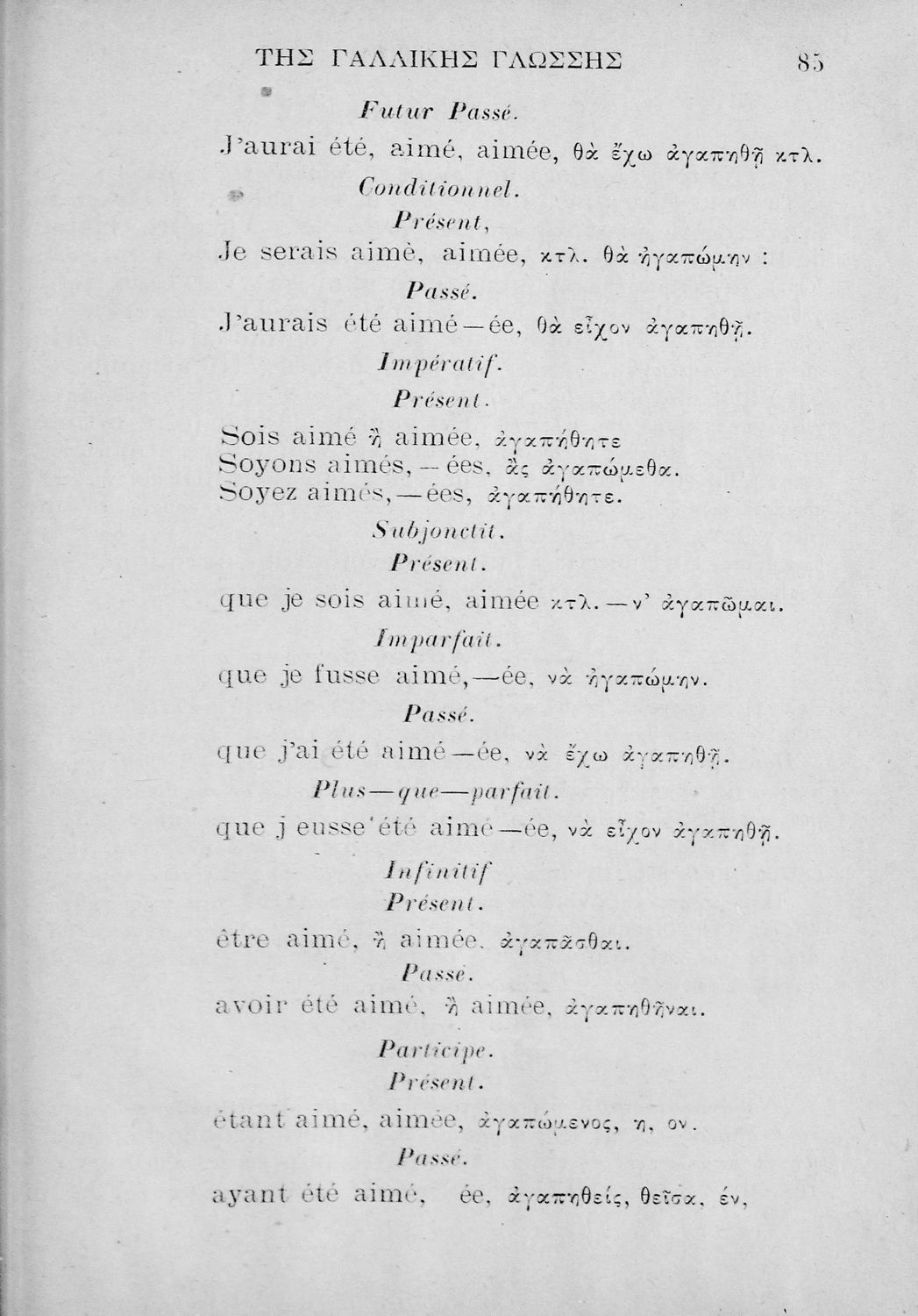 Γραμματική της Γαλλικής γλώσσας για τα Ελληνικά Σχολεία και Παρθεναγωγεία που αναλύει τα μέρη του λόγου και περιέχει παραδείγματα και ασκήσεις.