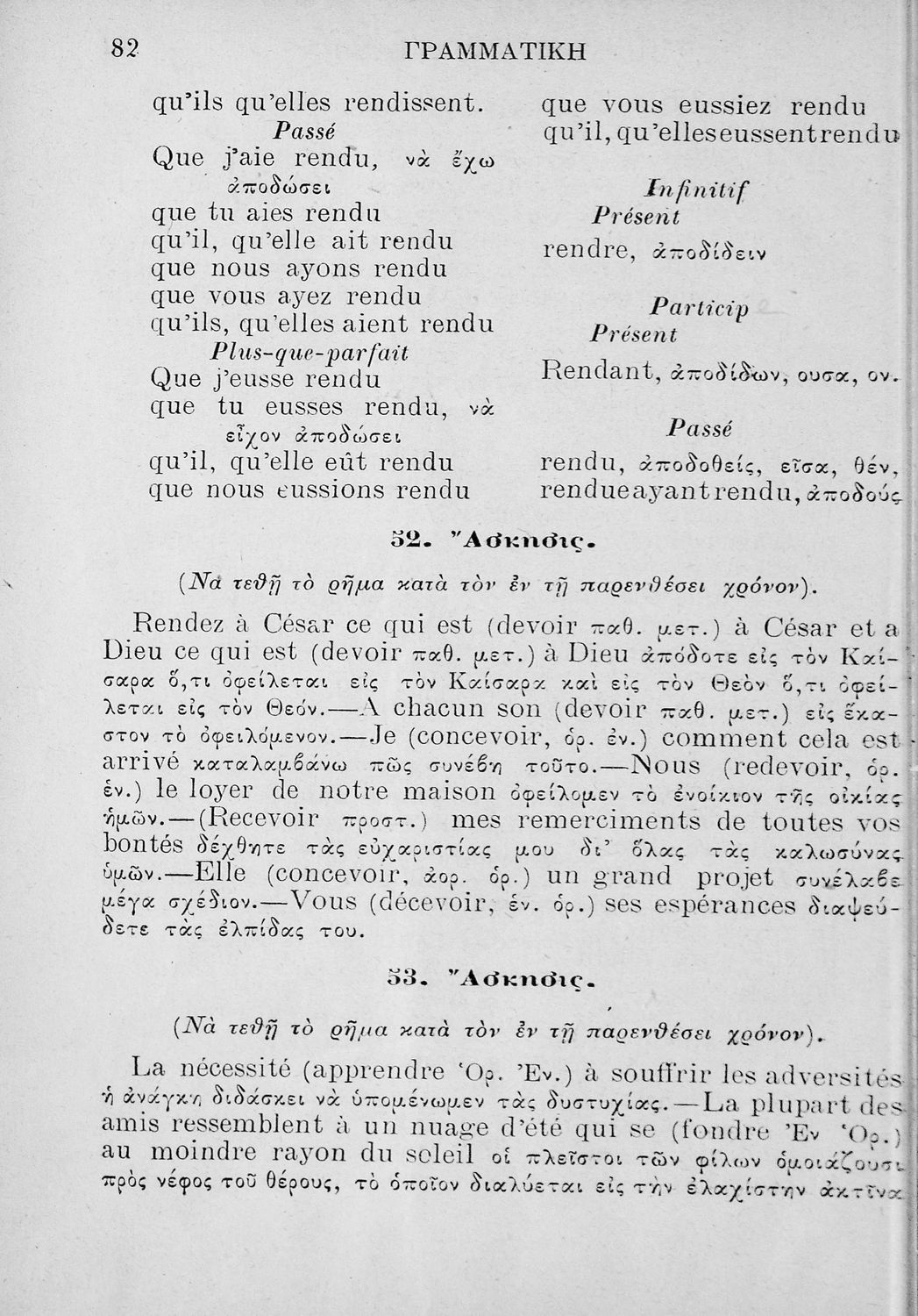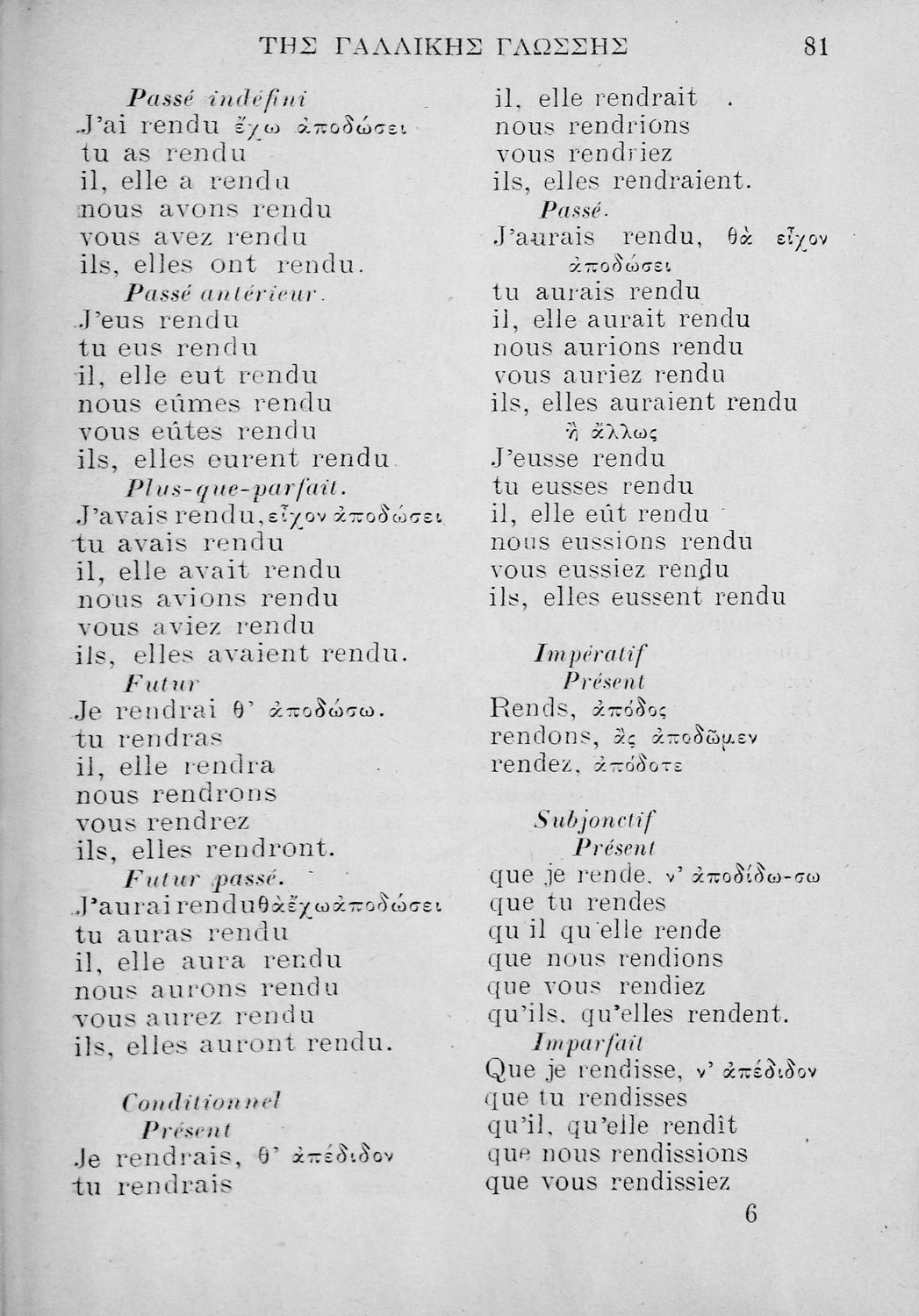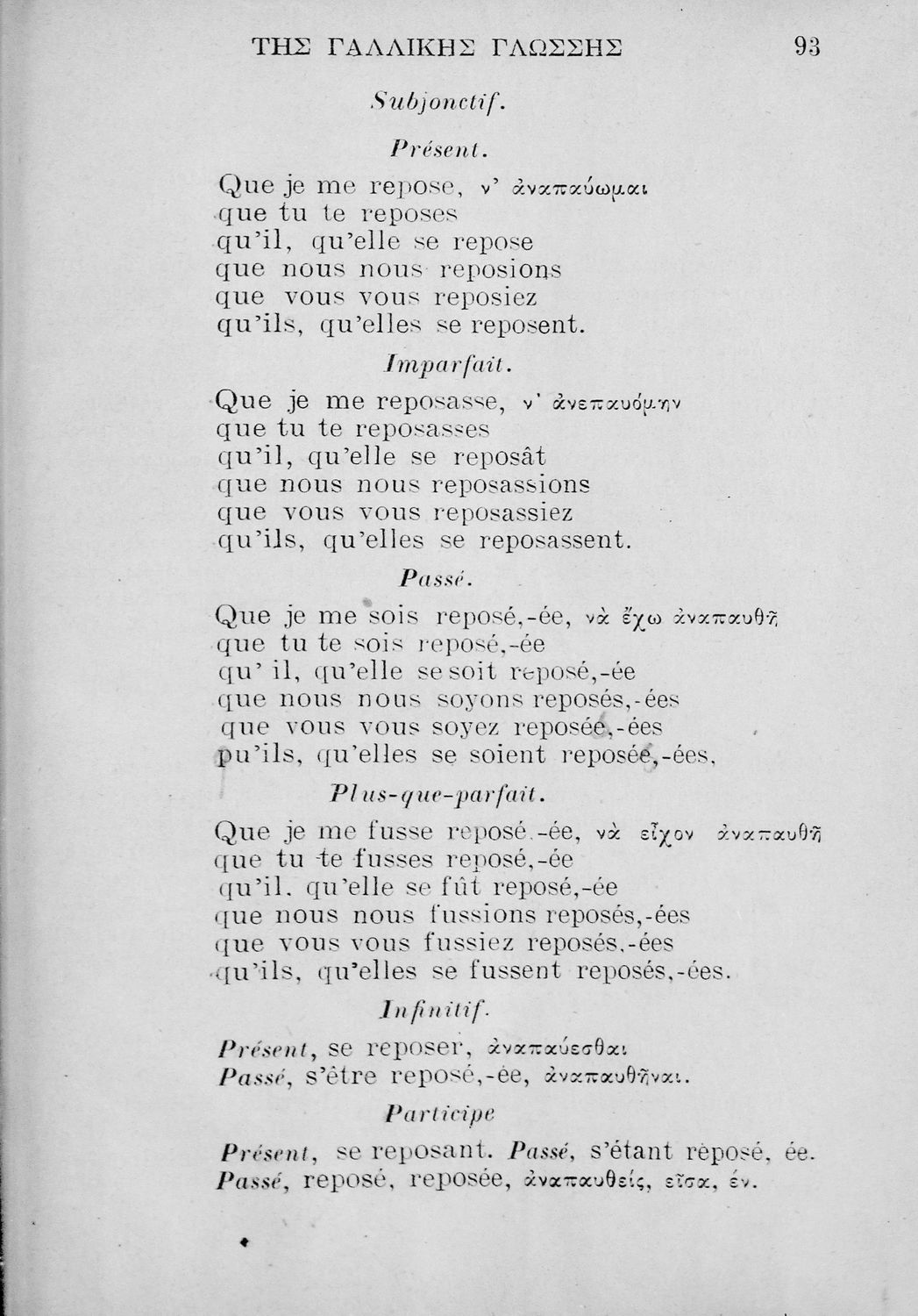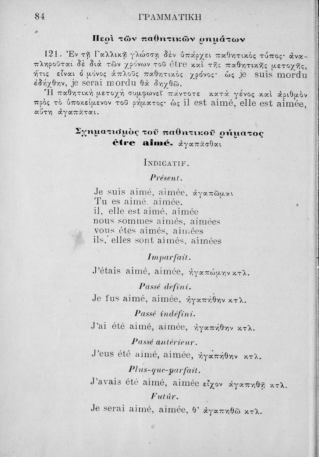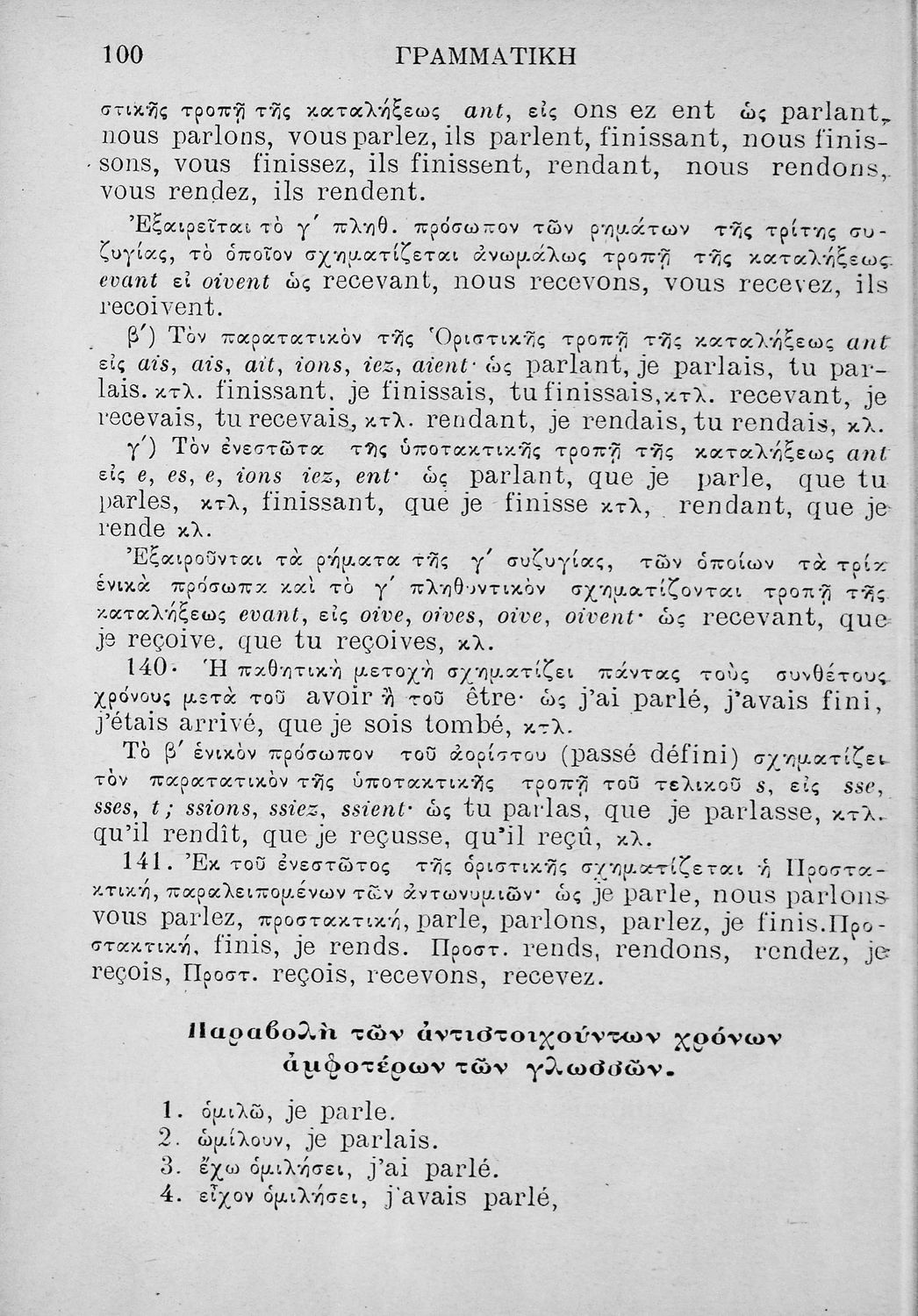 Σχολικό εγχειρίδιο για τα Ελληνικά Σχολεία και Παρθεναγωγεία περιλαμβάνει τους βασικούς κανόνες γραμματικής της γαλλικής γλώσσας.