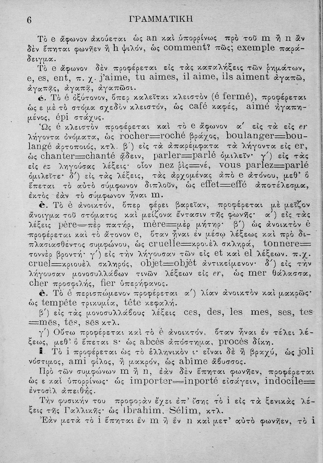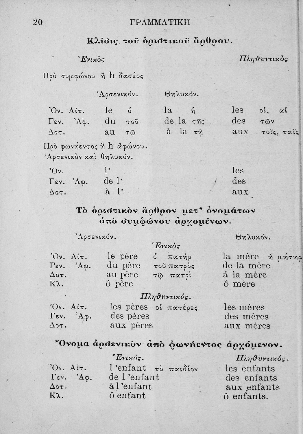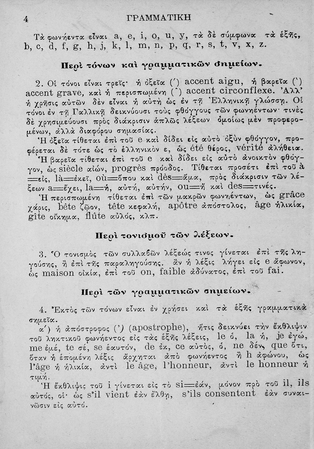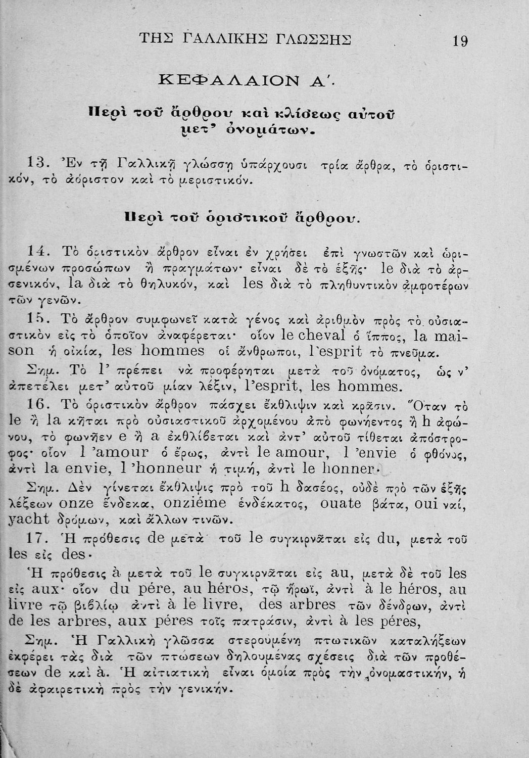 Σχολικό εγχειρίδιο για τα Ελληνικά Σχολεία και Παρθεναγωγεία περιλαμβάνει τους βασικούς κανόνες γραμματικής της γαλλικής γλώσσας.