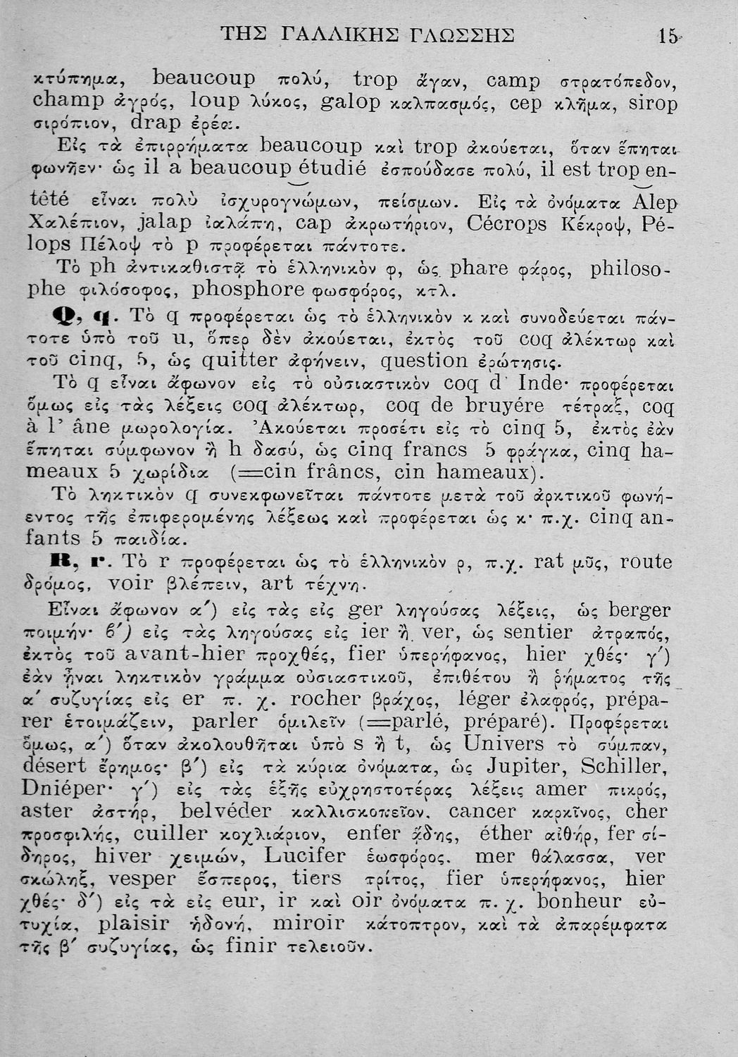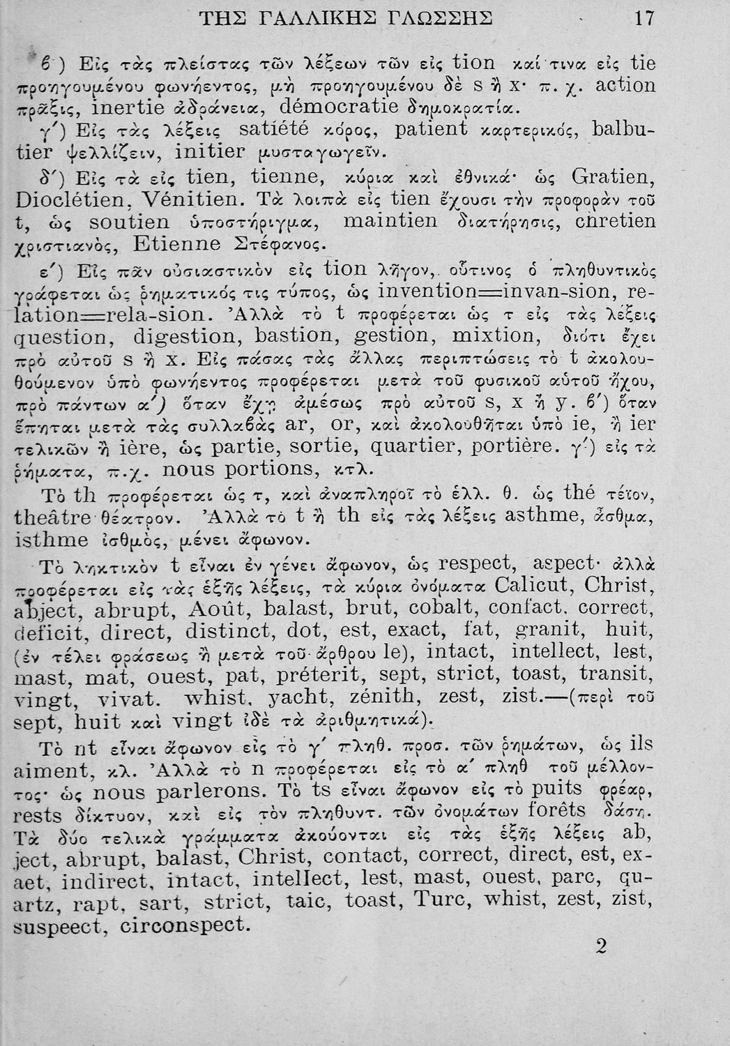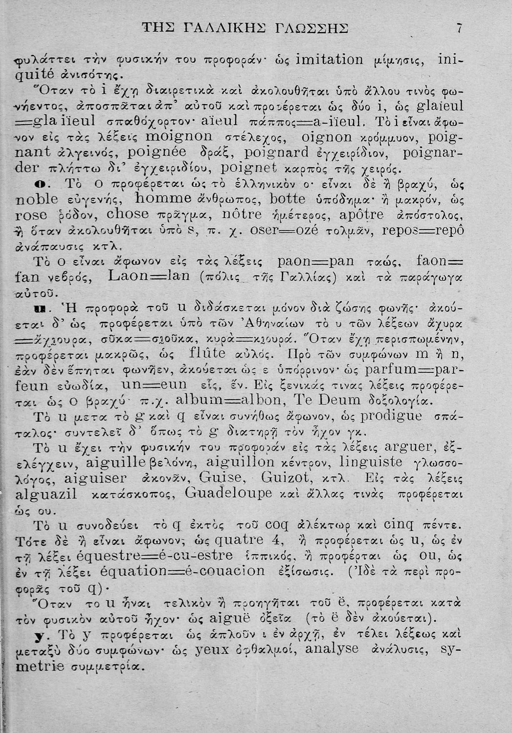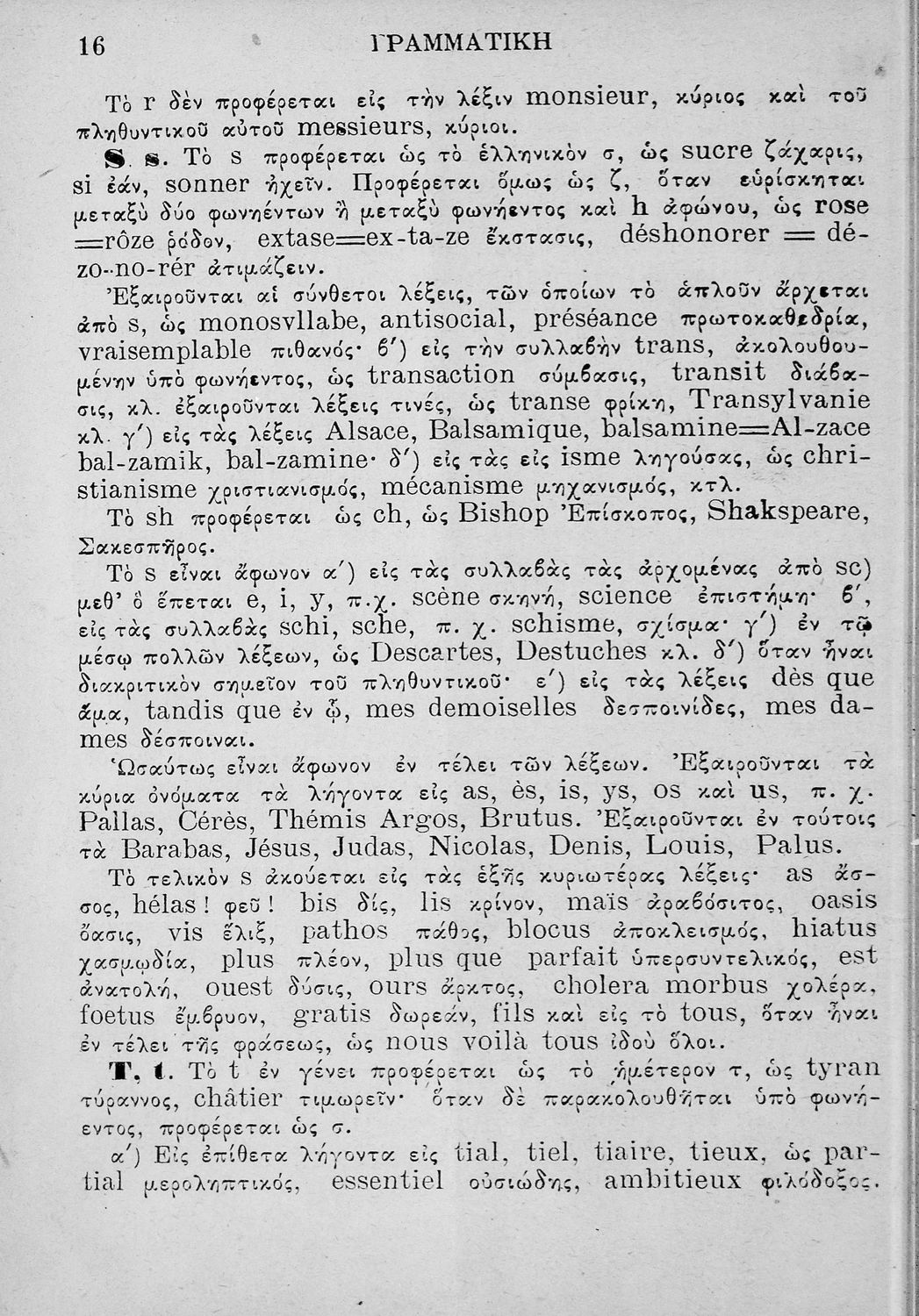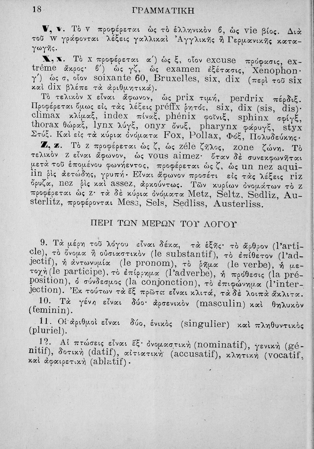 Γραμματική της Γαλλικής γλώσσας για τα Ελληνικά Σχολεία και Παρθεναγωγεία που αναλύει τα μέρη του λόγου και περιέχει παραδείγματα και ασκήσεις.