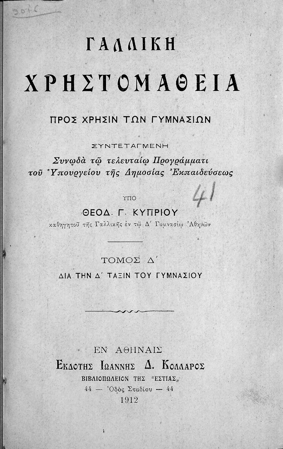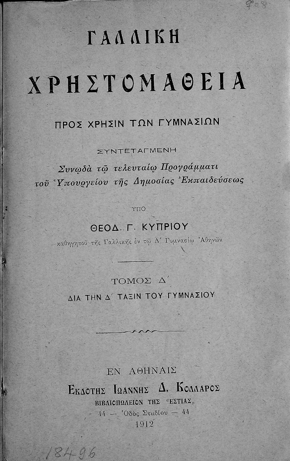 Κωδικός αναγνώρισης: 01-18496 Τίτλος: Γαλλική Χρηστομάθεια προς χρήσιν των Γυμνασίων, τόμος Δ δια την Δ’ τάξιν του Γυμνασίου Συγγραφέας: Θεόδωρος. Γ. Κύπριος Μέγεθος και υπόστρωμα: Σχολικό εγχειρίδιο, 20εκ., σκληρό εξώφυλλο, 107 σελίδες. |