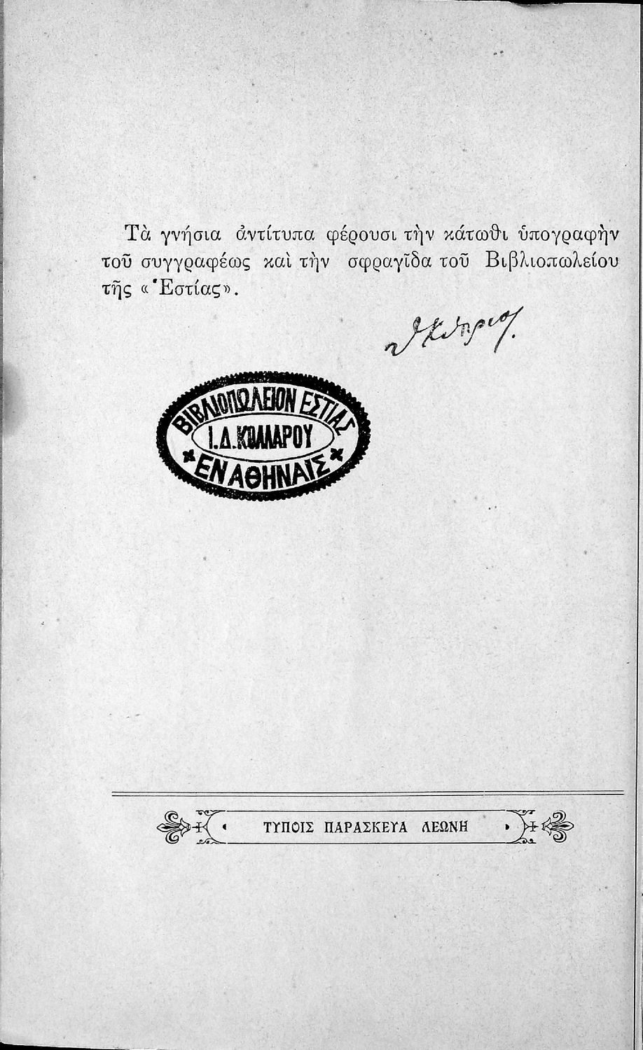 Εκδότης: Ιωάννης Δ. Κολλάρος Έτος έκδοσης: 1912 Τόπος έκδοσης: Αθήνα |