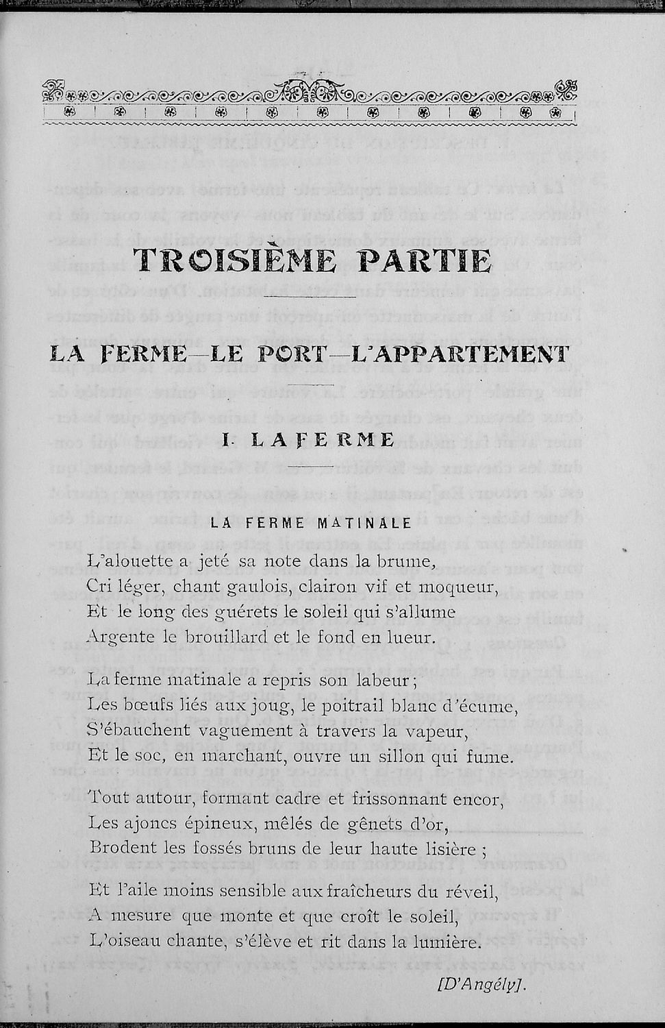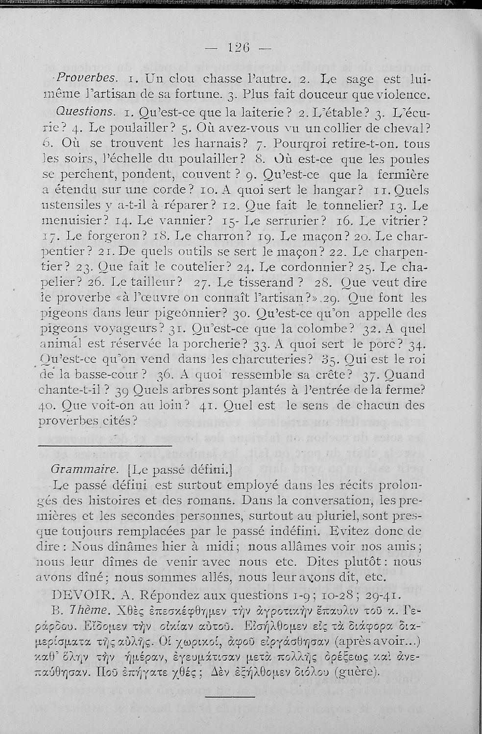 Βαθμίδα εκπαίδευσης: Δευτεροβάθμια Τάξη: Γυμνάσιο / Εμπορικές Σχολές Μάθημα: Γαλλικά Γλώσσα: Γαλλικά Παρουσίαση περιεχομένου: Σχολικό εγχειρίδιο Γαλλικών για τα Γυμνάσια και τις Εμπορικές Σχολές που περιλαμβάνει πεζά και ποιήματα, θεωρία, λεξιλόγιο, ασκήσεις και παροιμίες. Ο συγγραφέας ήταν καθηγητής της Δημόσιας Εμπορικής Σχολής Αθηνών και του Αρσακείου. |