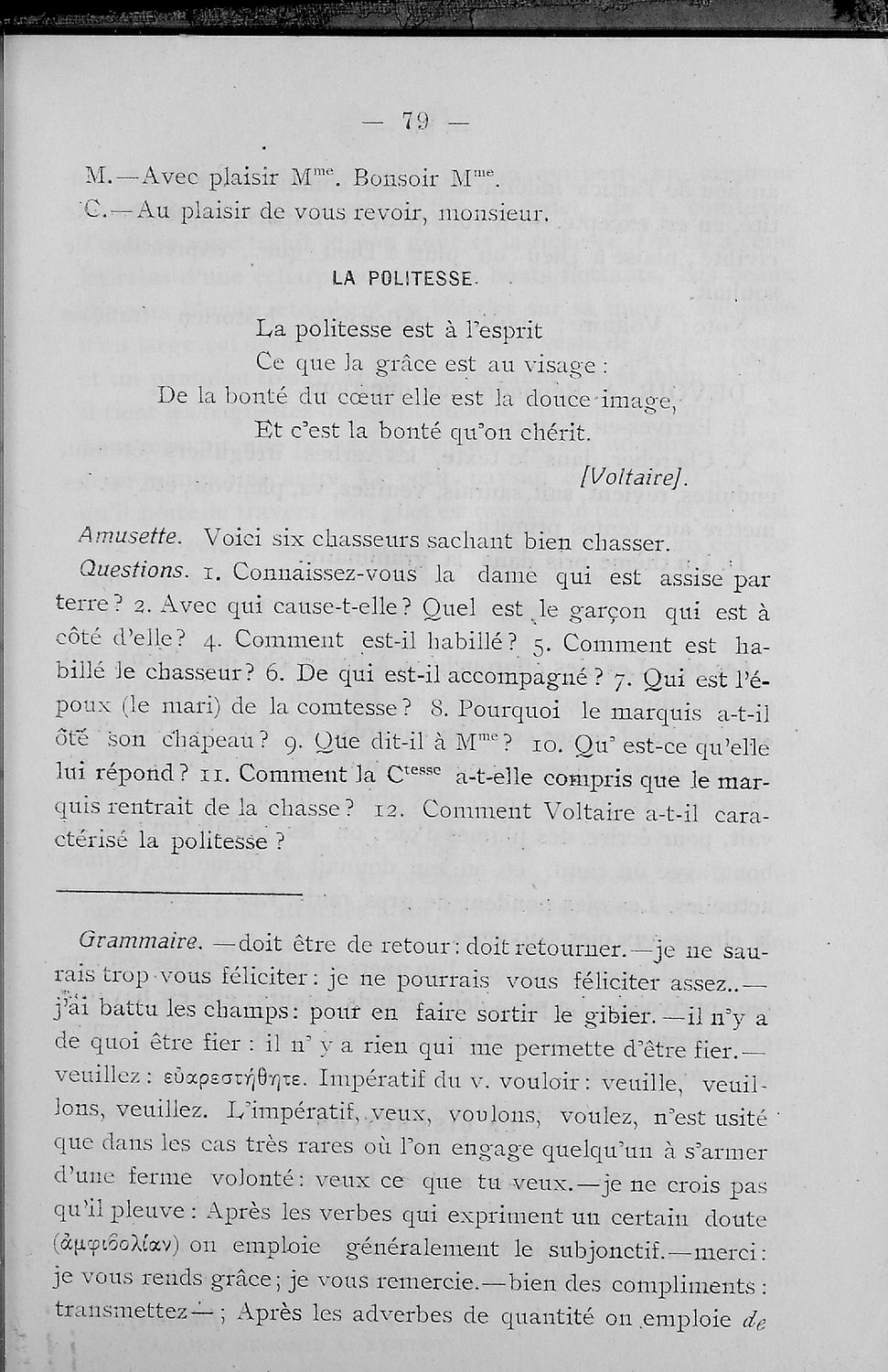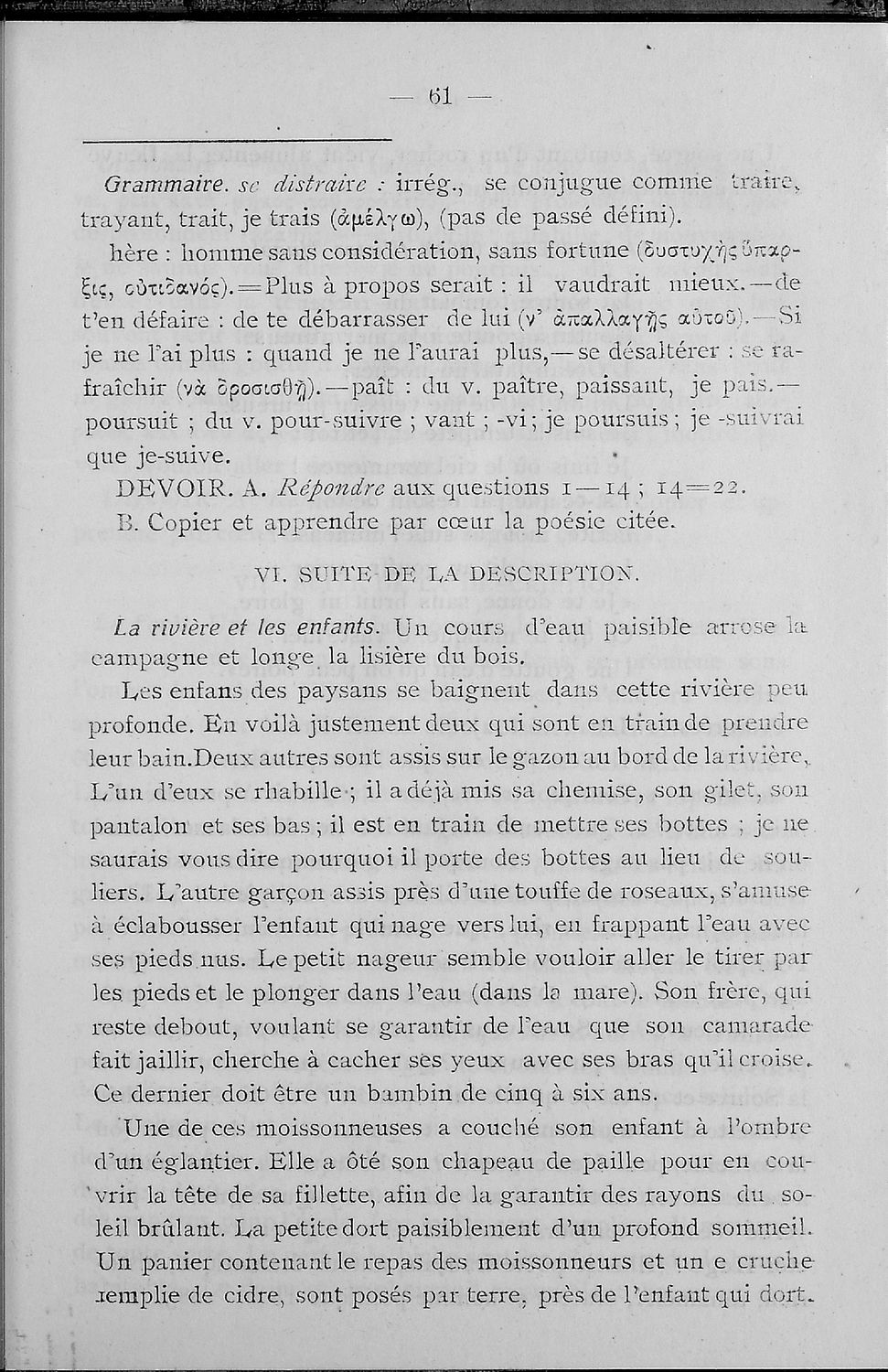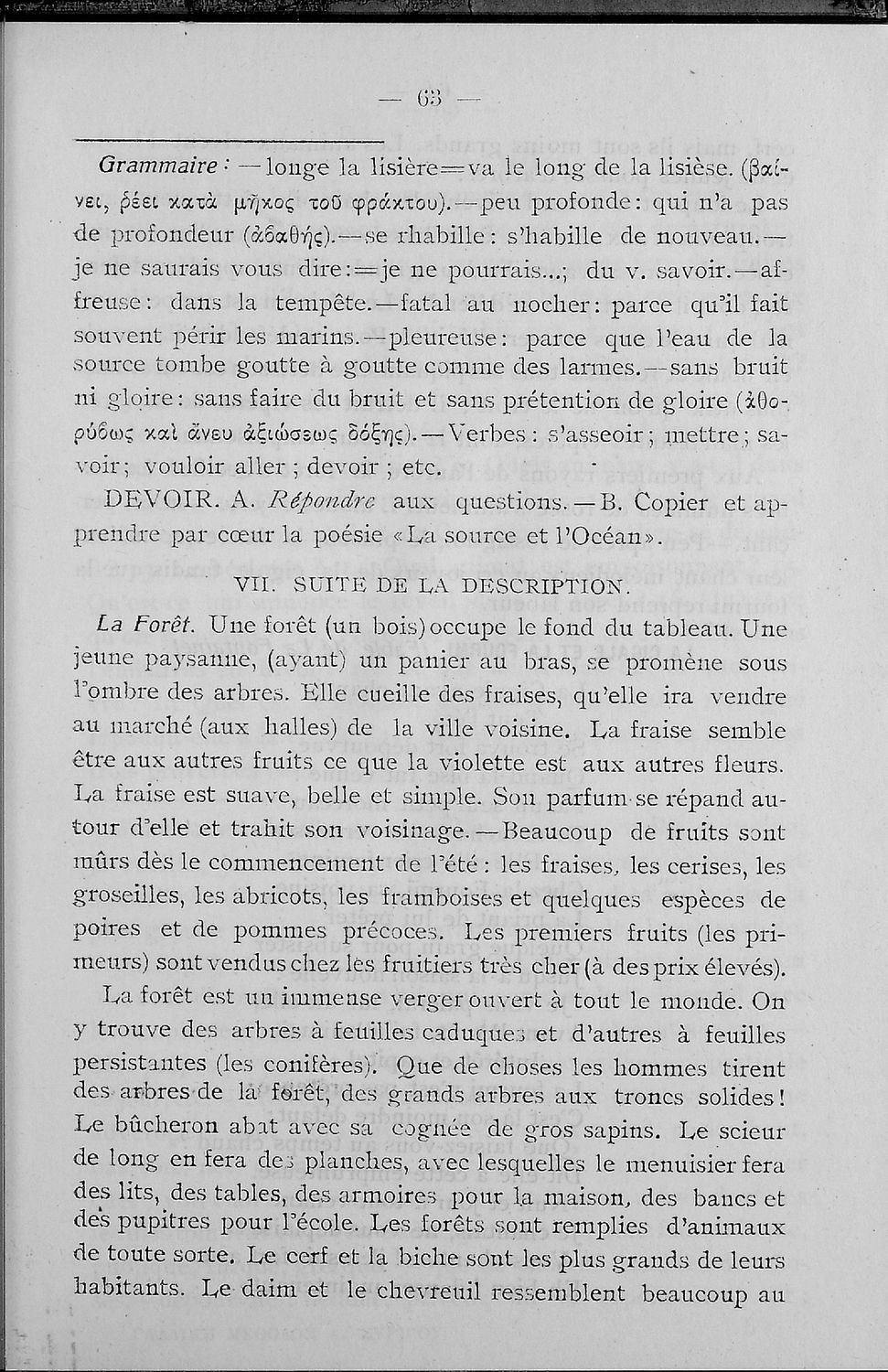 Σχολικό εγχειρίδιο Γαλλικών που περιλαμβάνει κείμενα, λεξιλόγιο και ασκήσεις. Ο συγγραφέας ήταν καθηγητής της Δημόσιας Εμπορικής Σχολής Αθηνών και του Αρσακείου.
