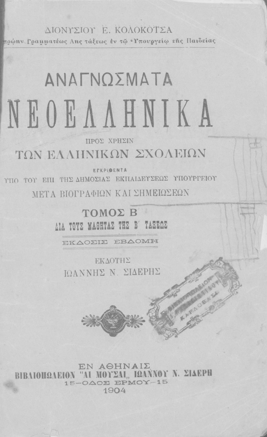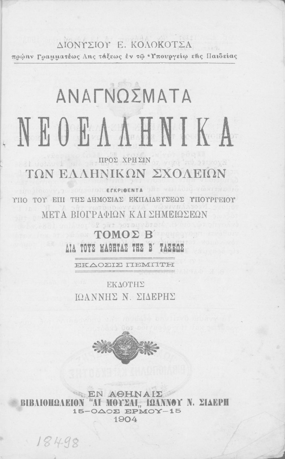 Τίτλος: Αναγνώσματα νεοελληνικά προς χρήσιν των Ελληνικών σχολείων, Τόμος Β΄ δια τους μαθητάς της Β΄ τάξης.