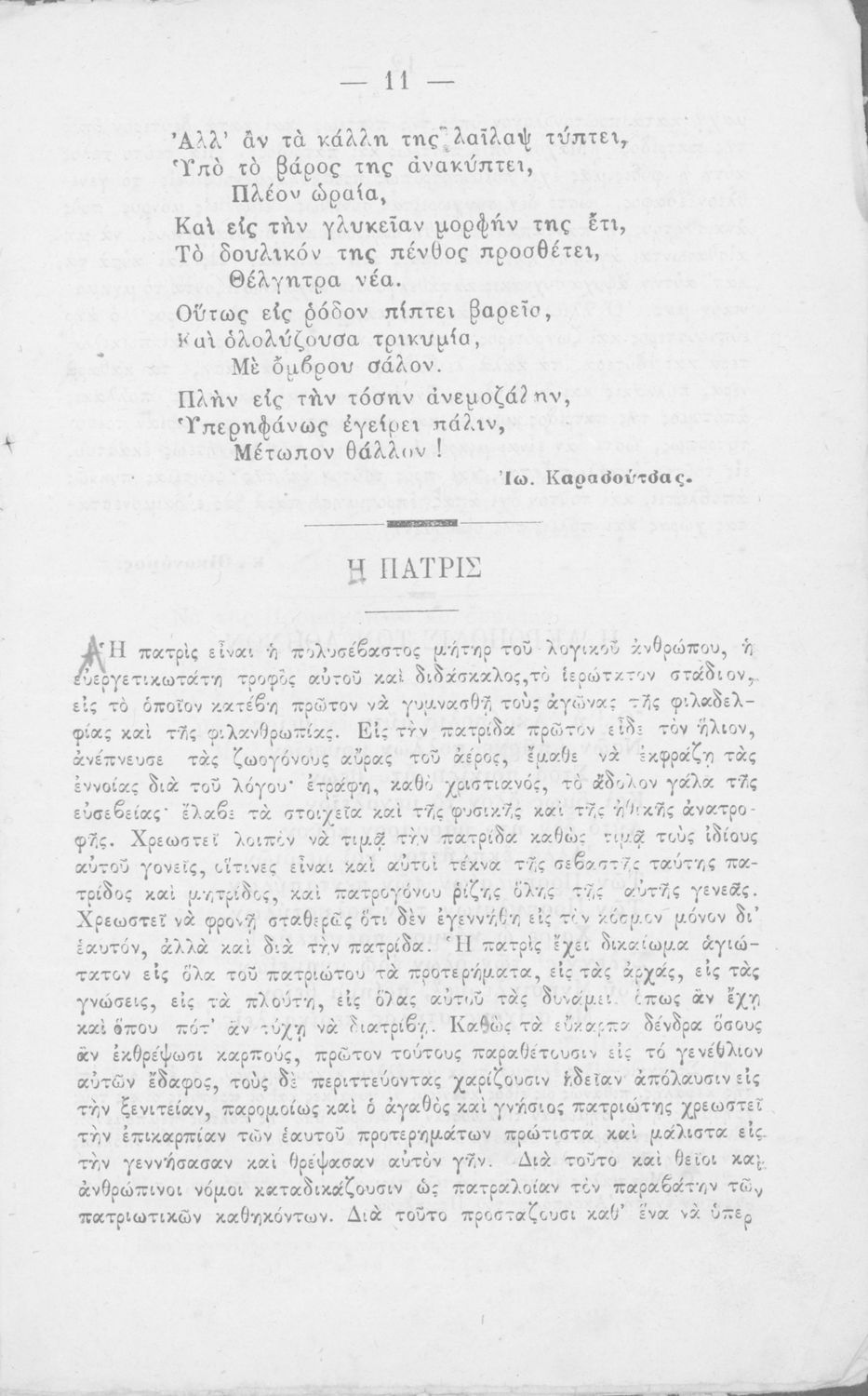 Σχολικό εγχειρίδιο Νεοελληνικών αναγνωσμάτων που περιλαμβάνει πεζά και ποιήματα Ελλήνων συγγραφέων με θέματα από την εθνική ζωή. Περιέχει και παράρτημα με βιογραφίες των συγγραφέων και λεξιλόγιο.