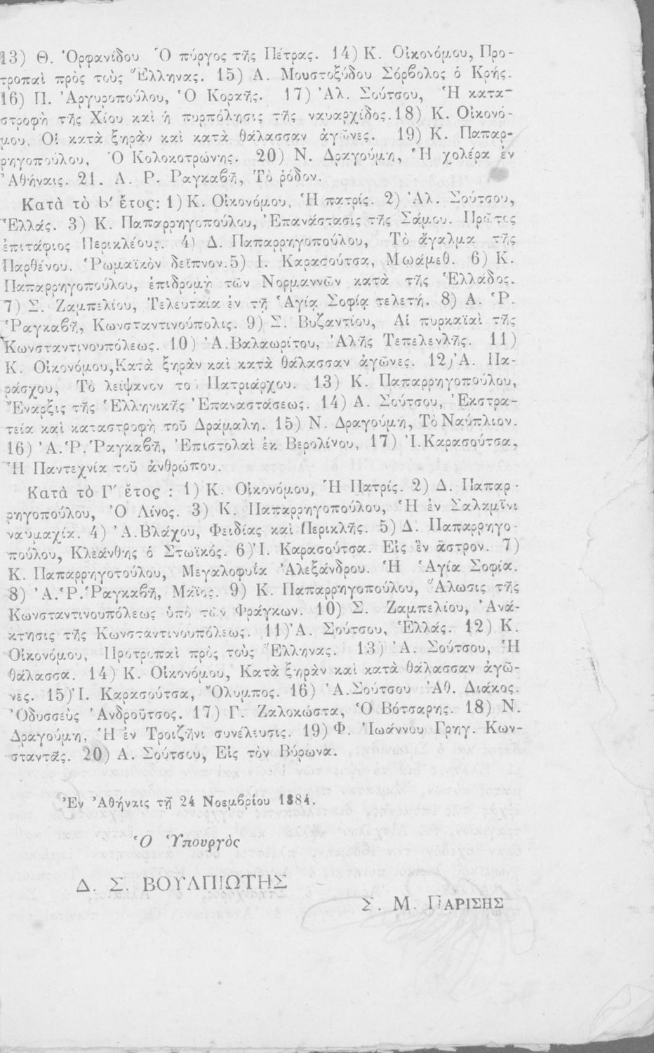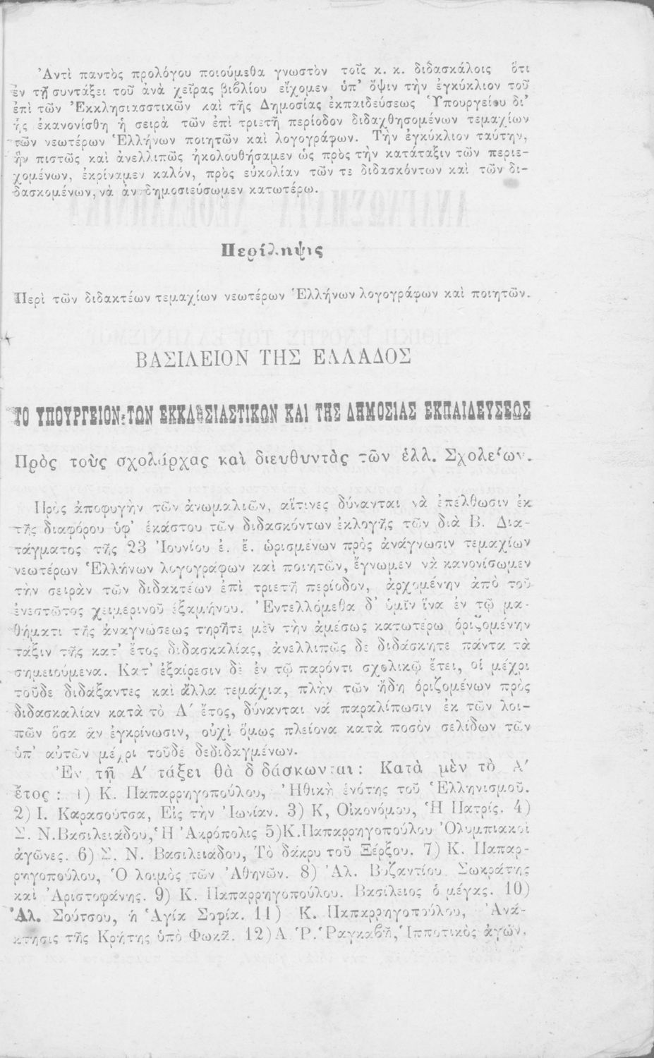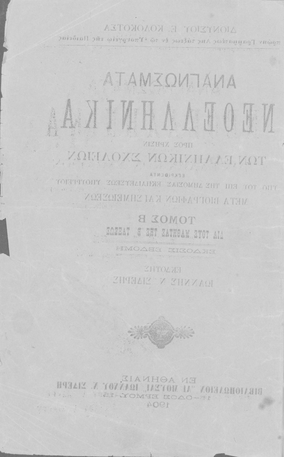 Σχολικό εγχειρίδιο Αρχαίων Ελληνικών για τα Ιερατικά Σχολεία. Ο τόμος περιέχει «..τεμάχια κατ’ εκλογήν εκ της Ξενοφώντος Κύρου Ανάβασεως και εκ των Γεωγραφικών και Εθνογραφικών Στράβωνος, Διοδώρου και άλλων, ...