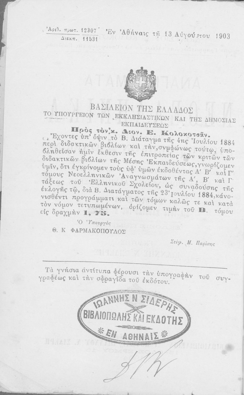 Εκδότης: Βιβλιοπωλείο ΑΙ "Μούσαι" Ιωάννη Ν.Σιδέρη