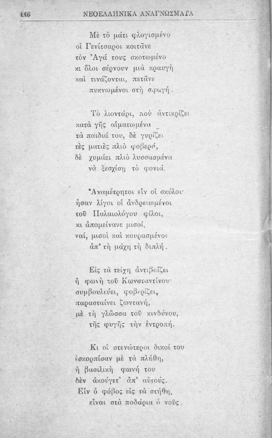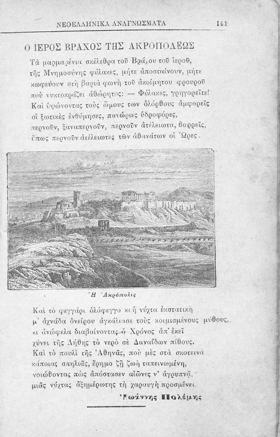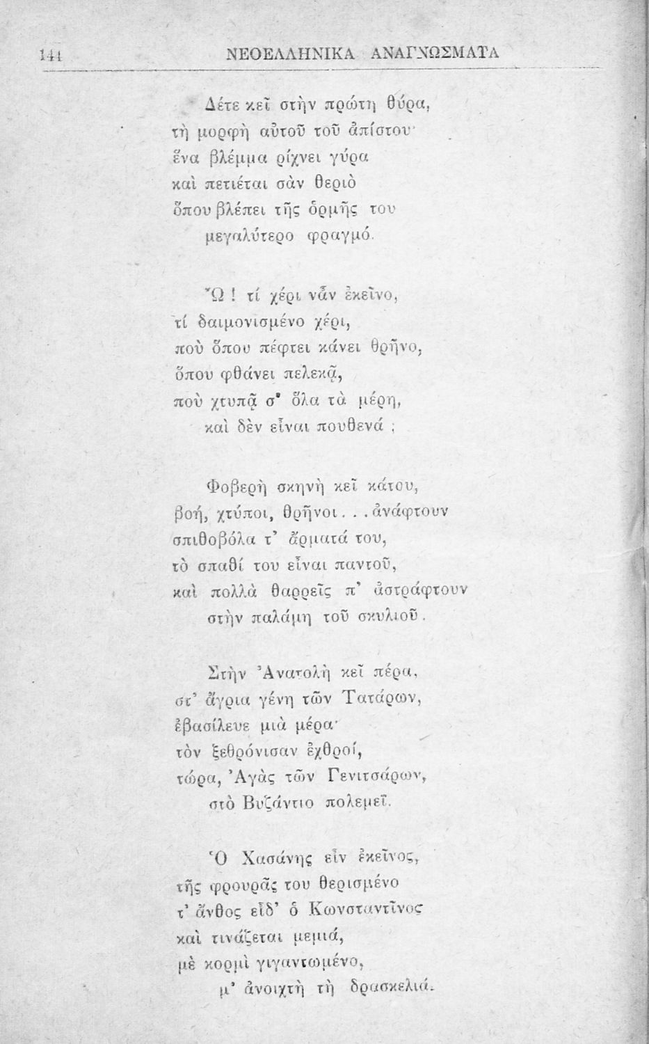 Σχολικό εγχειρίδιο Νέων Ελληνικών Γ' Ελληνικού Σχολείου και Α΄ Αστικού Σχολείου των Θηλέων που περιλαμβάνει ποιήματα και πεζά Ελλήνων συγγραφέων και δημοτικά τραγούδια εμπνευσμένα από την σύγχρονη ελληνική ιστορία, τη βυζαντινή ιστορία, την ελληνική φύση και τη ζωή στην ύπαιθρο, την οικογενειακή ζωή και τη θρησκευτική παράδοση. Περιέχει και παράρτημα με βιογραφίες των συγγραφέων και λεξιλόγιο.