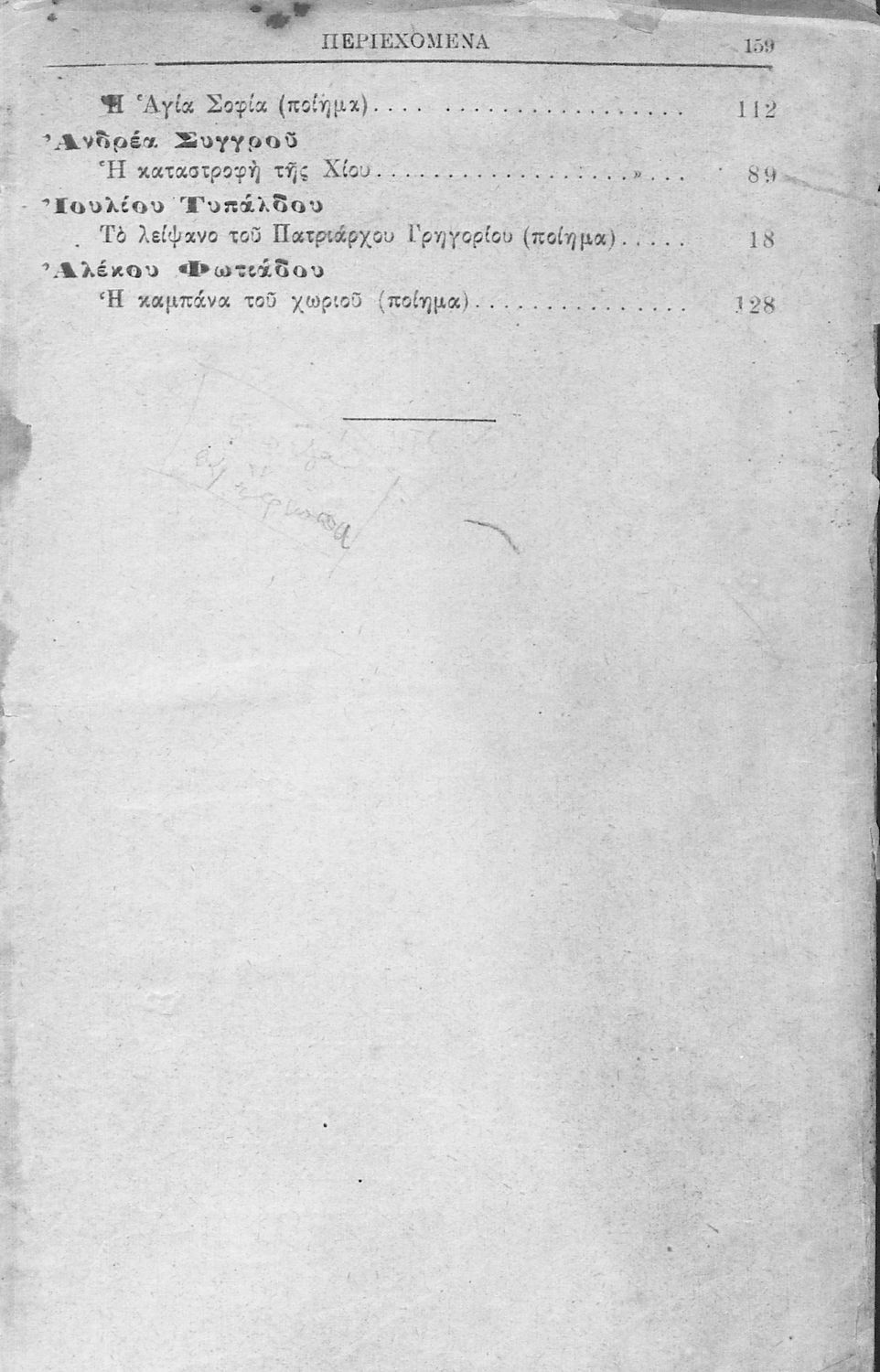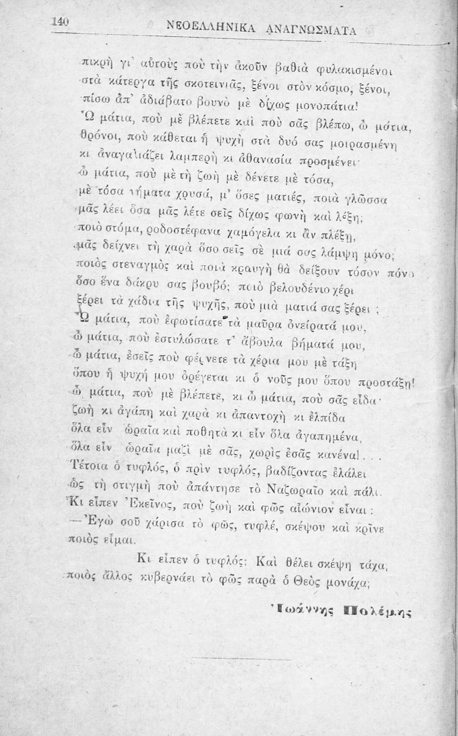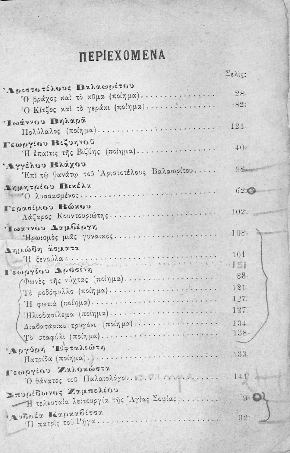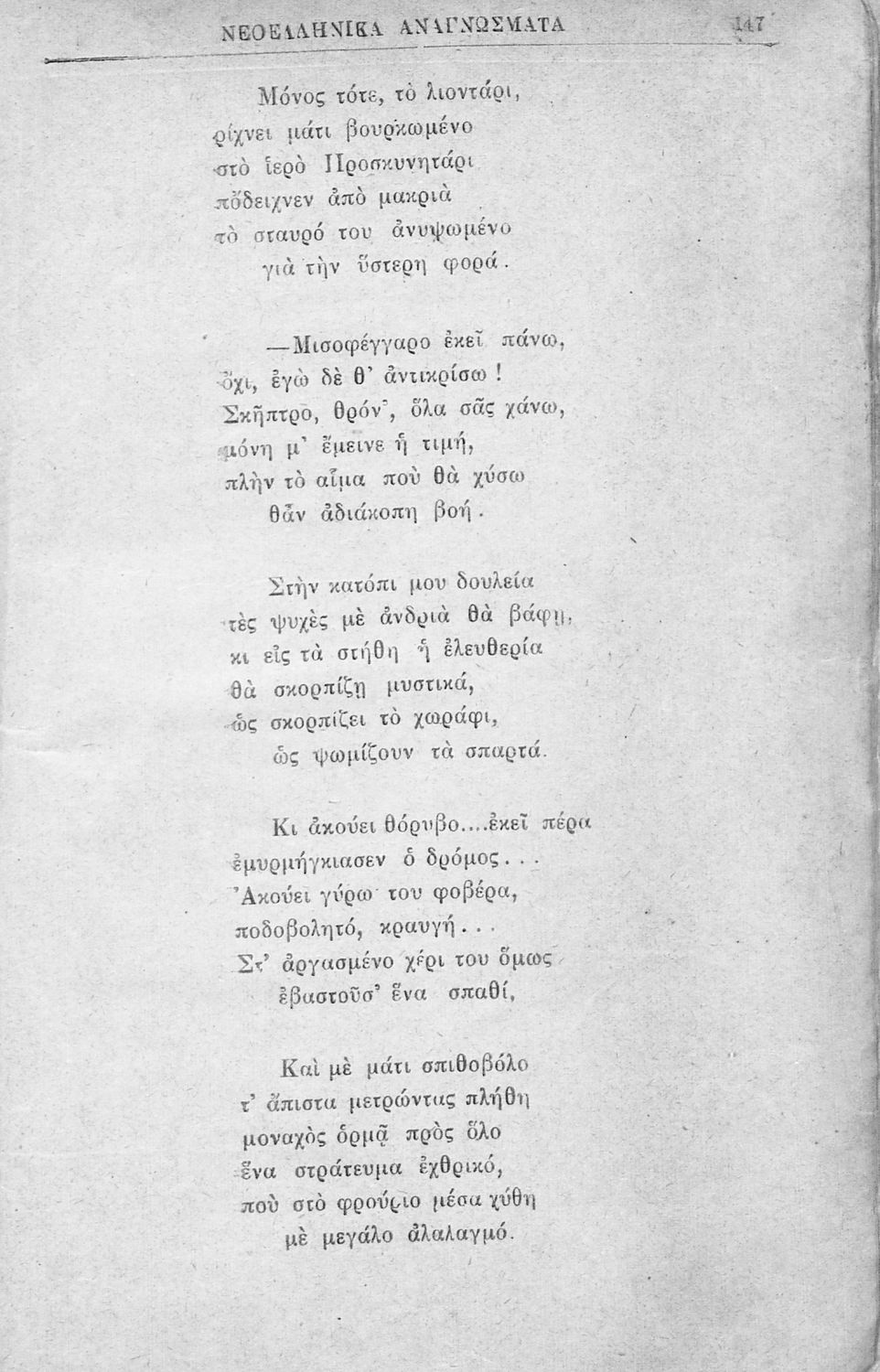 Σχολικό εγχειρίδιο Νέων Ελληνικών Γ' Ελληνικού Σχολείου και Α΄ Αστικού Σχολείου των Θηλέων που περιλαμβάνει ποιήματα και πεζά Ελλήνων συγγραφέων και δημοτικά τραγούδια εμπνευσμένα από την σύγχρονη ελληνική ιστορία, τη βυζαντινή ιστορία, την ελληνική φύση και τη ζωή στην ύπαιθρο, την οικογενειακή ζωή και τη θρησκευτική παράδοση. Περιέχει και παράρτημα με βιογραφίες των συγγραφέων και λεξιλόγιο.