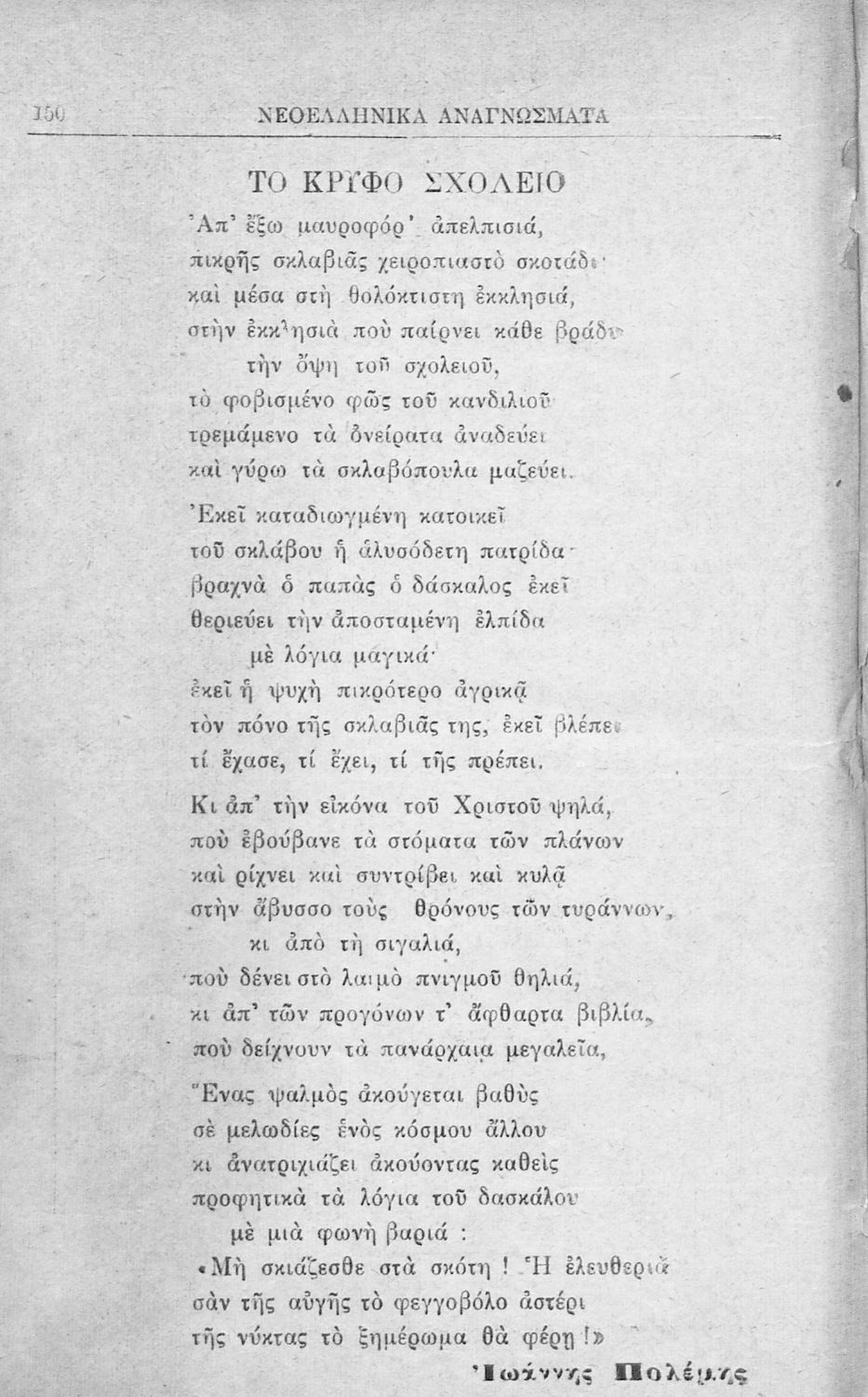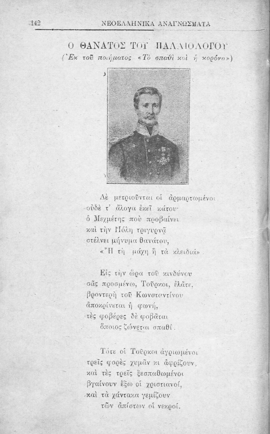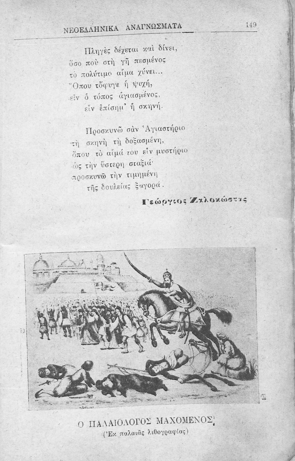 Σχολικό εγχειρίδιο Νέων Ελληνικών Γ' Ελληνικού Σχολείου που περιέχει πεζά και ποιήματα Ελλήνων συγγραφέων και δημοτικά τραγούδια εμπνευσμένα από τη βυζαντινή και σύγχρονη ελληνική ιστορία, και την οικογενειακή
