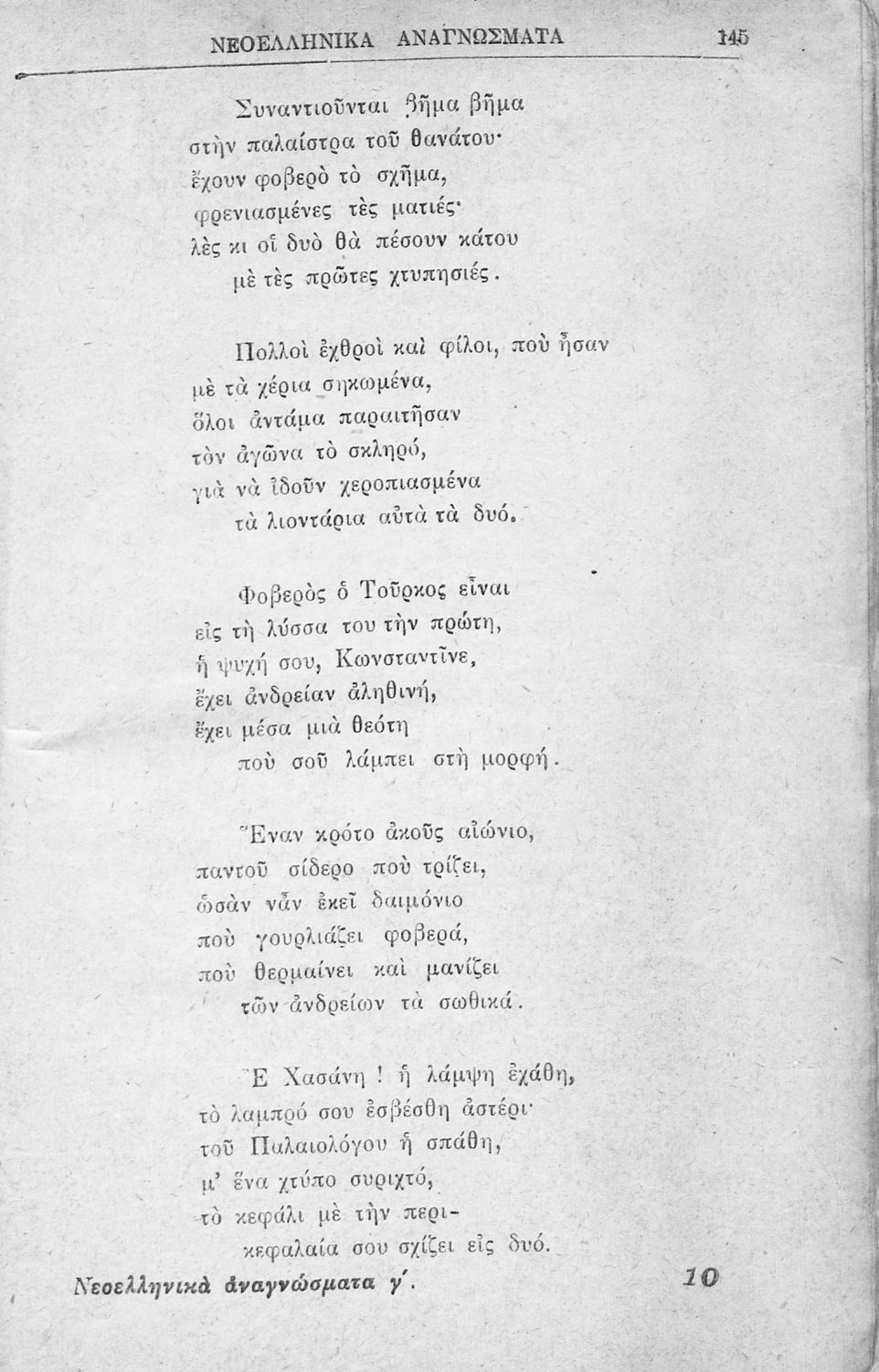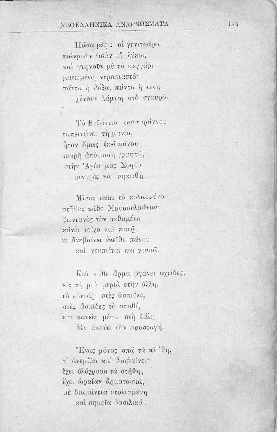 Σχολικό εγχειρίδιο Νέων Ελληνικών Γ' Ελληνικού Σχολείου που περιλαμβάνει ποιήματα και πεζά Ελλήνων συγγραφέων και δημοτικά τραγούδια εμπνευσμένα από την σύγχρονη ελληνική ιστορία, τη βυζαντινή ιστορία, την ...