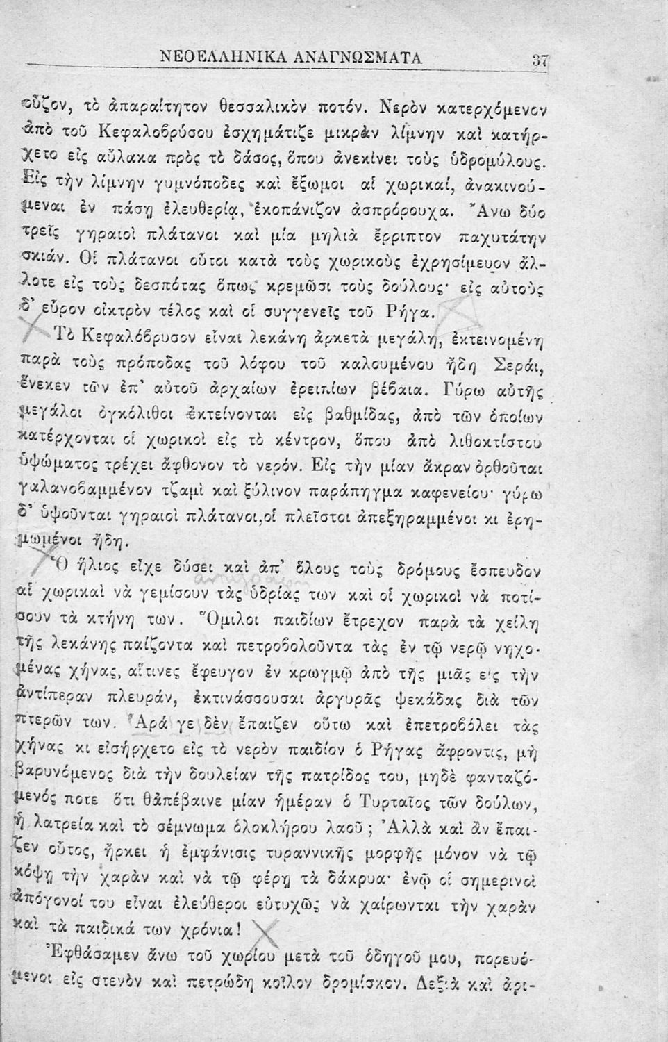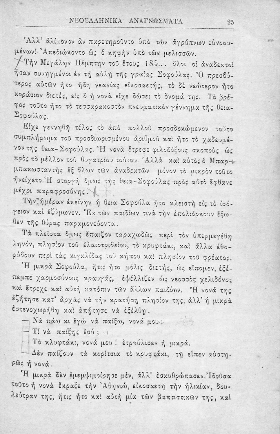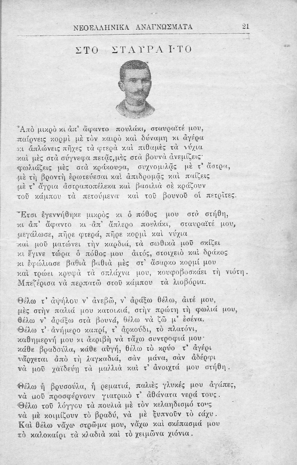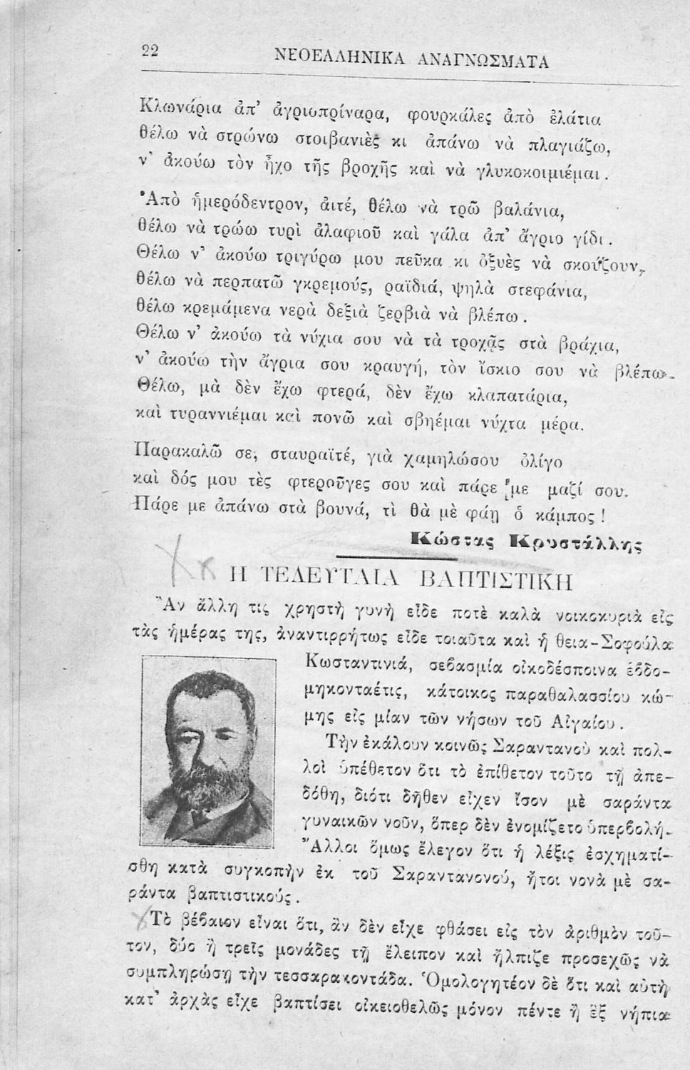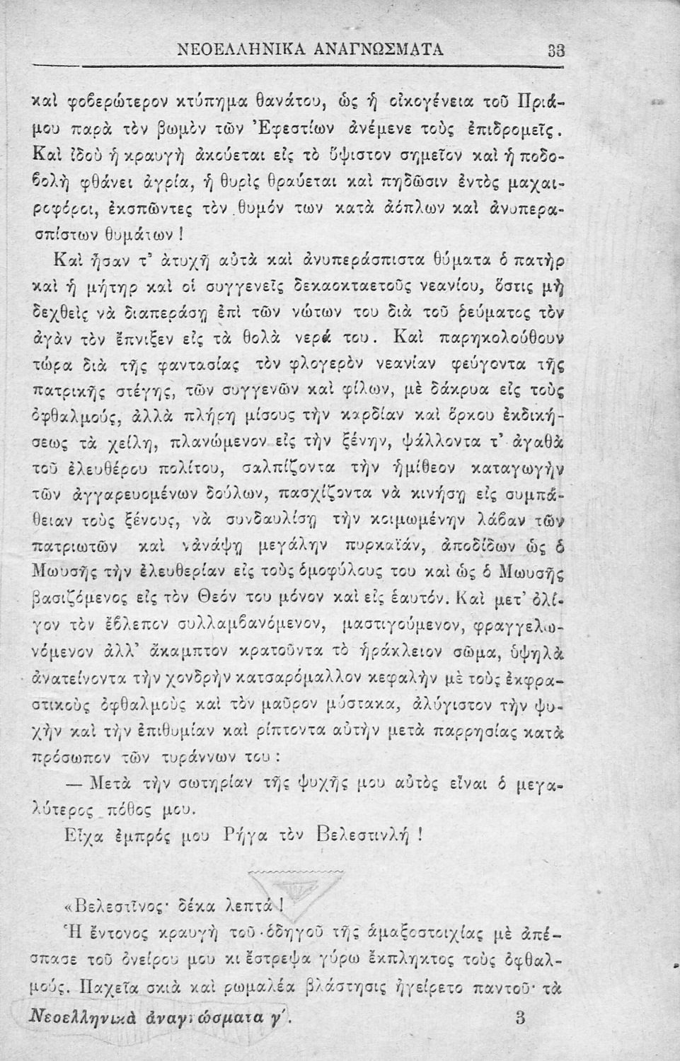 Σχολικό εγχειρίδιο Νέων Ελληνικών Γ' Ελληνικού Σχολείου και Α΄ Αστικού Σχολείου των Θηλέων που περιλαμβάνει ποιήματα και πεζά Ελλήνων συγγραφέων και δημοτικά τραγούδια εμπνευσμένα από την σύγχρονη ελληνική ιστορία, τη βυζαντινή ιστορία, την ελληνική φύση και τη ζωή στην ύπαιθρο, την οικογενειακή ζωή και τη θρησκευτική παράδοση. Περιέχει και παράρτημα με βιογραφίες των συγγραφέων και λεξιλόγιο.