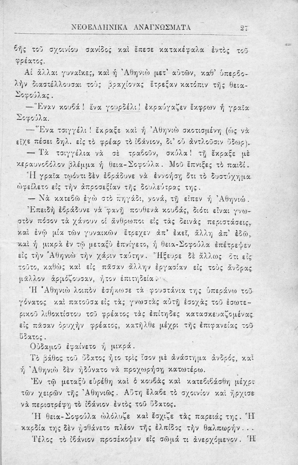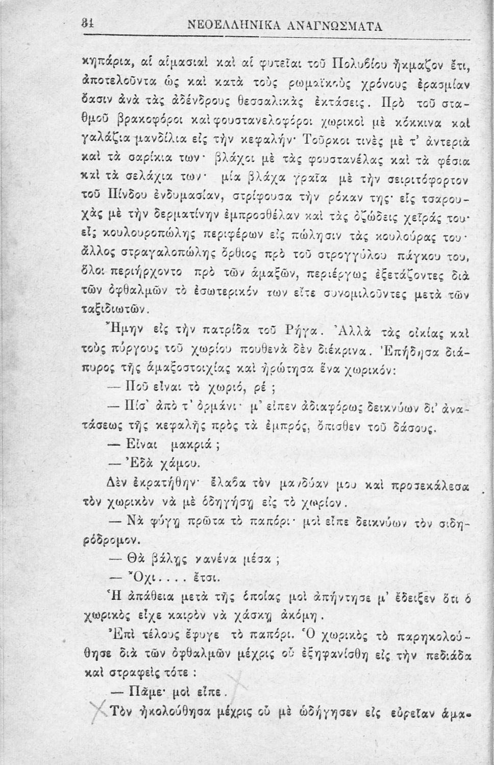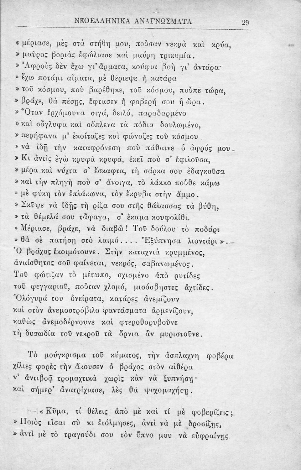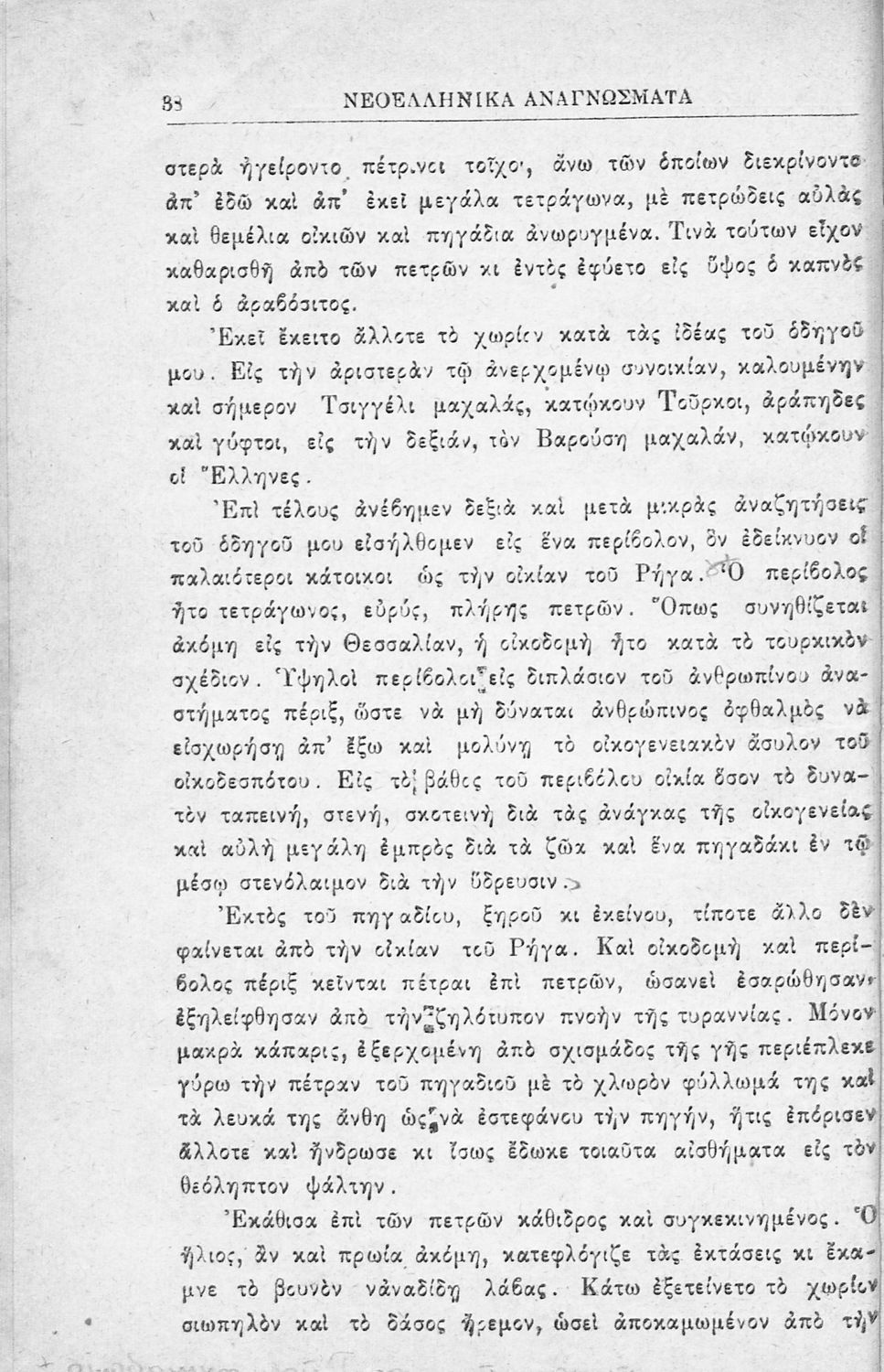 Σχολικό εγχειρίδιο Νέων Ελληνικών Γ' Ελληνικού Σχολείου και Α΄ Αστικού Σχολείου των Θηλέων που περιλαμβάνει ποιήματα και πεζά Ελλήνων συγγραφέων και δημοτικά τραγούδια εμπνευσμένα από την σύγχρονη ελληνική ιστορία, τη βυζαντινή ιστορία, την ελληνική φύση και τη ζωή στην ύπαιθρο, την οικογενειακή ζωή και τη θρησκευτική παράδοση. Περιέχει και παράρτημα με βιογραφίες των συγγραφέων και λεξιλόγιο.