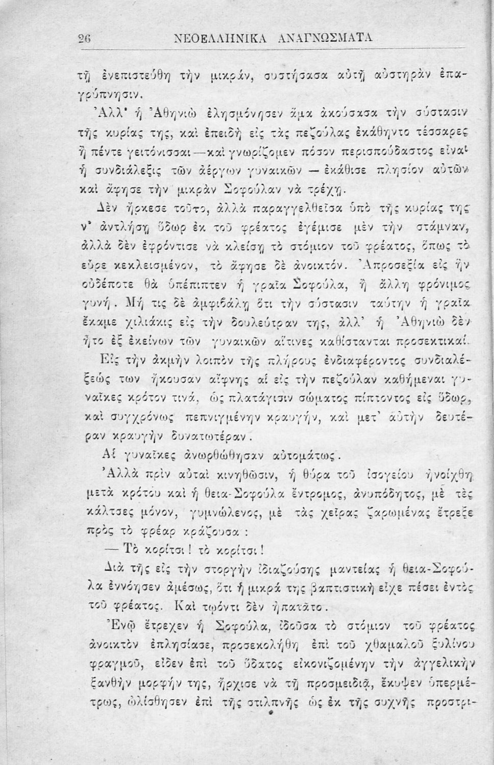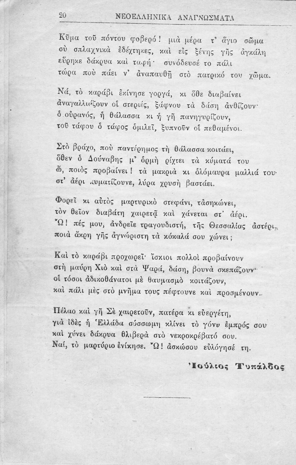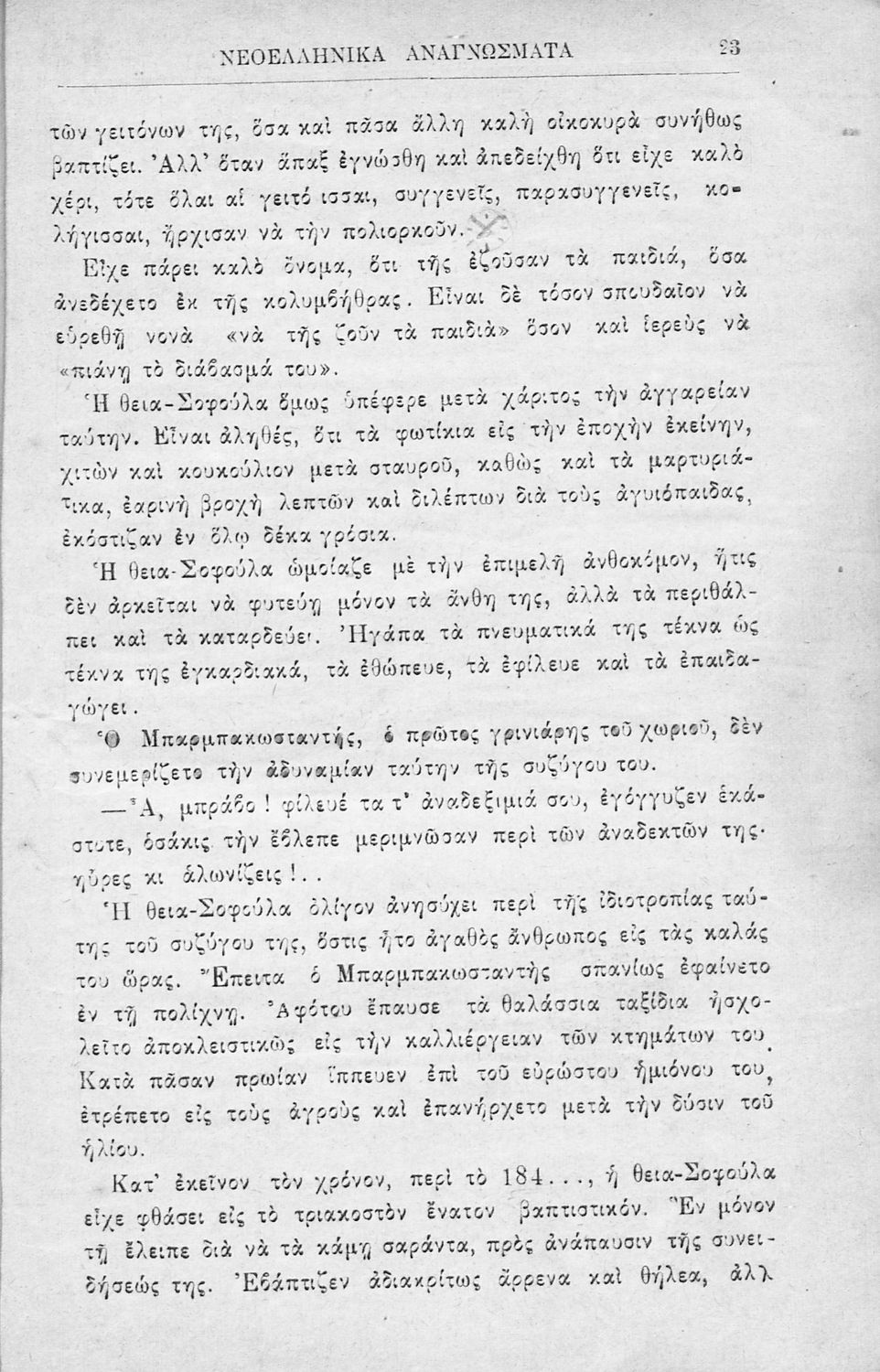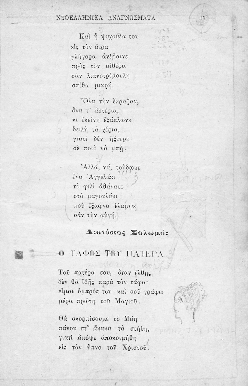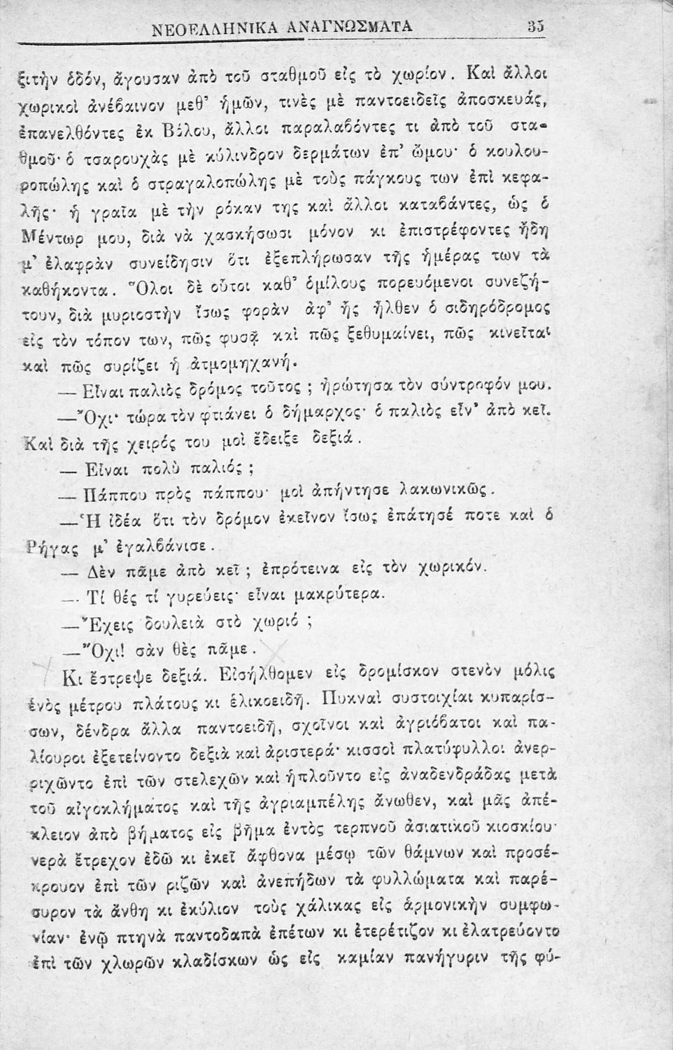 Σχολικό εγχειρίδιο Νέων Ελληνικών Γ' Ελληνικού Σχολείου και Α΄ Αστικού Σχολείου των Θηλέων που περιλαμβάνει ποιήματα και πεζά Ελλήνων συγγραφέων και δημοτικά τραγούδια εμπνευσμένα από την σύγχρονη ελληνική ιστορία, τη βυζαντινή ιστορία, την ελληνική φύση και τη ζωή στην ύπαιθρο, την οικογενειακή ζωή και τη θρησκευτική παράδοση. Περιέχει και παράρτημα με βιογραφίες των συγγραφέων και λεξιλόγιο.