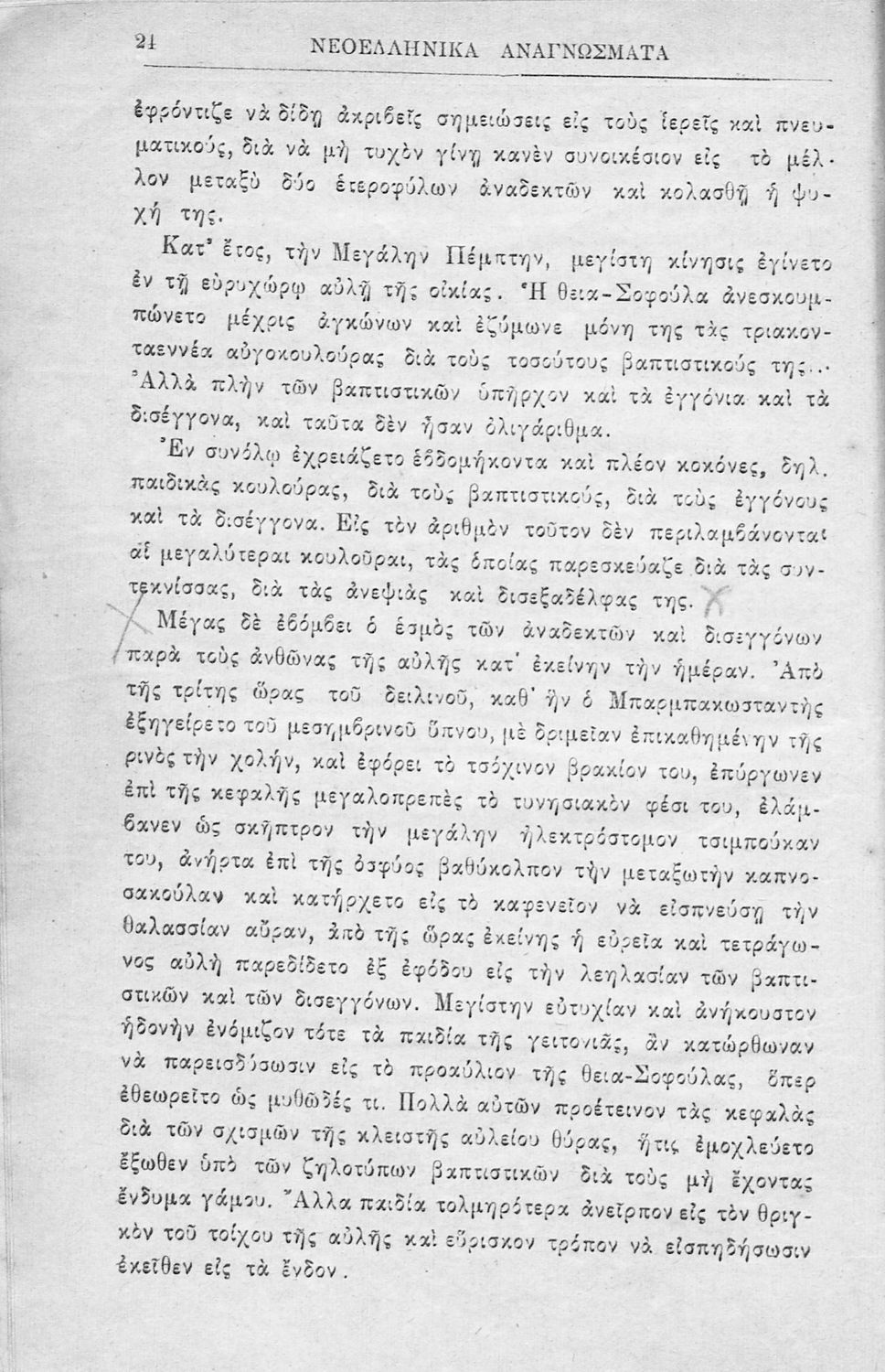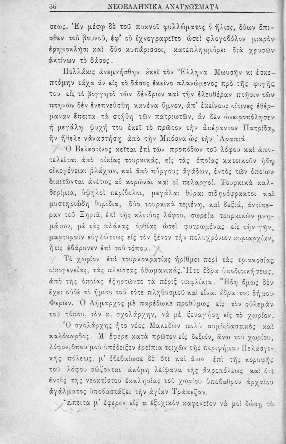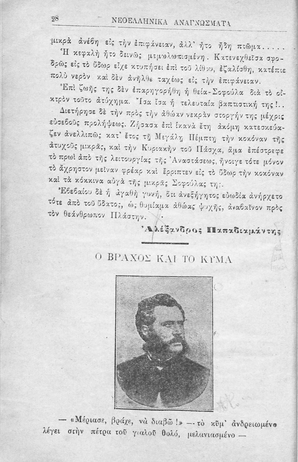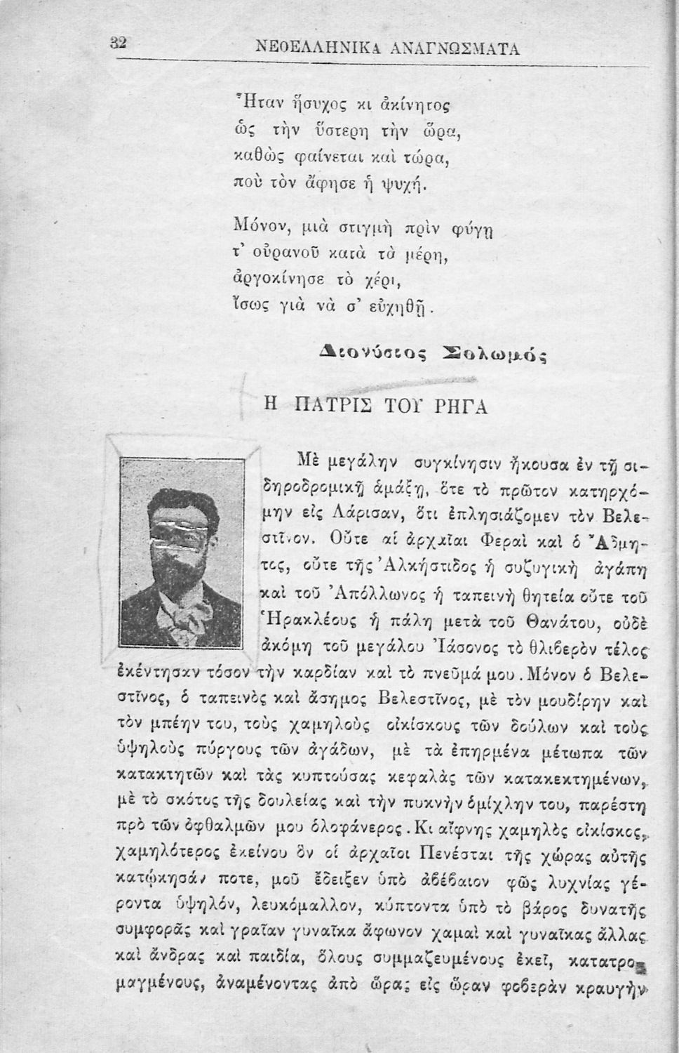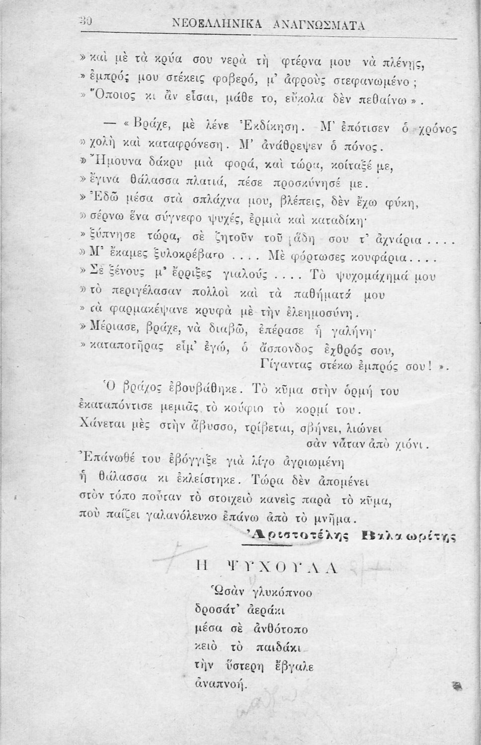Σχολικό εγχειρίδιο Νέων Ελληνικών Γ' Ελληνικού Σχολείου και Α΄ Αστικού Σχολείου των Θηλέων που περιλαμβάνει ποιήματα και πεζά Ελλήνων συγγραφέων και δημοτικά τραγούδια εμπνευσμένα από την σύγχρονη ελληνική ιστορία, τη βυζαντινή ιστορία, την ελληνική φύση και τη ζωή στην ύπαιθρο, την οικογενειακή ζωή και τη θρησκευτική παράδοση. Περιέχει και παράρτημα με βιογραφίες των συγγραφέων και λεξιλόγιο.