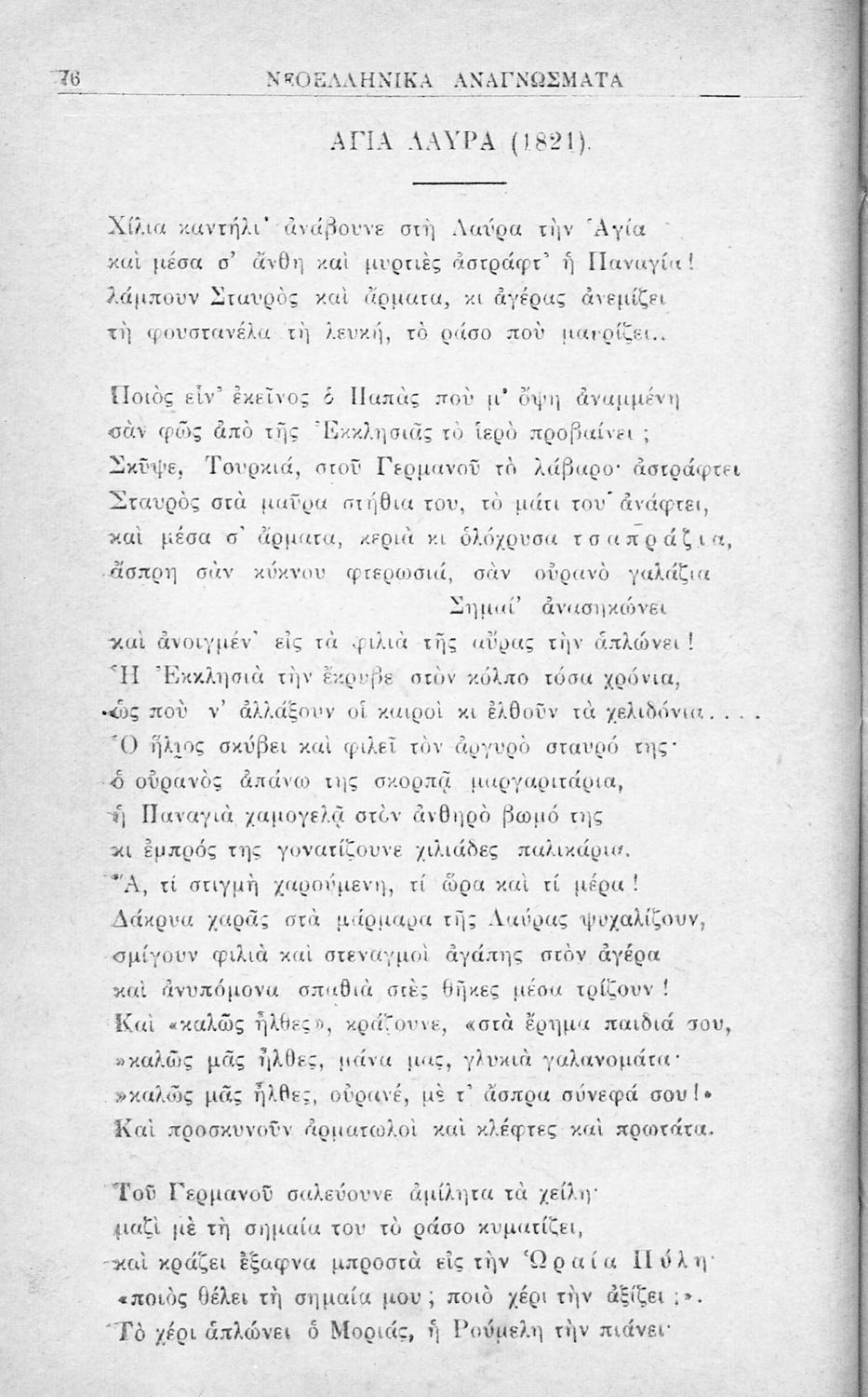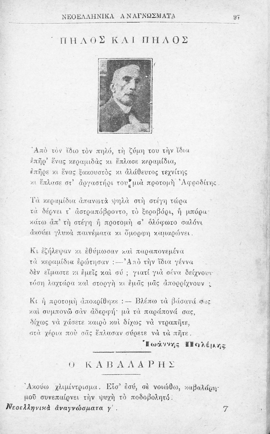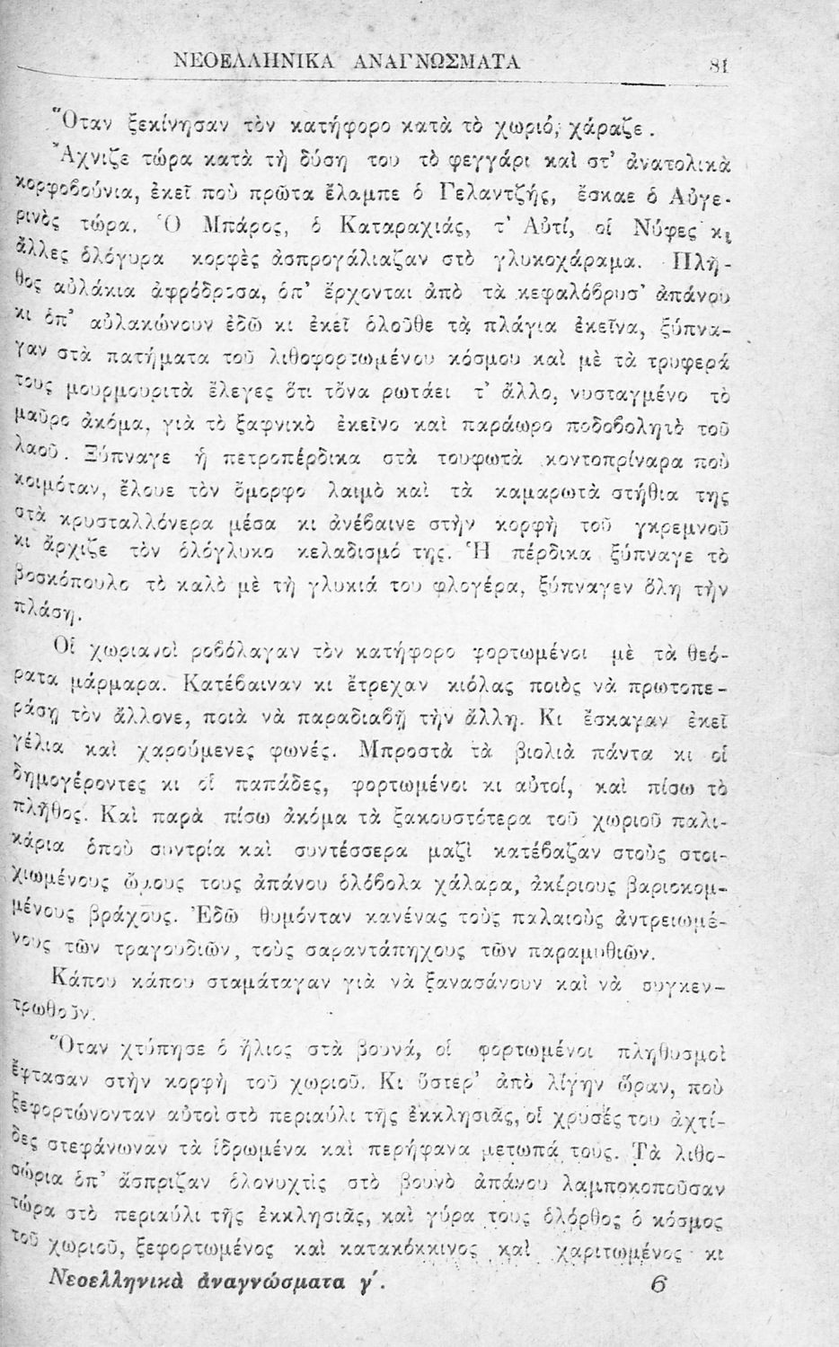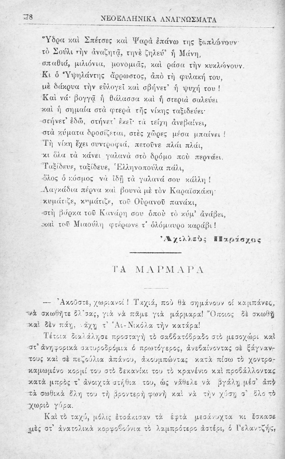 Σχολικό εγχειρίδιο Νέων Ελληνικών Γ' Ελληνικού Σχολείου και Α΄ Αστικού Σχολείου των Θηλέων που περιλαμβάνει ποιήματα και πεζά Ελλήνων συγγραφέων και δημοτικά τραγούδια εμπνευσμένα από την σύγχρονη ελληνική ιστορία, τη βυζαντινή ιστορία, την ελληνική φύση και τη ζωή στην ύπαιθρο, την οικογενειακή ζωή και τη θρησκευτική παράδοση. Περιέχει και παράρτημα με βιογραφίες των συγγραφέων και λεξιλόγιο.