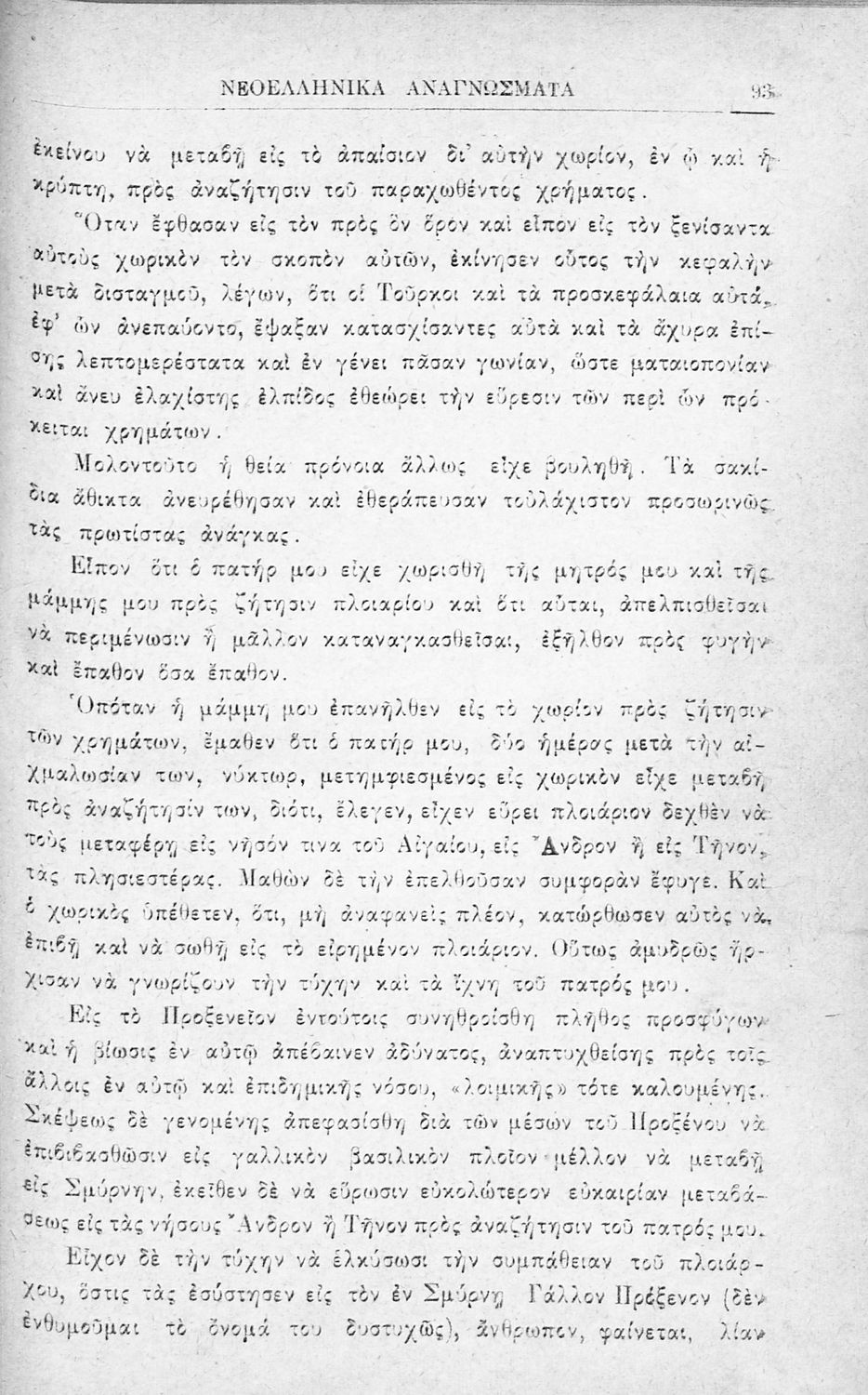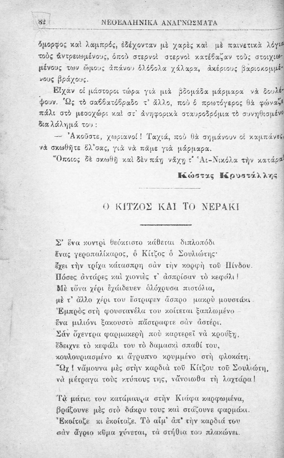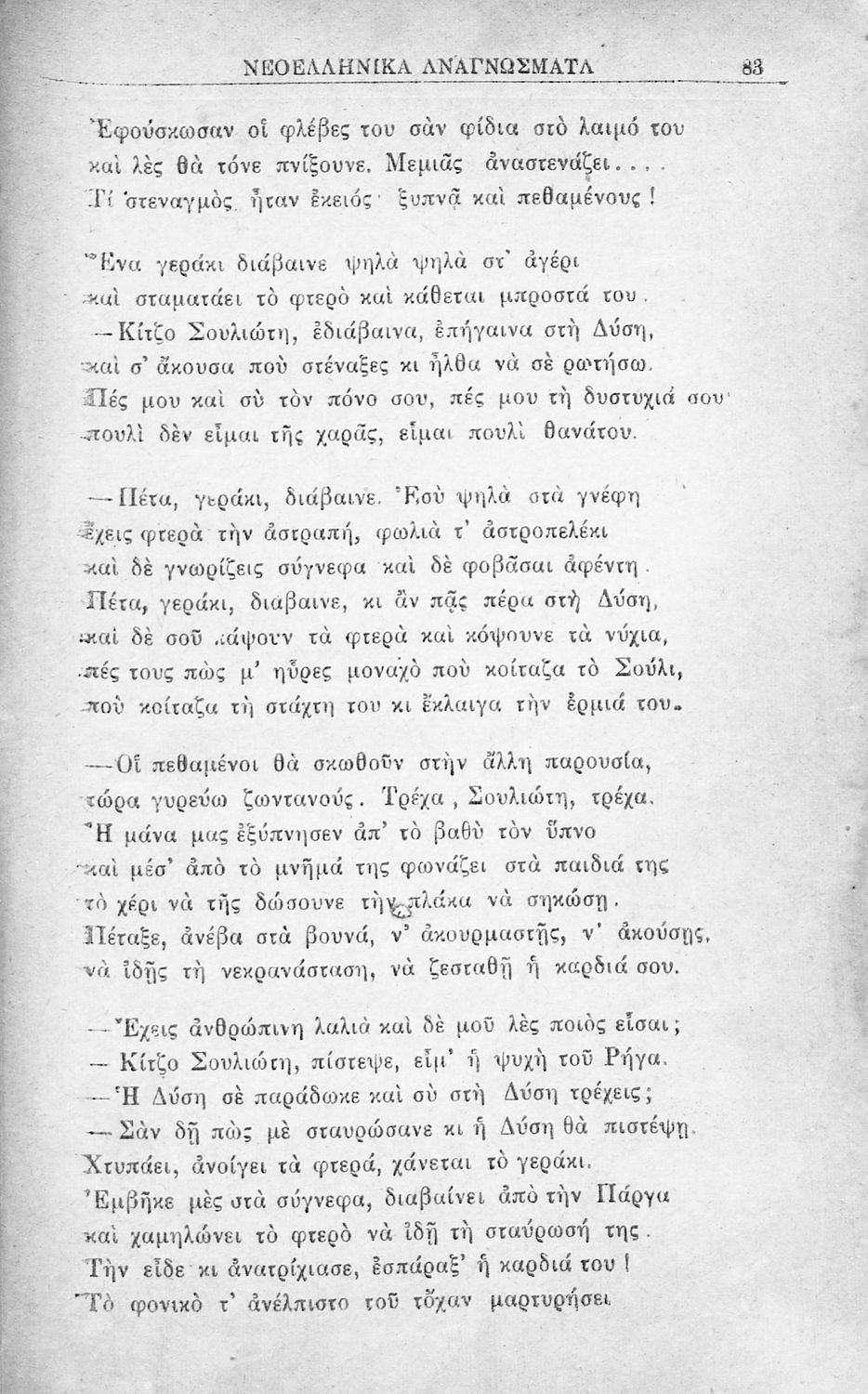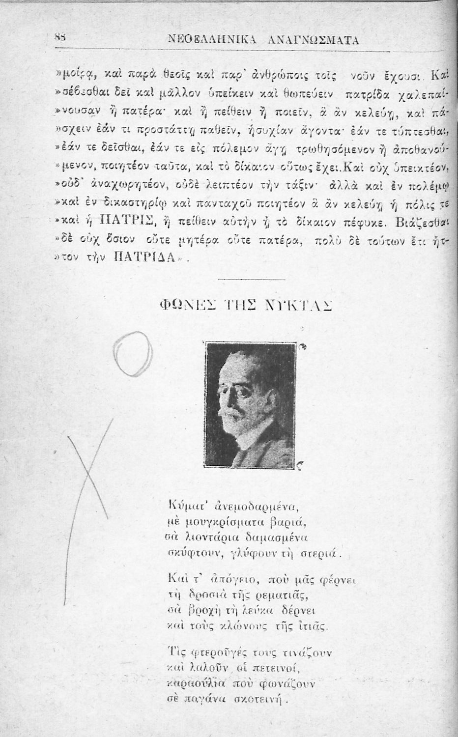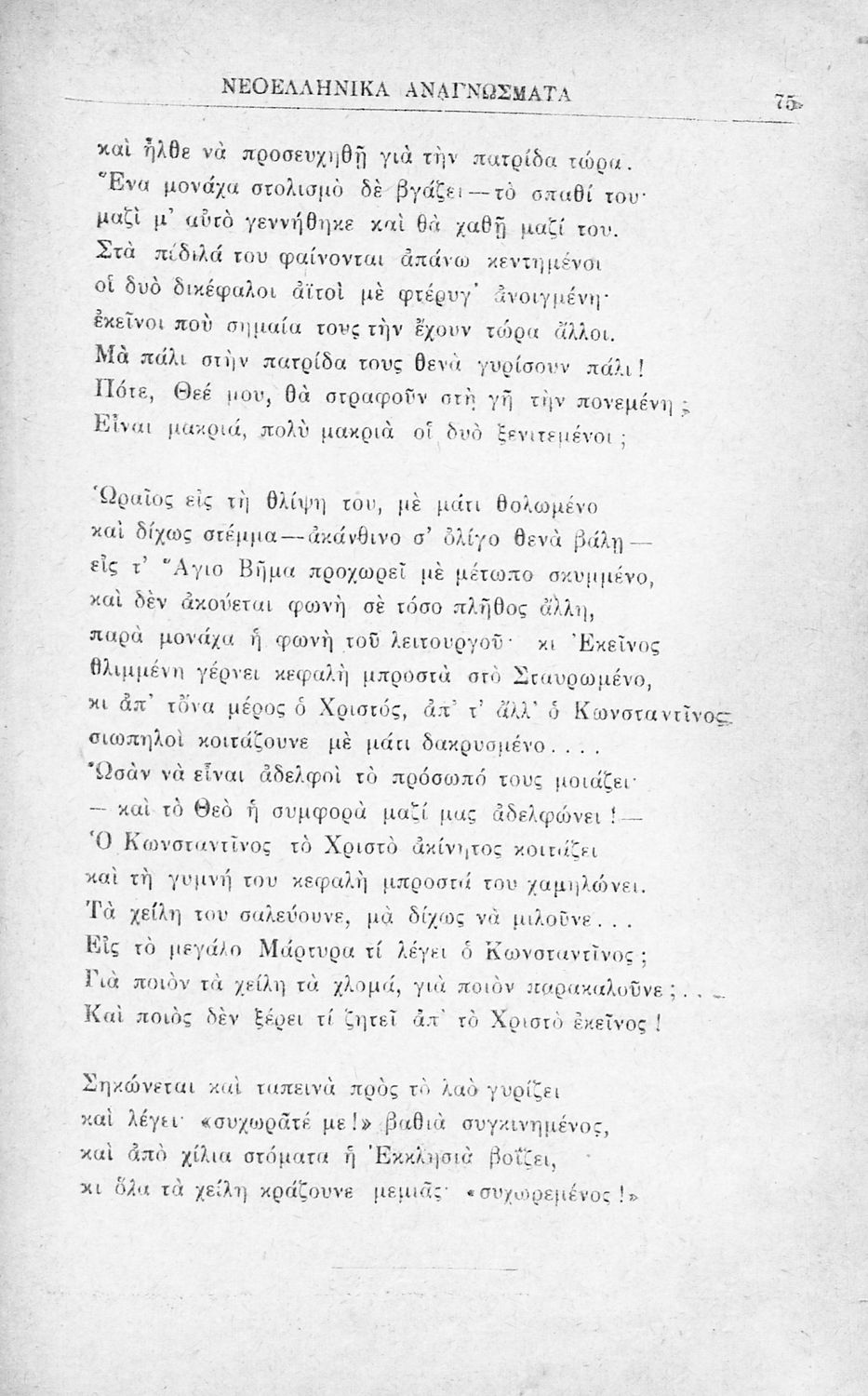 Σχολικό εγχειρίδιο Νέων Ελληνικών Γ' Ελληνικού Σχολείου και Α΄ Αστικού Σχολείου των Θηλέων που περιλαμβάνει ποιήματα και πεζά Ελλήνων συγγραφέων και δημοτικά τραγούδια εμπνευσμένα από την σύγχρονη ελληνική ιστορία, τη βυζαντινή ιστορία, την ελληνική φύση και τη ζωή στην ύπαιθρο, την οικογενειακή ζωή και τη θρησκευτική παράδοση. Περιέχει και παράρτημα με βιογραφίες των συγγραφέων και λεξιλόγιο.