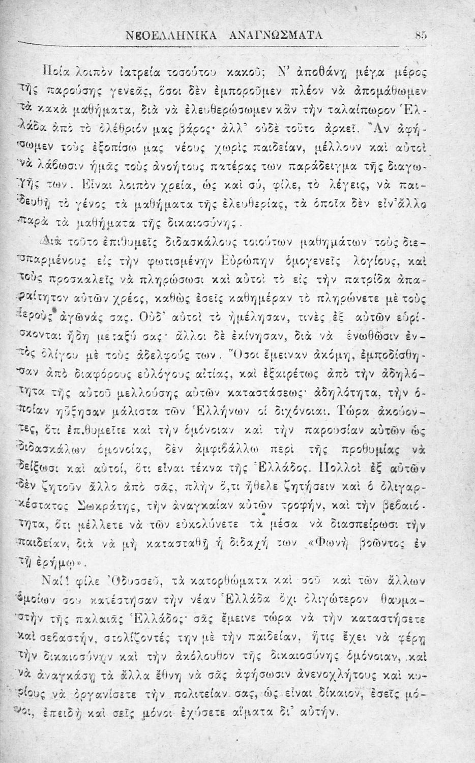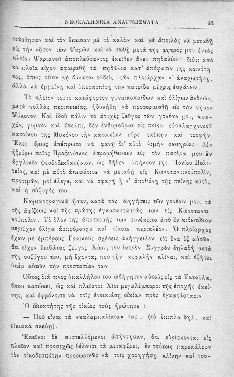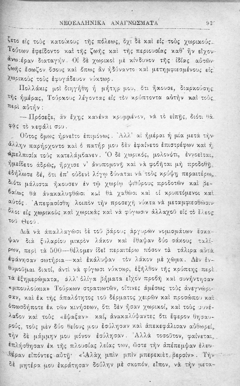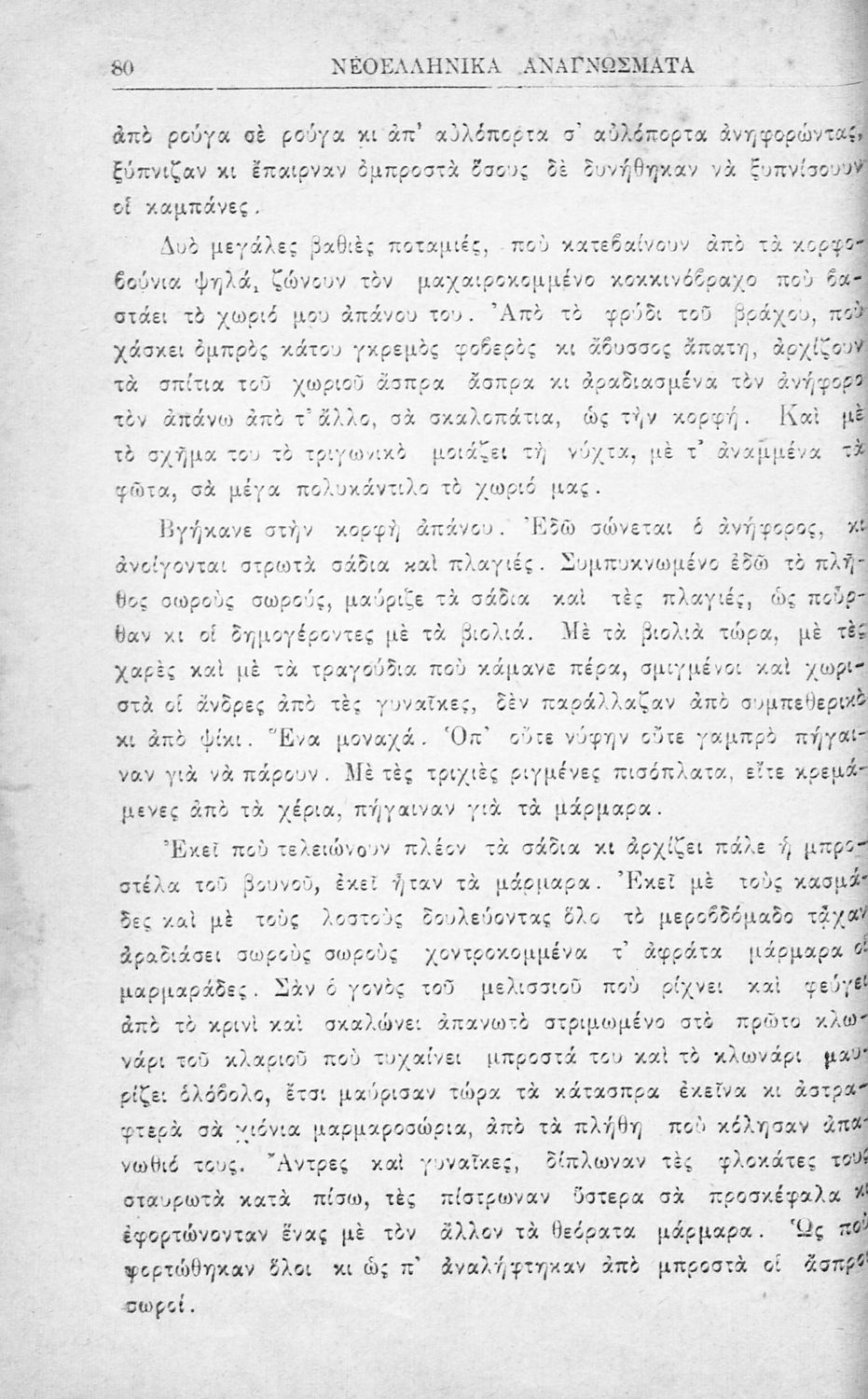 Σχολικό εγχειρίδιο Νέων Ελληνικών Γ' Ελληνικού Σχολείου και Α΄ Αστικού Σχολείου των Θηλέων που περιλαμβάνει ποιήματα και πεζά Ελλήνων συγγραφέων και δημοτικά τραγούδια εμπνευσμένα από την σύγχρονη ελληνική ιστορία, τη βυζαντινή ιστορία, την ελληνική φύση και τη ζωή στην ύπαιθρο, την οικογενειακή ζωή και τη θρησκευτική παράδοση. Περιέχει και παράρτημα με βιογραφίες των συγγραφέων και λεξιλόγιο.