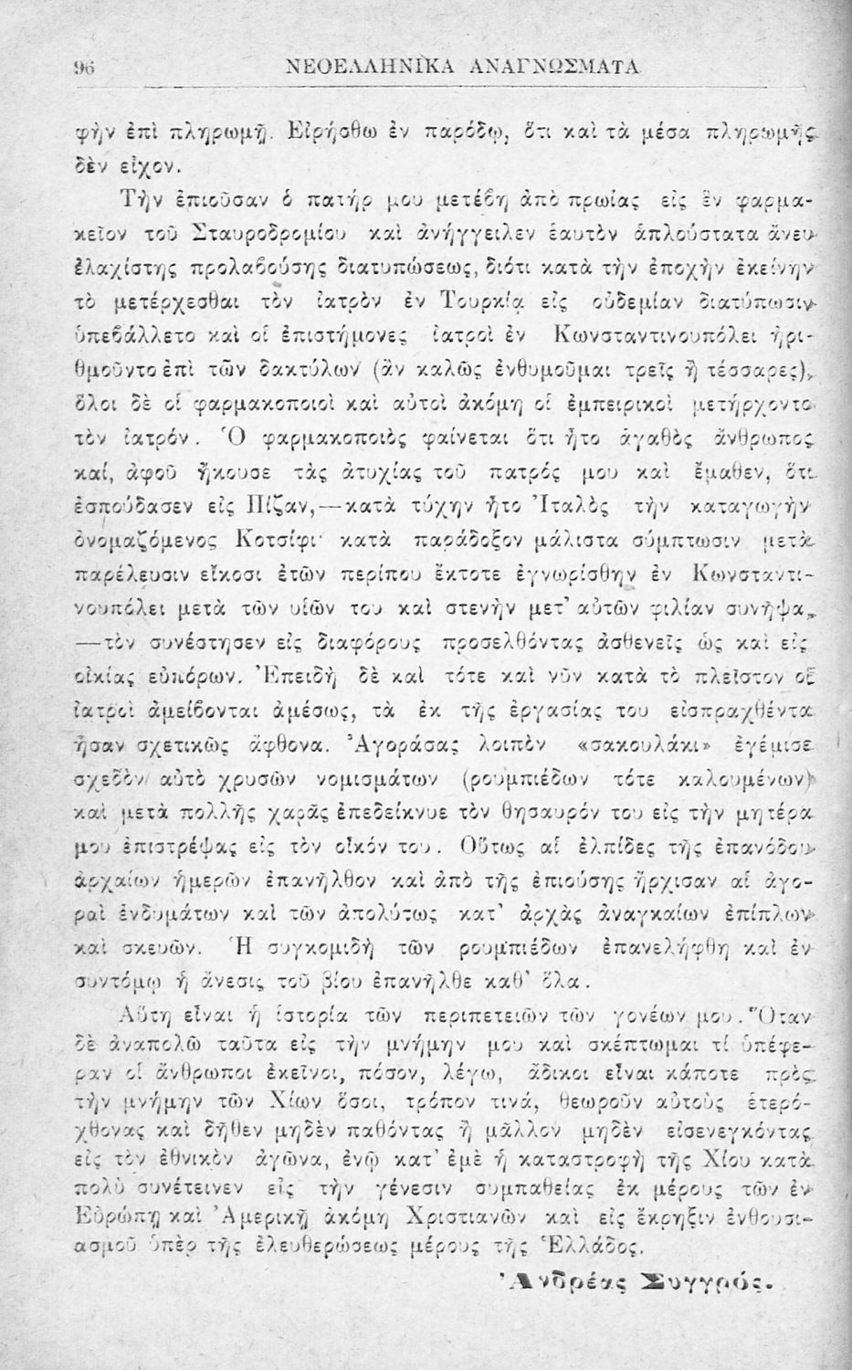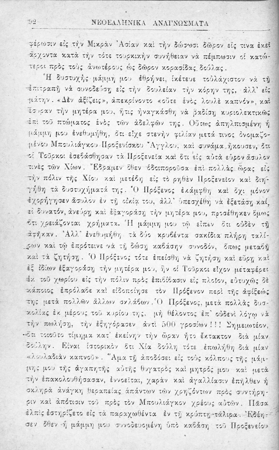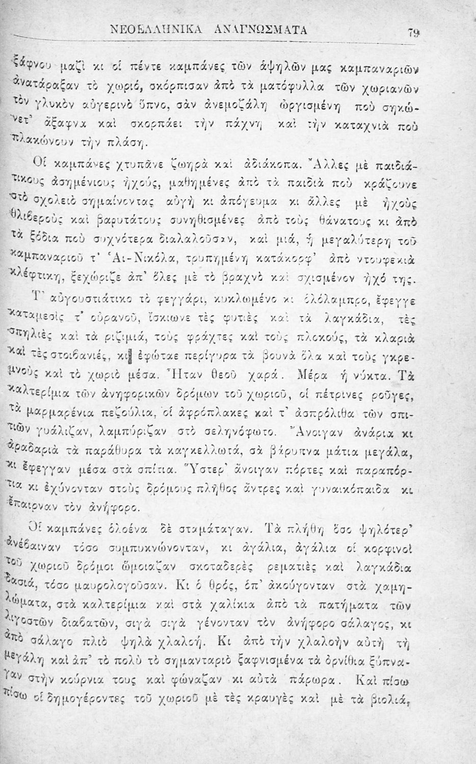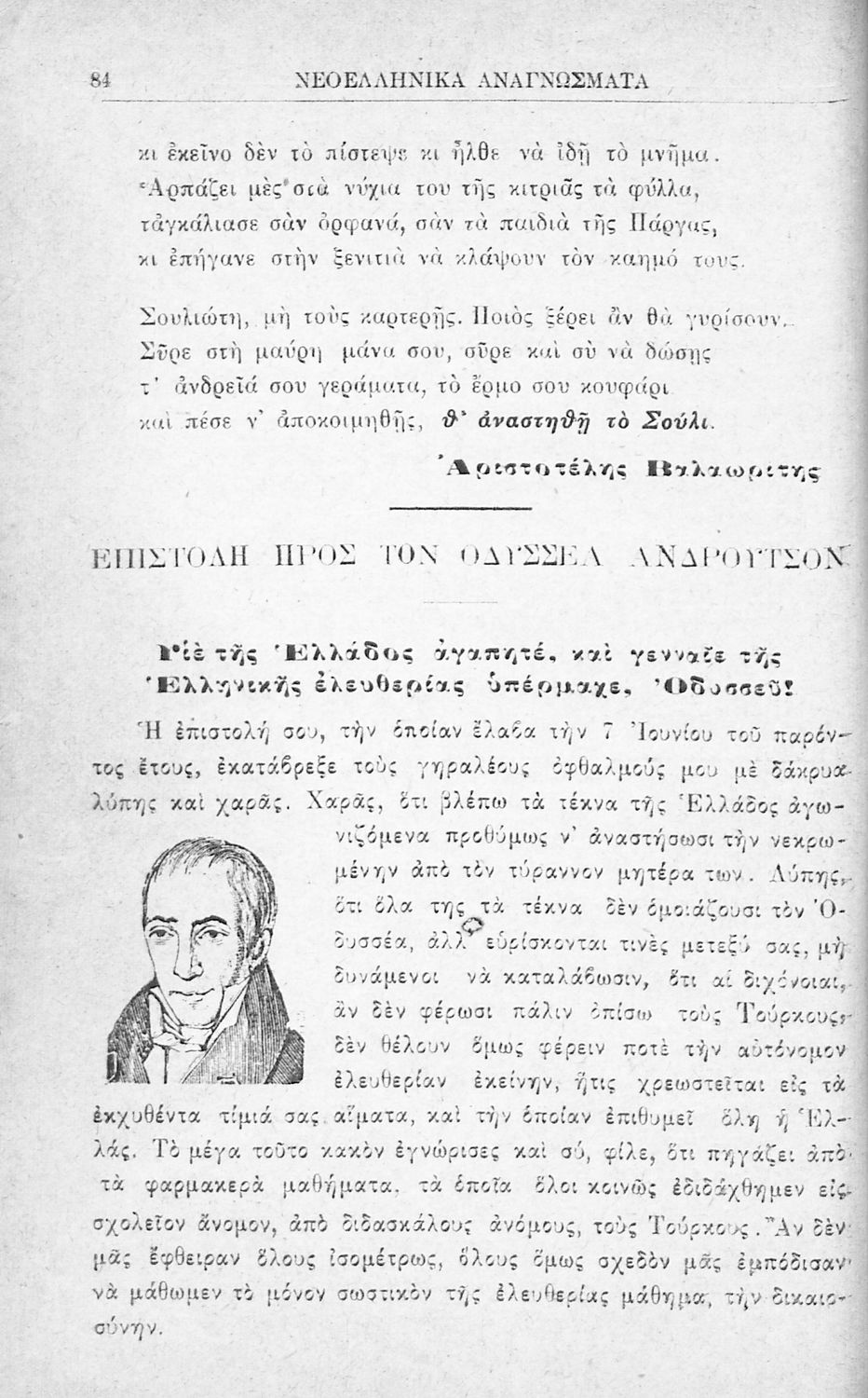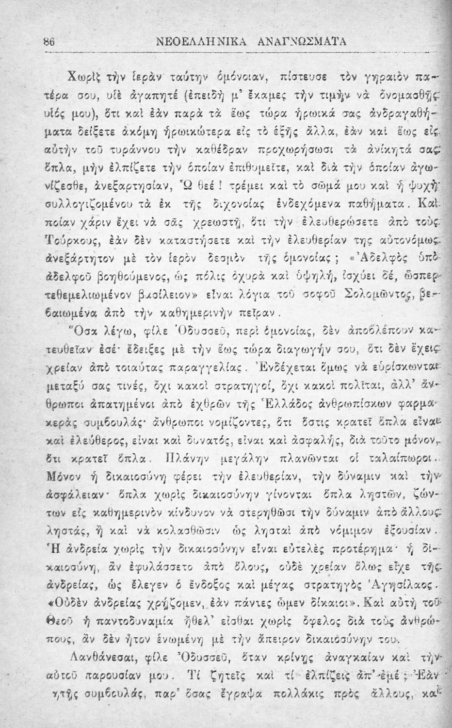Σχολικό εγχειρίδιο Νέων Ελληνικών Γ' Ελληνικού Σχολείου και Α΄ Αστικού Σχολείου των Θηλέων που περιλαμβάνει ποιήματα και πεζά Ελλήνων συγγραφέων και δημοτικά τραγούδια εμπνευσμένα από την σύγχρονη ελληνική ιστορία, τη βυζαντινή ιστορία, την ελληνική φύση και τη ζωή στην ύπαιθρο, την οικογενειακή ζωή και τη θρησκευτική παράδοση. Περιέχει και παράρτημα με βιογραφίες των συγγραφέων και λεξιλόγιο.