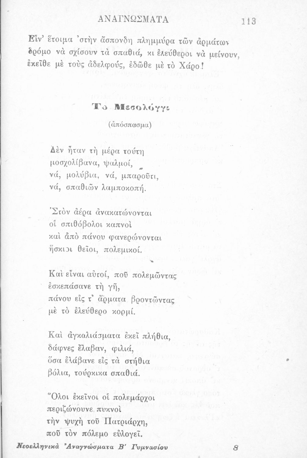 Σχολικό εγχειρίδιο Νέων Ελληνικών Β΄ Γυμνασίου που περιλαμβάνει ποιήματα και πεζά Ελλήνων συγγραφέων και δημοτικά τραγούδια εμπνευσμένα από την σύγχρονη ελληνική ιστορία, τη βυζαντινή ιστορία, την ελληνική ...