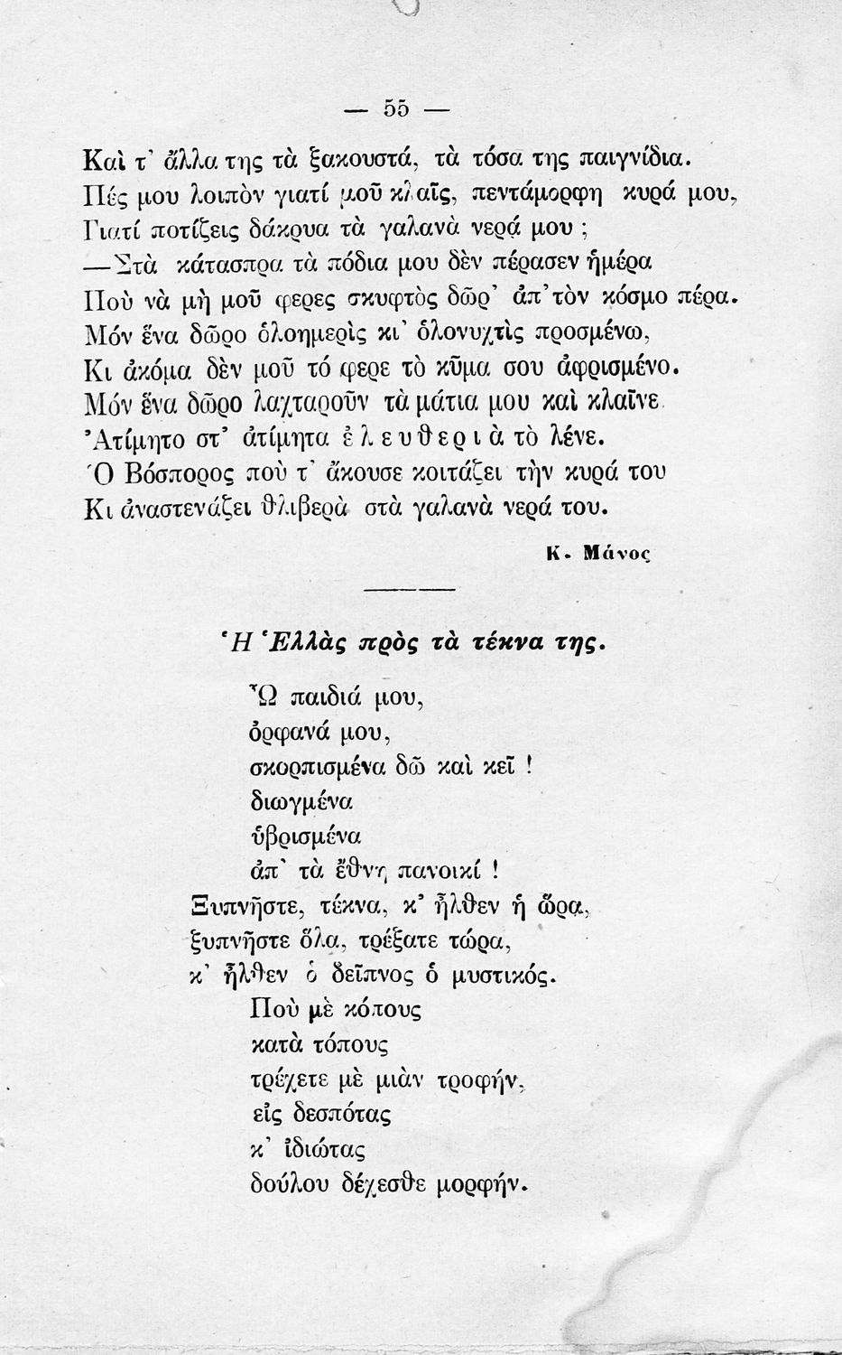 Σχολικό εγχειρίδιο για την Β΄ Γυμνασίου και την Γ΄ Αστικού Θηλέων για το μάθημα των Νέων Ελληνικών. Το εγχειρίδιο αποτελείται από κείμενα πεζού λόγου, επικολυρικά ποιήματα, ωδές, ηθογραφικά διηγήματα, ρητορικά