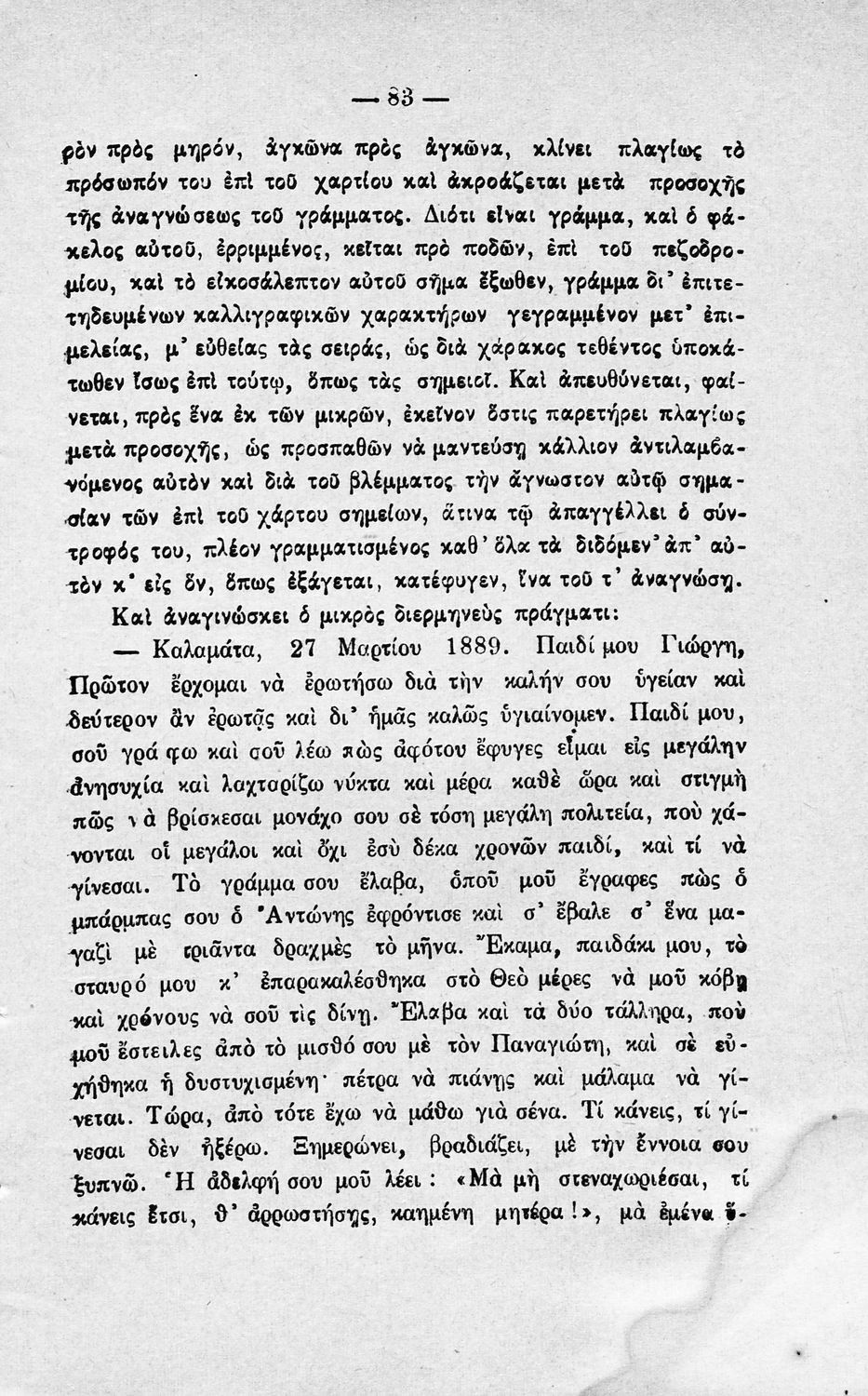 Σχολικό εγχειρίδιο για την Β΄ Γυμνασίου και την Γ΄ Αστικού Θηλέων για το μάθημα των Νέων Ελληνικών. Το εγχειρίδιο αποτελείται από κείμενα πεζού λόγου, επικολυρικά ποιήματα, ωδές, ηθογραφικά διηγήματα, ρητορικά