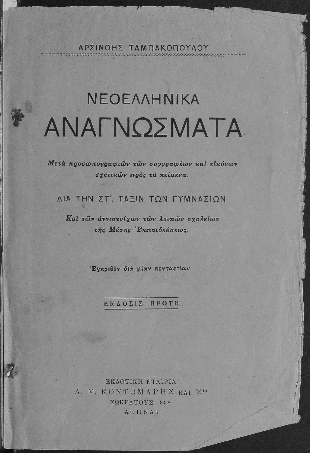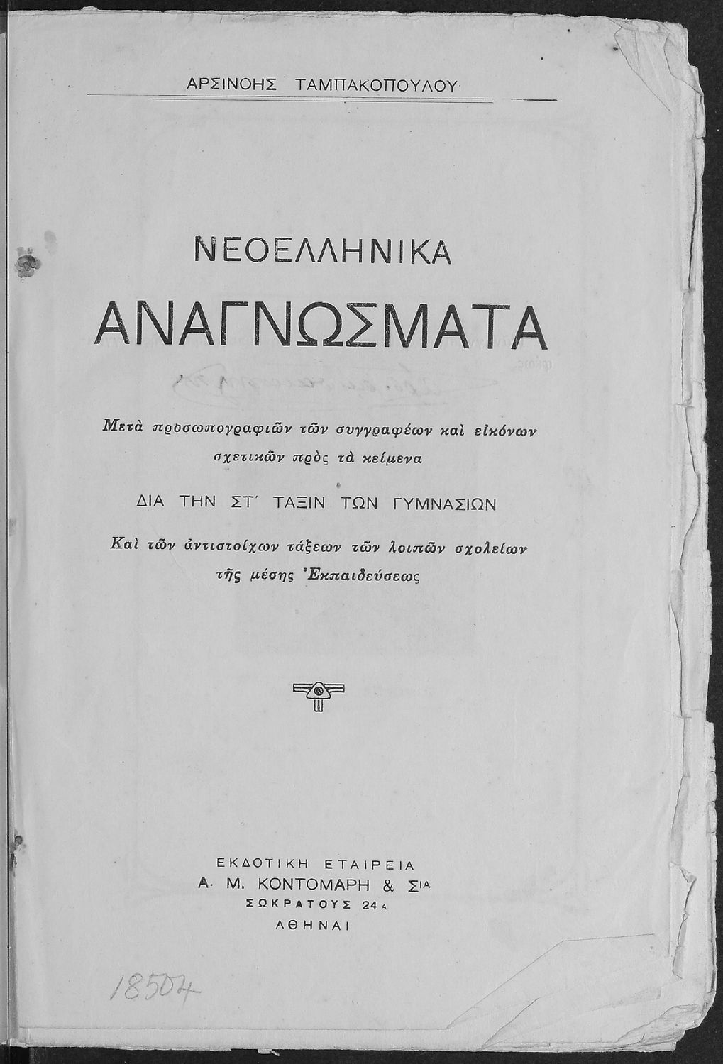 Κωδικός αναγνώρισης: 01-18504 Τίτλος: Νεοελληνικά αναγνώσματα δια την ΣΤ΄ τάξιν των Γυμνασίων και των αντιστοίχων τάξεων των λοιπών σχολείων της Μέσης Εκπαιδεύσεως Συγγραφέας: Αρσινόη Ταμπακοπούλου Μέγεθος και υπόστρωμα: Σχολικό εγχειρίδιο, 21εκ., μαλακό εξώφυλλο, 328 σελίδες. |