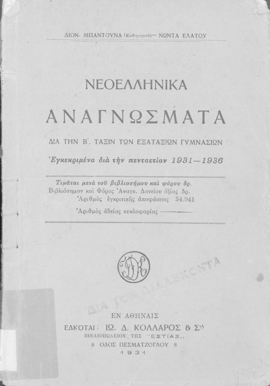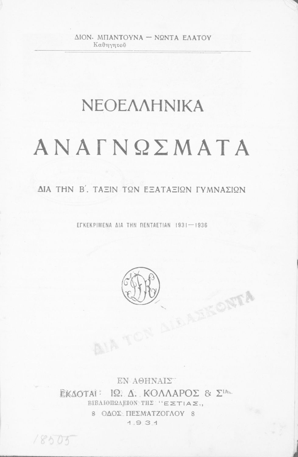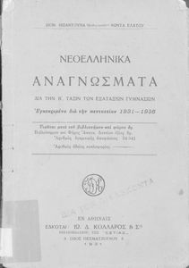 Τίτλος: Νεοελληνικά αναγνώσματα διά την Β΄ τάξιν των Εξαταξίων Γυμνασίων