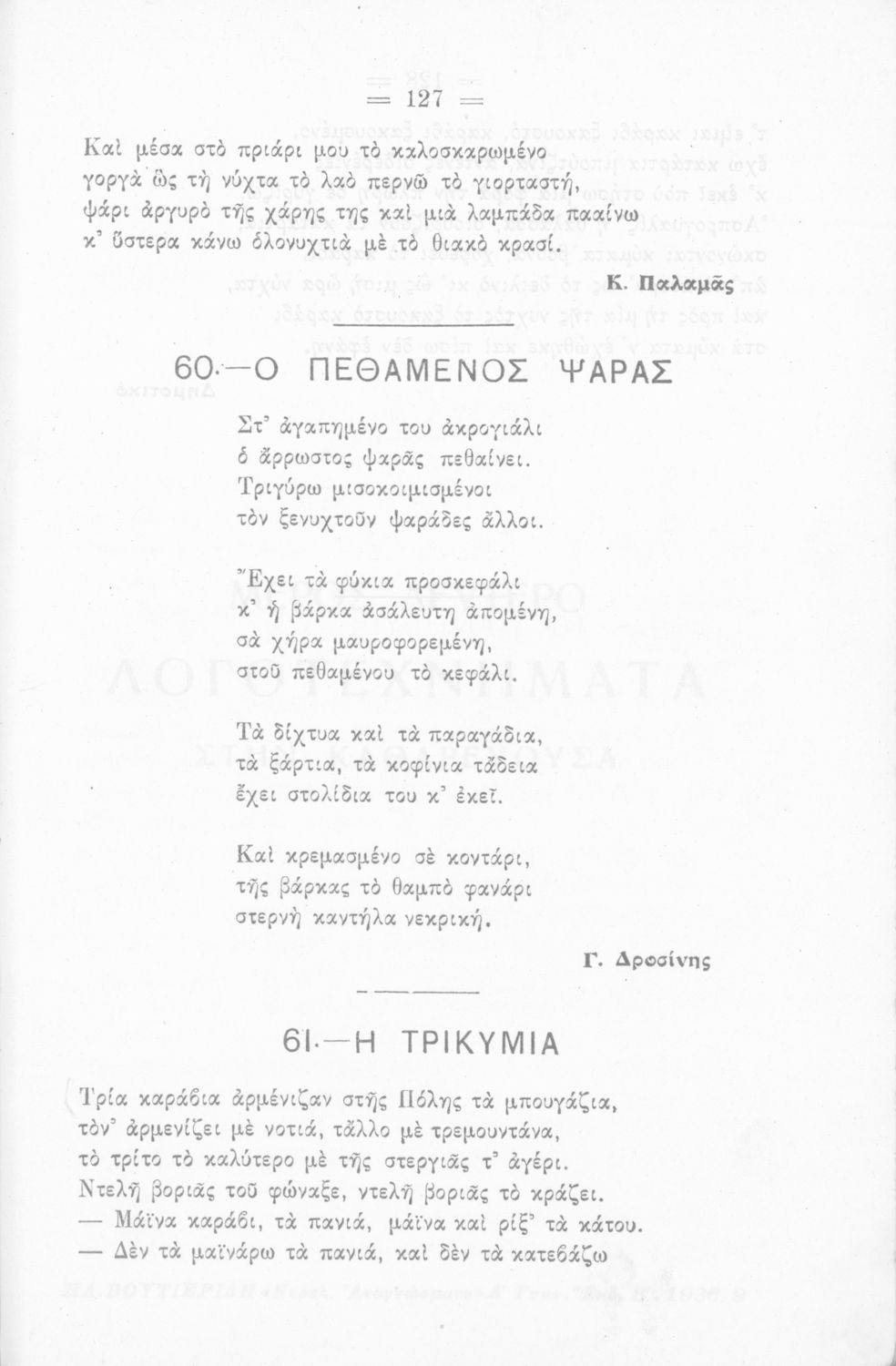 Σχετιζόμενοι όροι:  Παπαντωνίου, Πολέμης, Παλαμάς, Βηλαράς