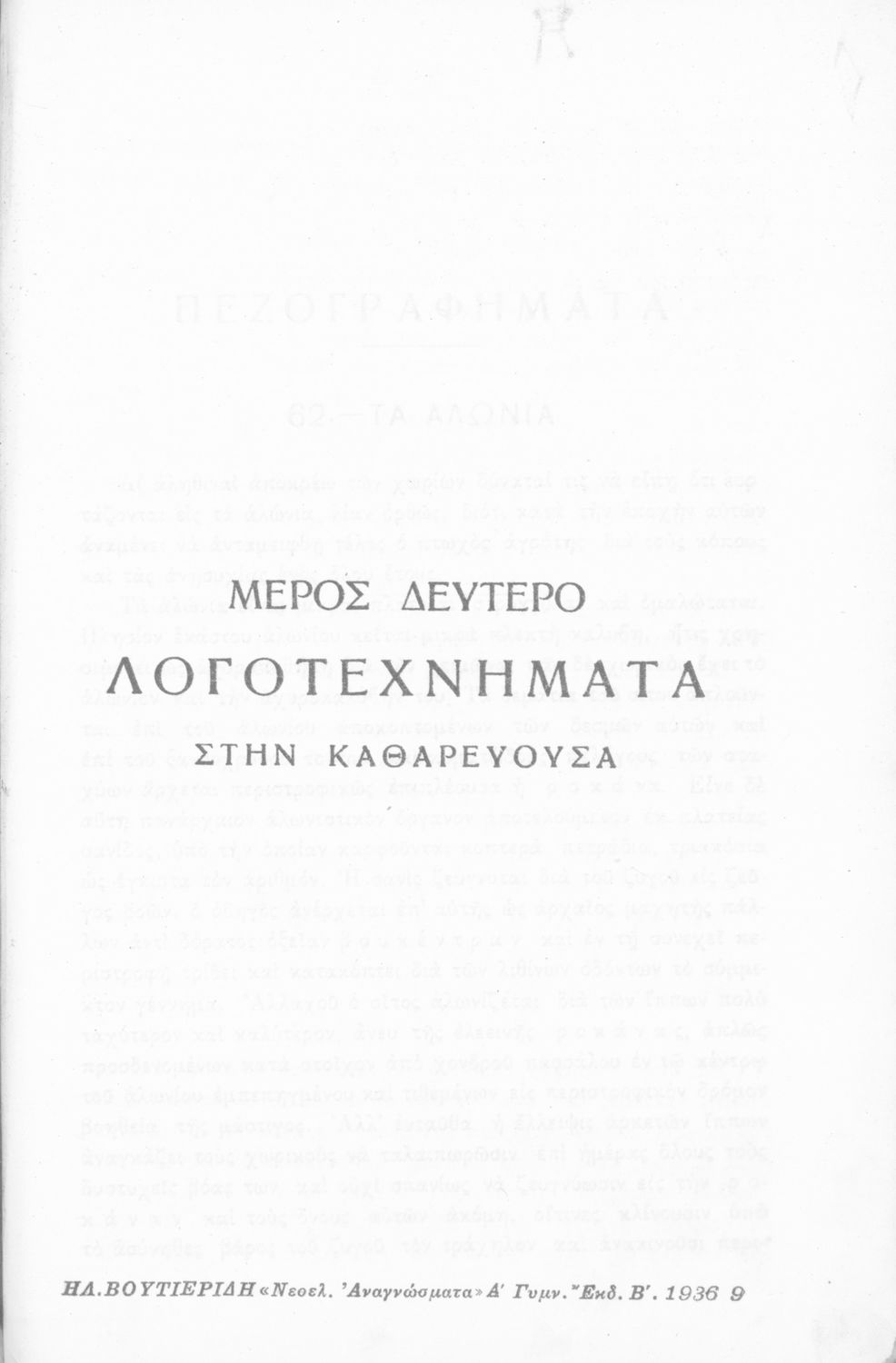 Σχολικό εγχειρίδιο Νέων Ελληνικών Γ΄ Γυμνασίου και Α' Αστικού Σχολείου που περιέχει πεζά και ποιήματα Ελλήνων συγγραφέων εμπνευσμένα από τη θρησκευτική και κοινωνική ζωή, την ελληνική μυθολογία, την αρχαία και