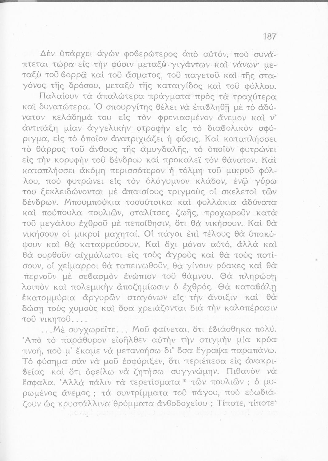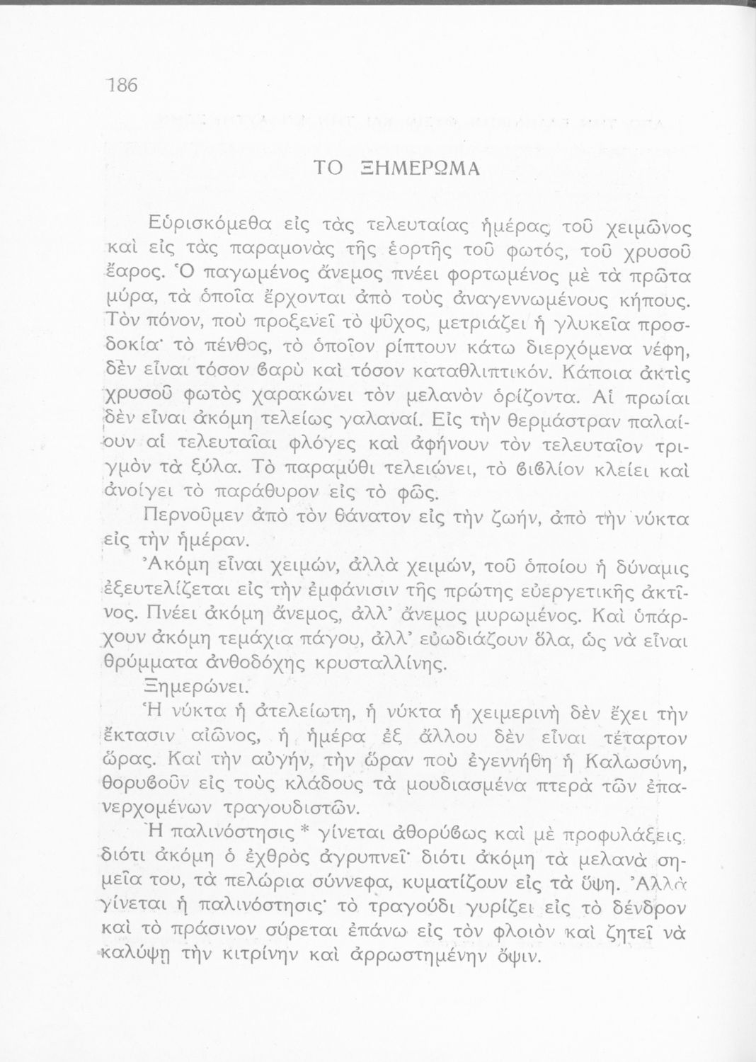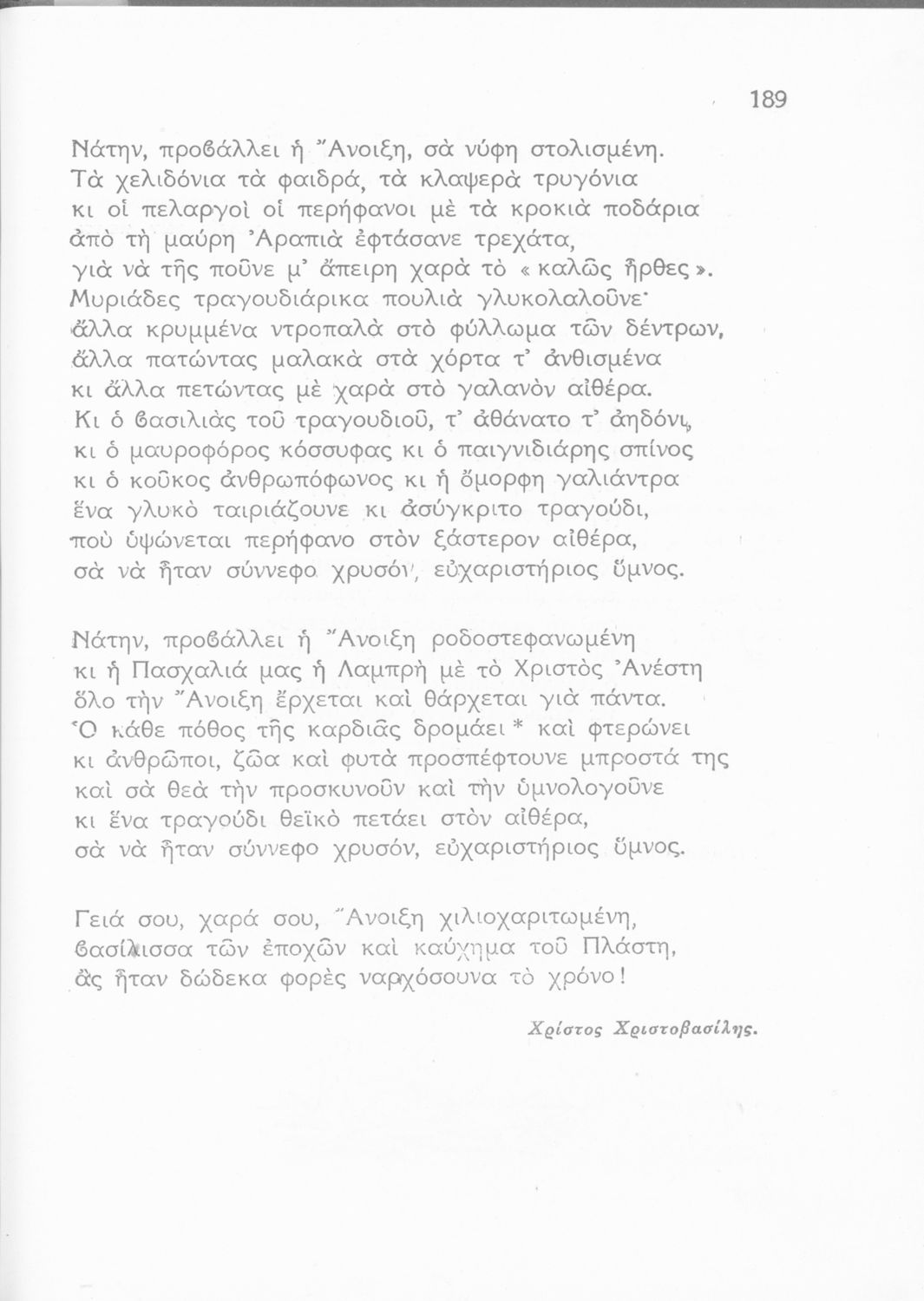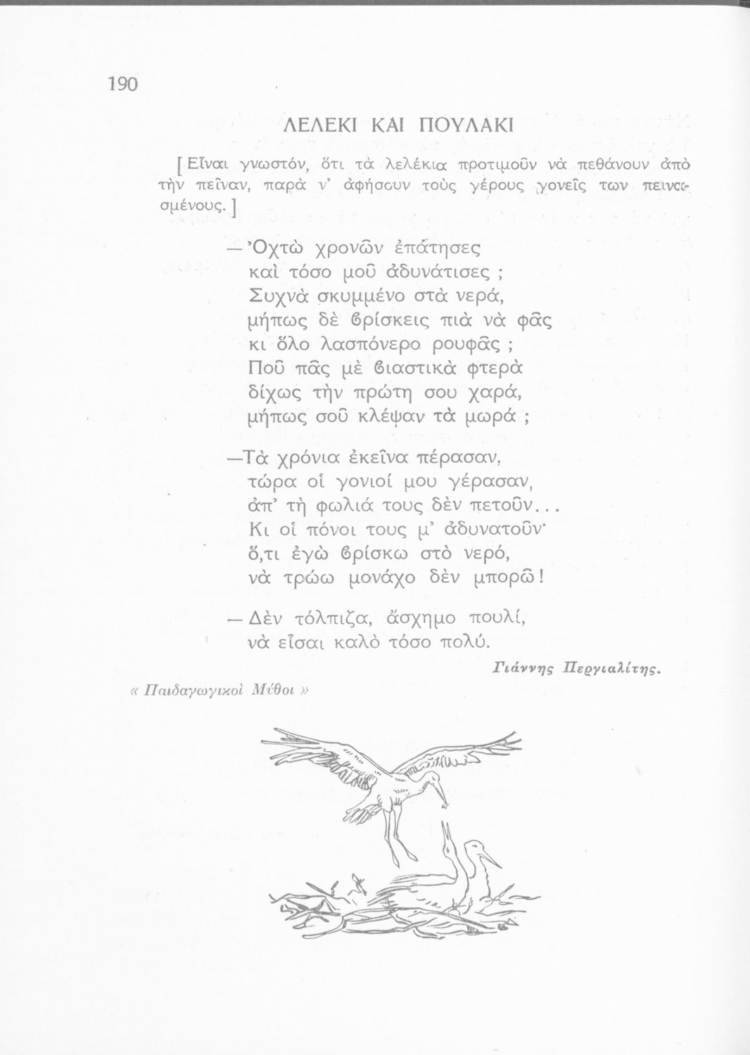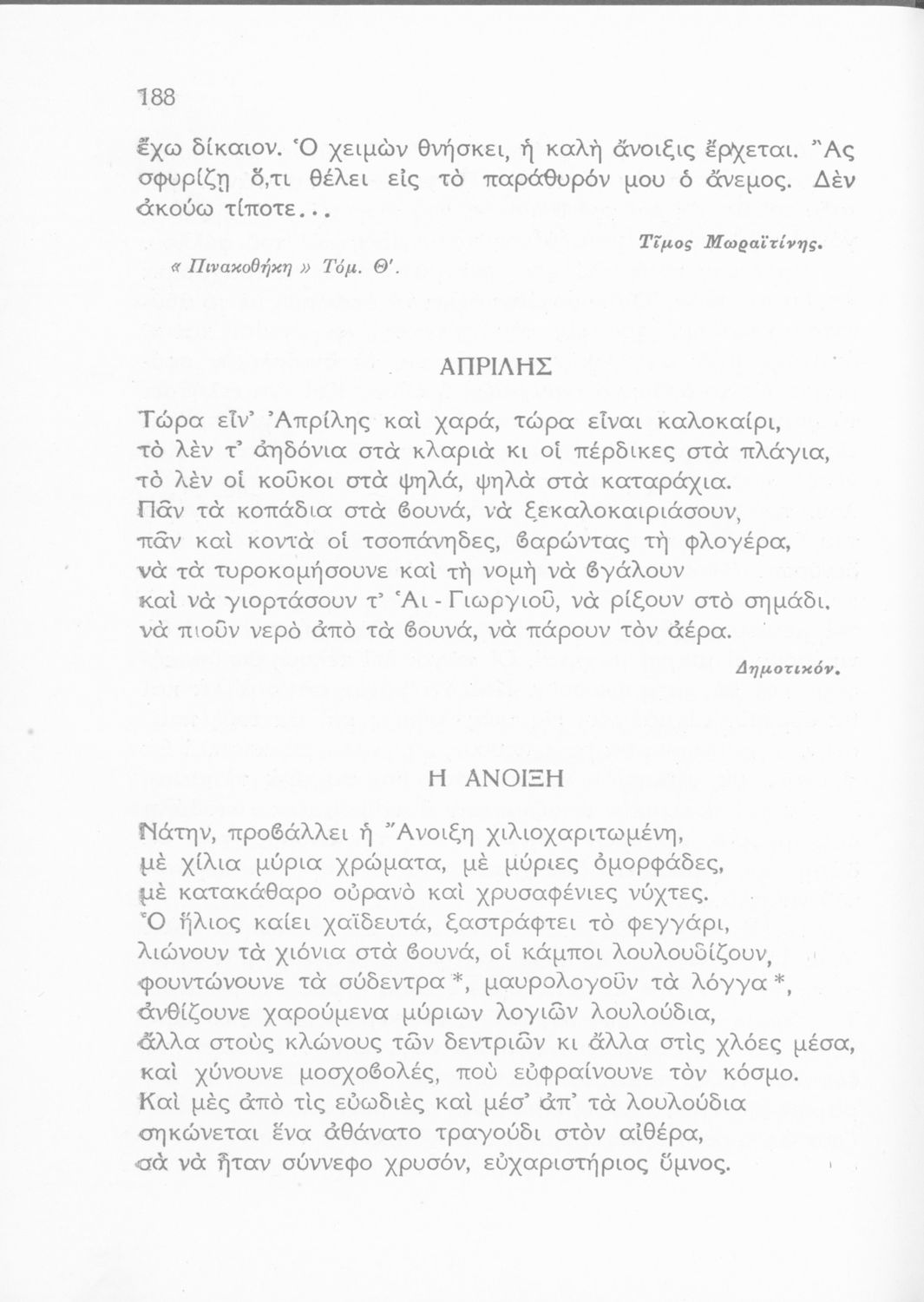 Σχολικό εγχειρίδιο Νέων Ελληνικών Γ΄ Γυμνασίου και Α' Αστικού Σχολείου που περιέχει πεζά και ποιήματα Ελλήνων συγγραφέων εμπνευσμένα από τη θρησκευτική και κοινωνική ζωή, την ελληνική μυθολογία, την αρχαία και σύγχρονη ελληνική ιστορία, και την ελληνική φύση. Περιέχει παράρτημα με βιογραφίες των συγγραφέων και λεξιλόγιο.