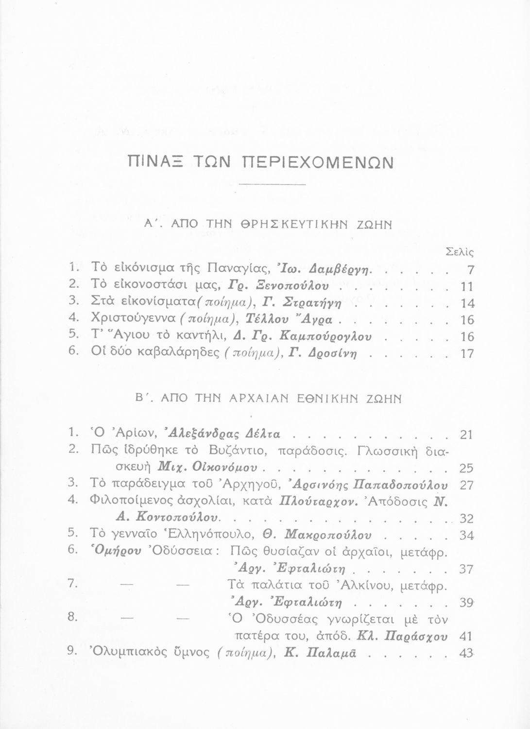Σχολικό εγχειρίδιο Νέων Ελληνικών Γ΄ Γυμνασίου και Α' Αστικού Σχολείου που περιέχει πεζά και ποιήματα Ελλήνων συγγραφέων εμπνευσμένα από τη θρησκευτική και κοινωνική ζωή, την ελληνική μυθολογία, την αρχαία και