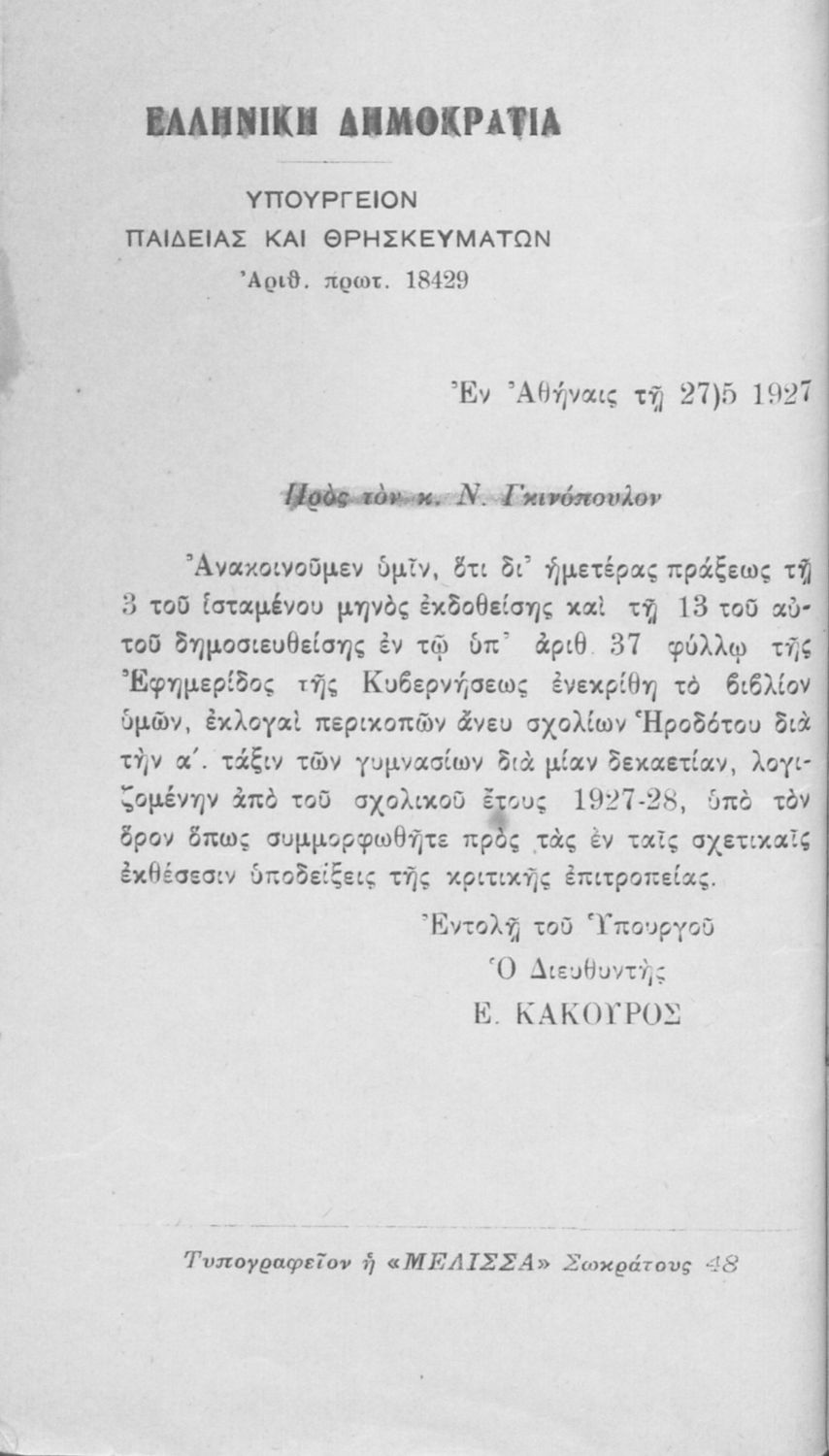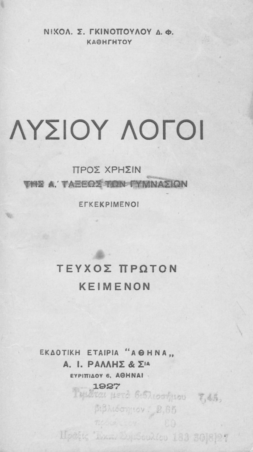 Εκδότης: Α.Ι. Ράλλης και ΣΙΑ Έτος έκδοσης: 1927 Τόπος έκδοσης: Αθήνα Υπουργική απόφαση / Σύμβαση: 18429/27-5-1927 Έτος έγκρισης: 1927 |
