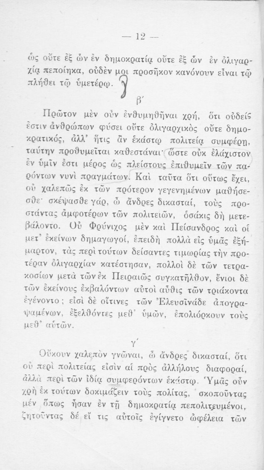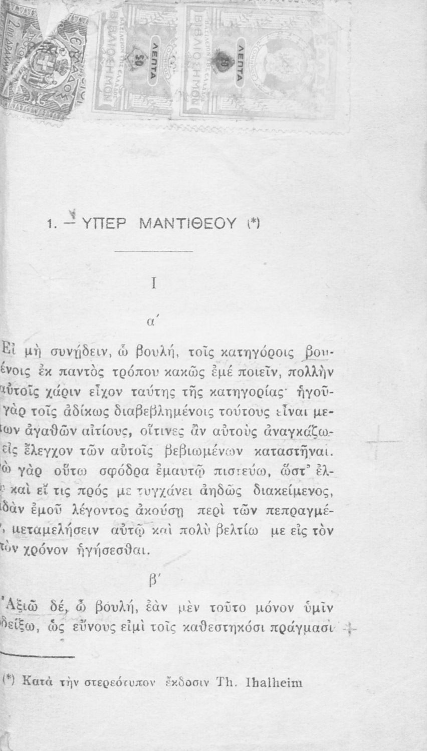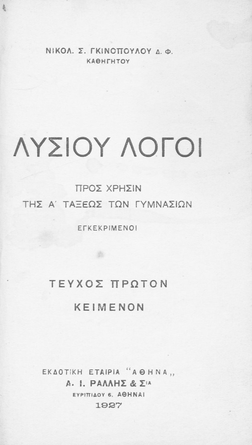Βαθμίδα εκπαίδευσης: Δευτεροβάθμια Τάξη: Α' Γυμνασίου Μάθημα: Αρχαία Ελληνικά Γλώσσα: Καθαρεύουσα Παρουσίαση περιεχομένου: Σχολικό εγχειρίδιο Αρχαίων Ελληνικών Α΄ Γυμνασίου που περιλαμβάνει αποσπάσματα από το έργο του Ηρόδοτου Ιστορία και τους Λόγους του Λυσία Υπέρ Μαντιθέου και Κατά των σιτοπολών. |