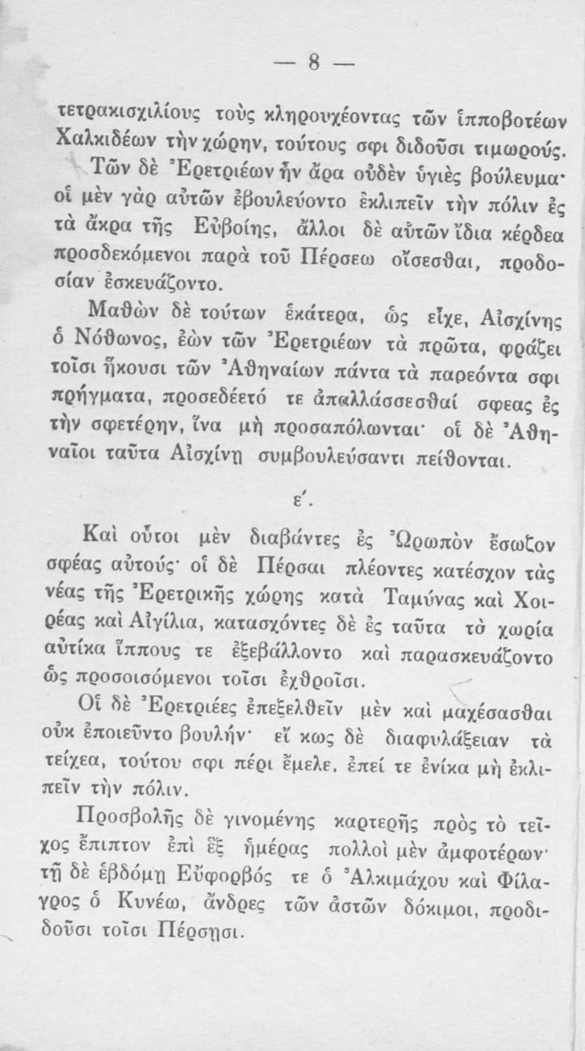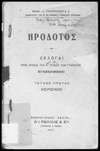 Βαθμίδα εκπαίδευσης: Δευτεροβάθμια Τάξη: Α' Γυμνασίου Μάθημα: Αρχαία Ελληνικά Γλώσσα: Καθαρεύουσα Παρουσίαση περιεχομένου: Σχολικό εγχειρίδιο Αρχαίων Ελληνικών Α΄ Γυμνασίου που περιλαμβάνει αποσπάσματα από το έργο του Ηρόδοτου Ιστορία και τους Λόγους του Λυσία Υπέρ Μαντιθέου και Κατά των σιτοπολών. |